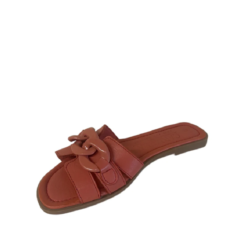 Sandalia de mujer de la marca Carmela. Fabricada en piel de alta calidad. Adorno de cadena al tono. Suela plana de goma antideslizante. Combinará con todos tus looks.
