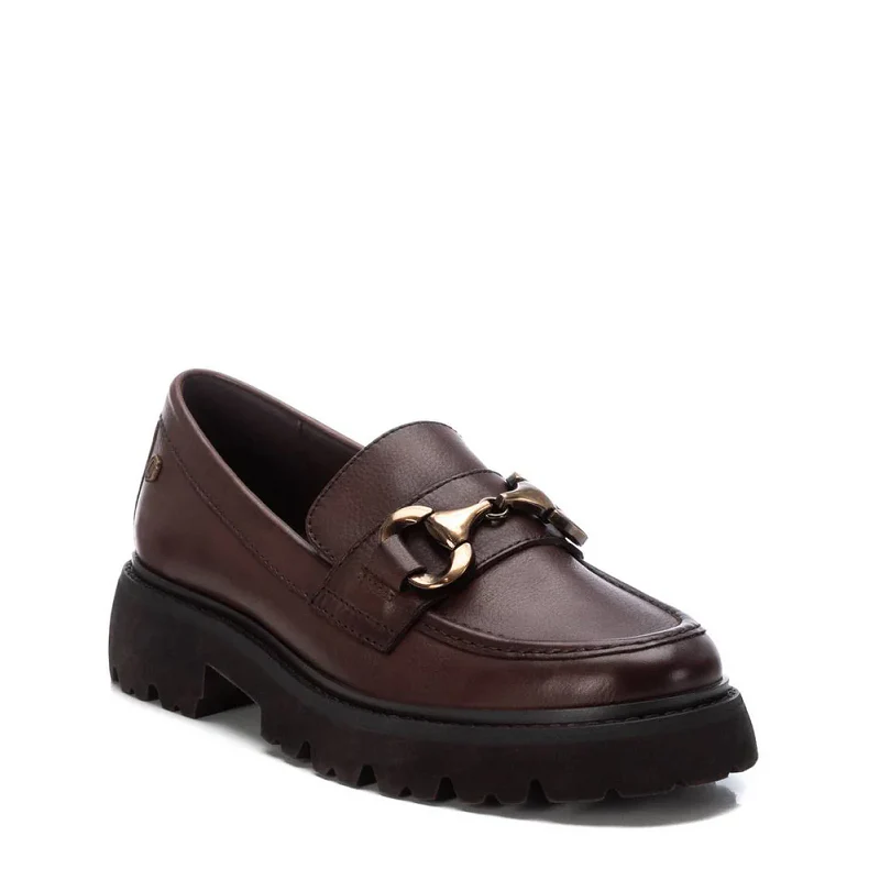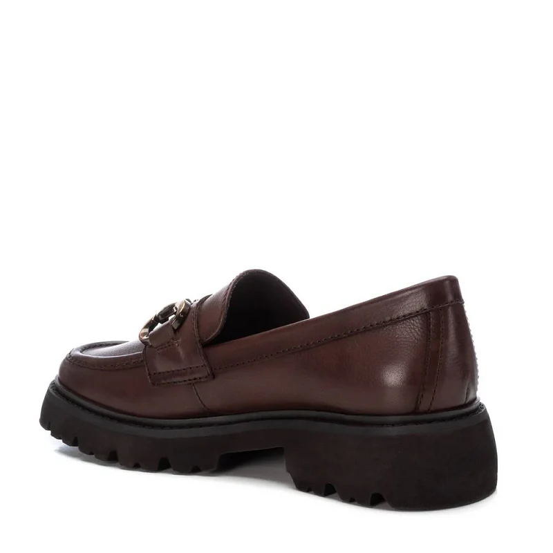 Mocasín de mujer, de la marca Carmela. Fabricado en piel de alta calidad. Detalle antifaz y cadena decorativa en el frente. Suela gruesa y antideslizante y cómoda planta.