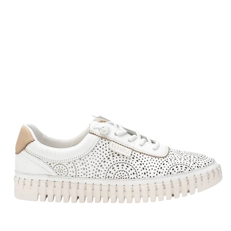 Zapatilla casual para mujer de la marca Carmela, confeccionada en piel de alta calidad que garantiza durabilidad y confort. Su diseño calado aporta frescura y estilo, ideal para la temporada actual. Cuenta con cierre de cordonera ajustable para un ajuste personalizado y suela de goma antideslizante que ofrece seguridad en cada paso. La plantilla extraíble facilita la higiene y permite el uso de plantillas ortopédicas si es necesario. Altura del tacón de 3 cm que combina comodidad y elegancia. Un calzado versátil y sofisticado para el día a día.