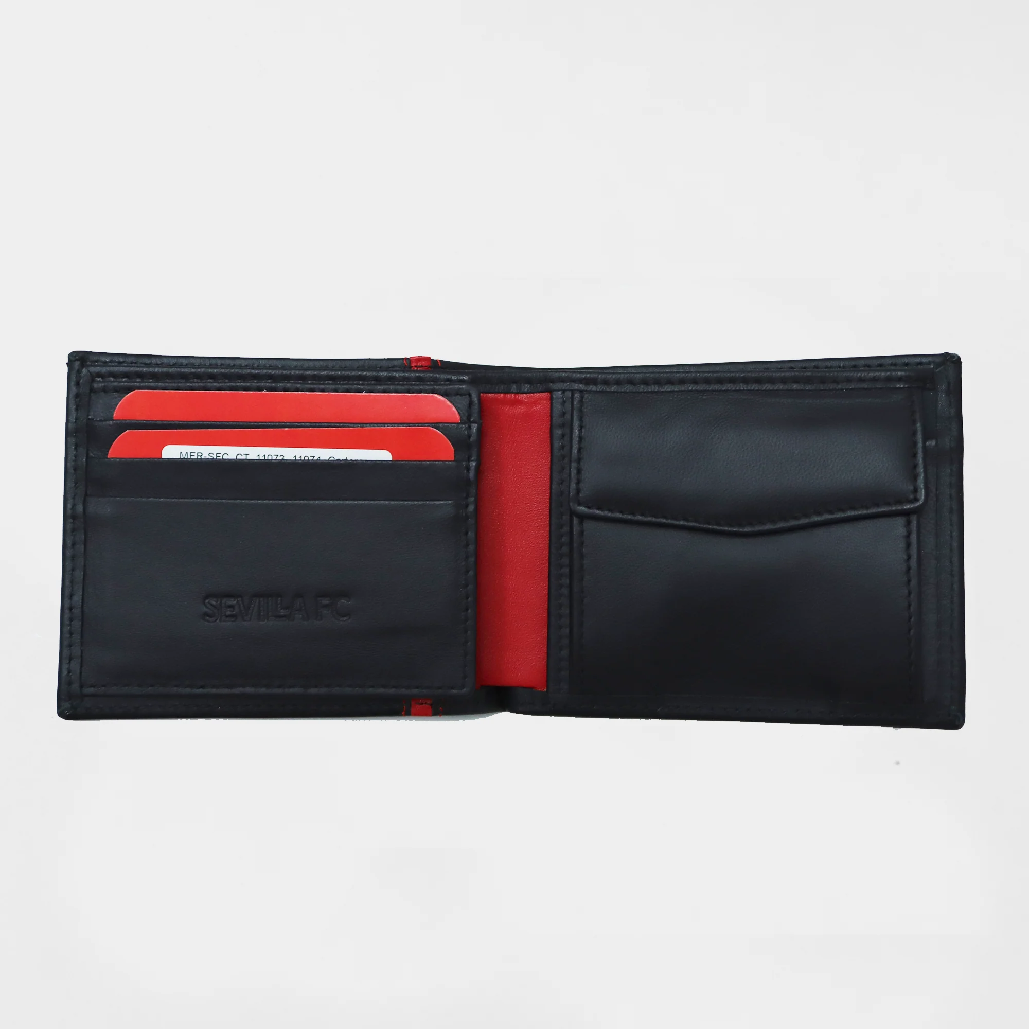 Cartera de estilo americano del Sevilla FC de piel en color negro con detalle en rojo.
