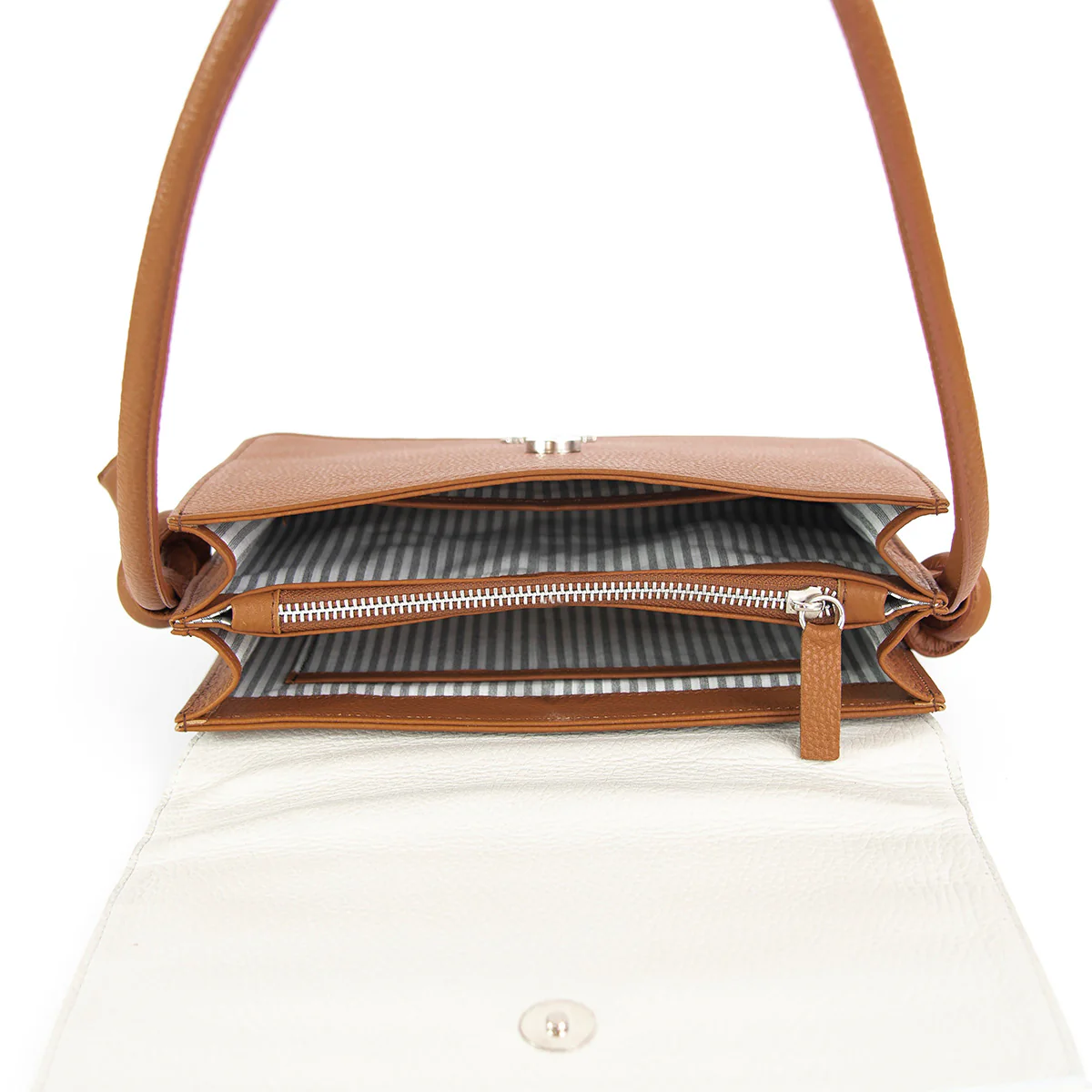 Hecha a mano en 100% cuero, con una solapa con broche imán para un acceso fácil y seguro. El interior de tela y detalles en cuero ofrece dos compartimentos principales: un bolsillo guantero y una división doble fuelle para mayor organización.
