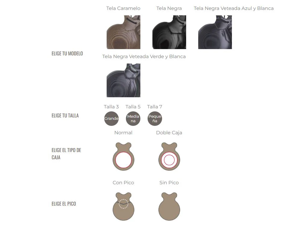 Este modelo de castañuelas se pueden elegir en varios colores: negro, negro con veta azul y blanca, negro con veta verde y blanca y caramelo. Todos los modelos se pueden elegir con pico o sin pico en la parte superior de la caja de resonancia, modificación que no afecta al sonido. Para personalizar más tus castañuelas también puedes elegir entre gomillas o cordones.