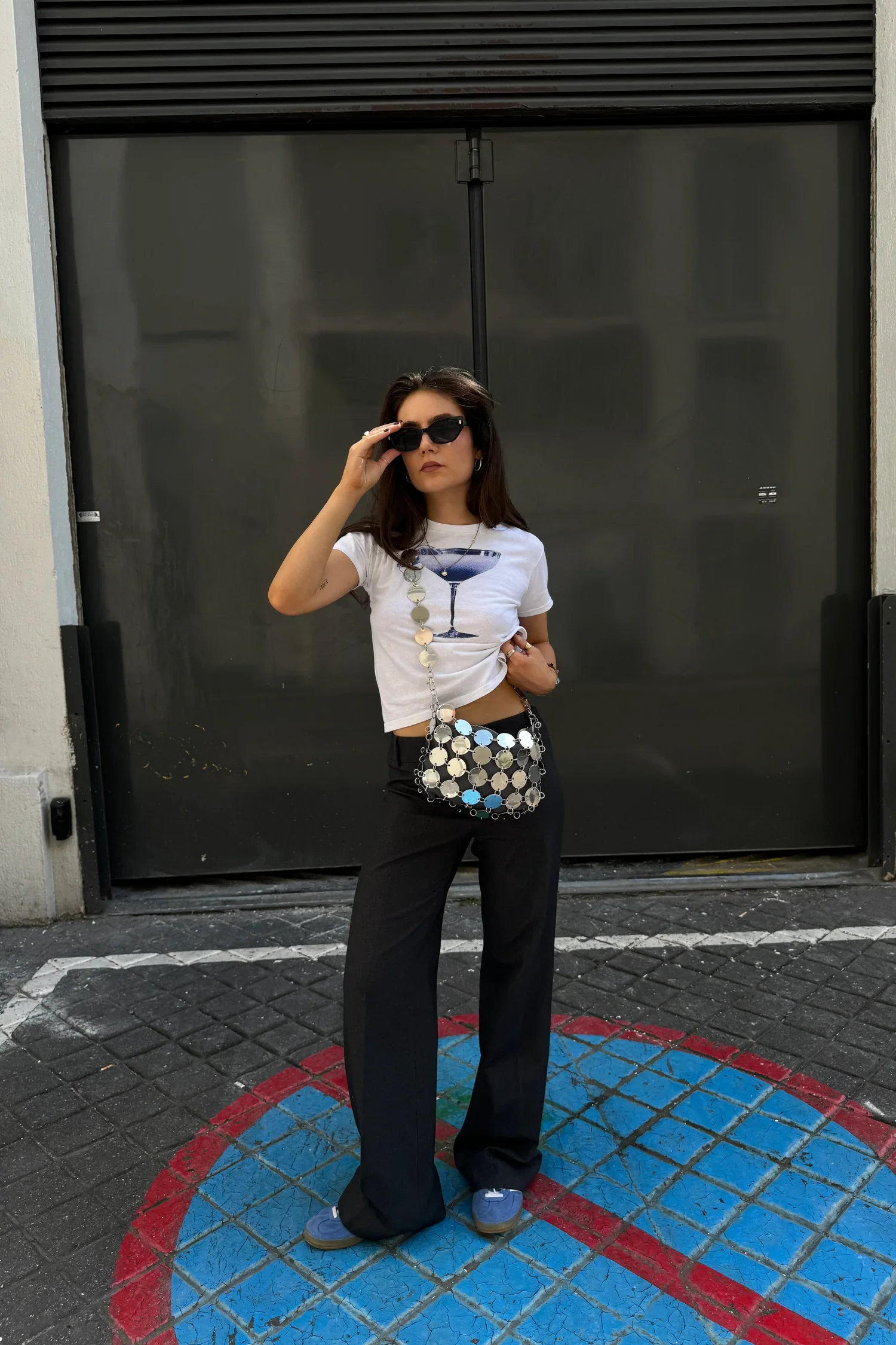 Bolso de chapas de acero inoxidable con una funda gris de loneta intercambiable y un asa de chapas de acero.