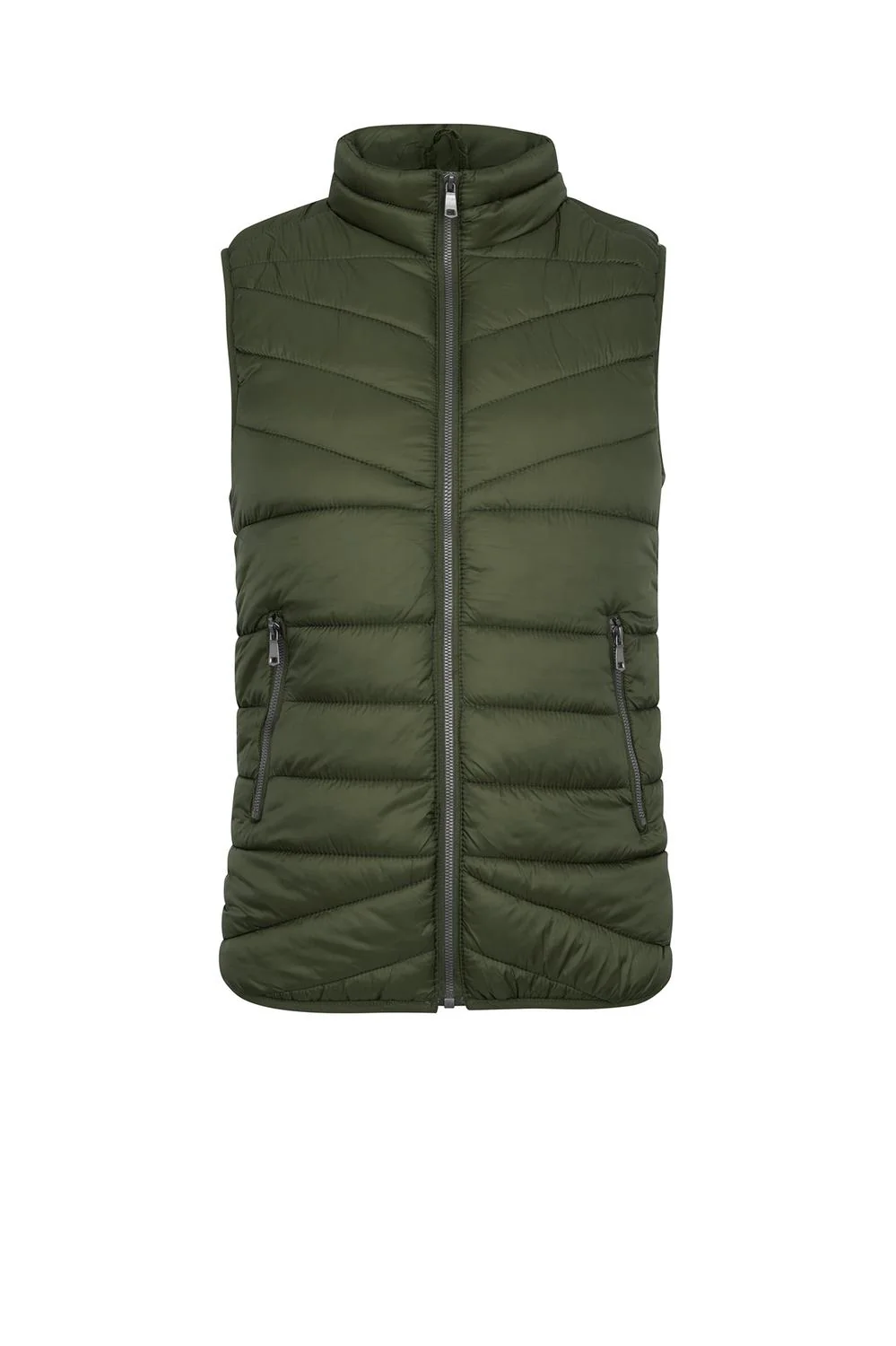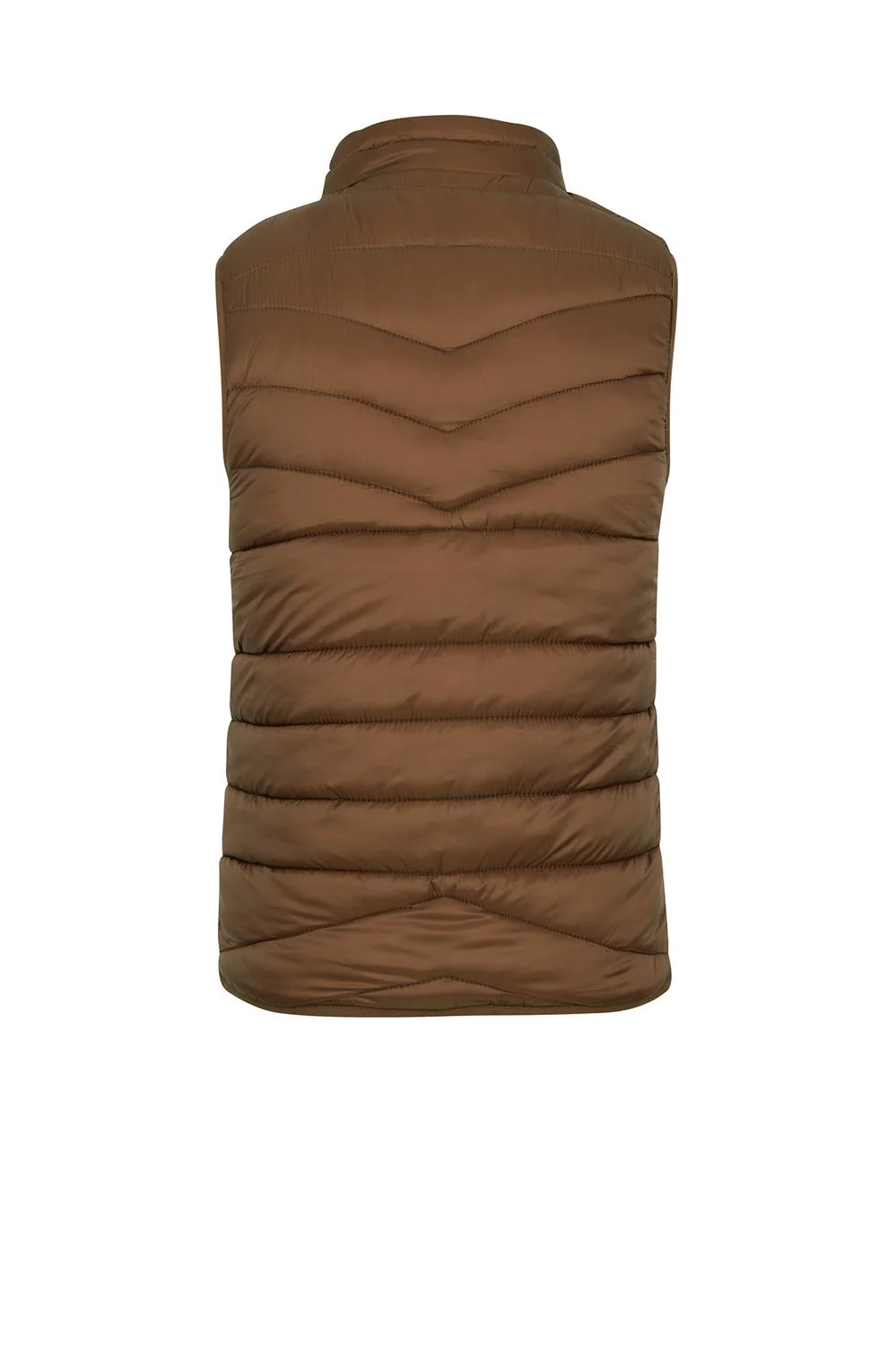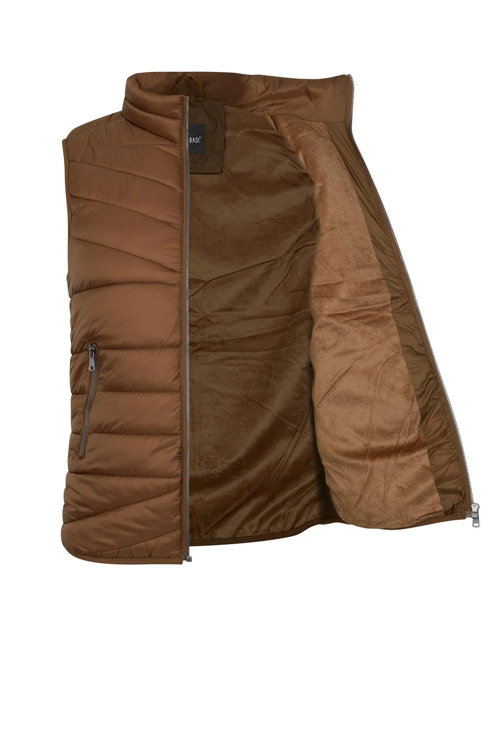 - Chaleco capitonado con cuello, cierre frontal, bolsillos laterales, rib en costados e interior afelpado.