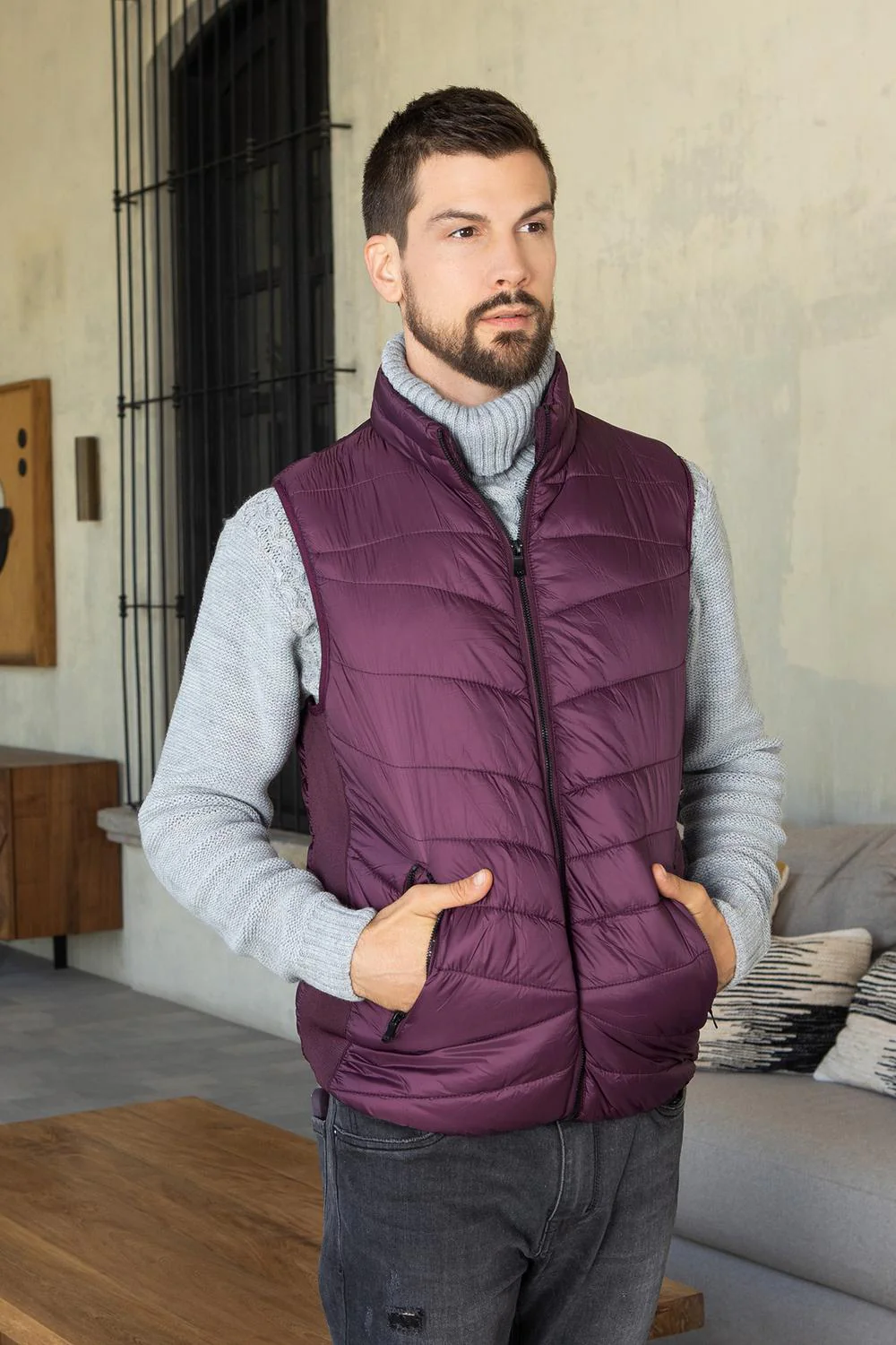 Chaleco capitonado con cuello, cierre frontal, bolsillos laterales, rib en costados e interior afelpado. 25-1216