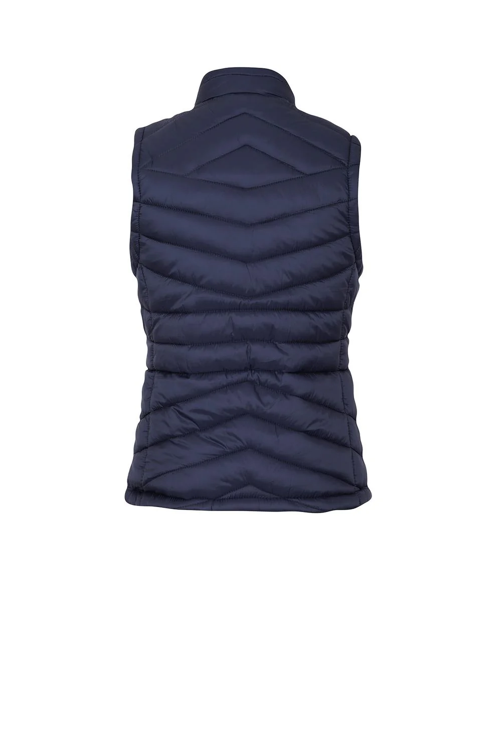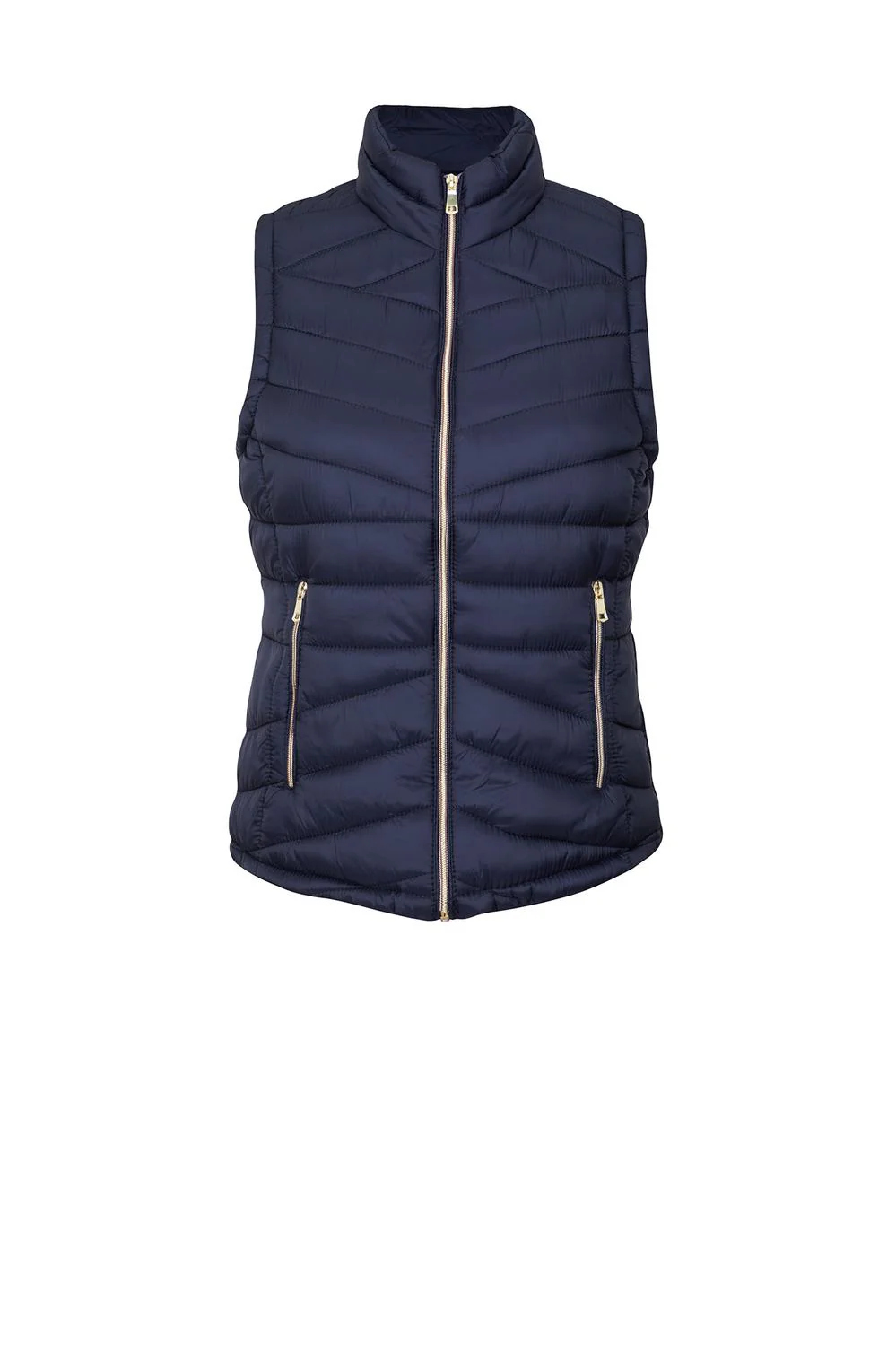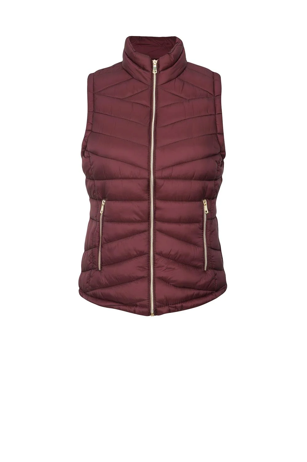 - Chaleco capitonado con cuello alto, cierre frontal, bolsillos laterales e interior afelpado.