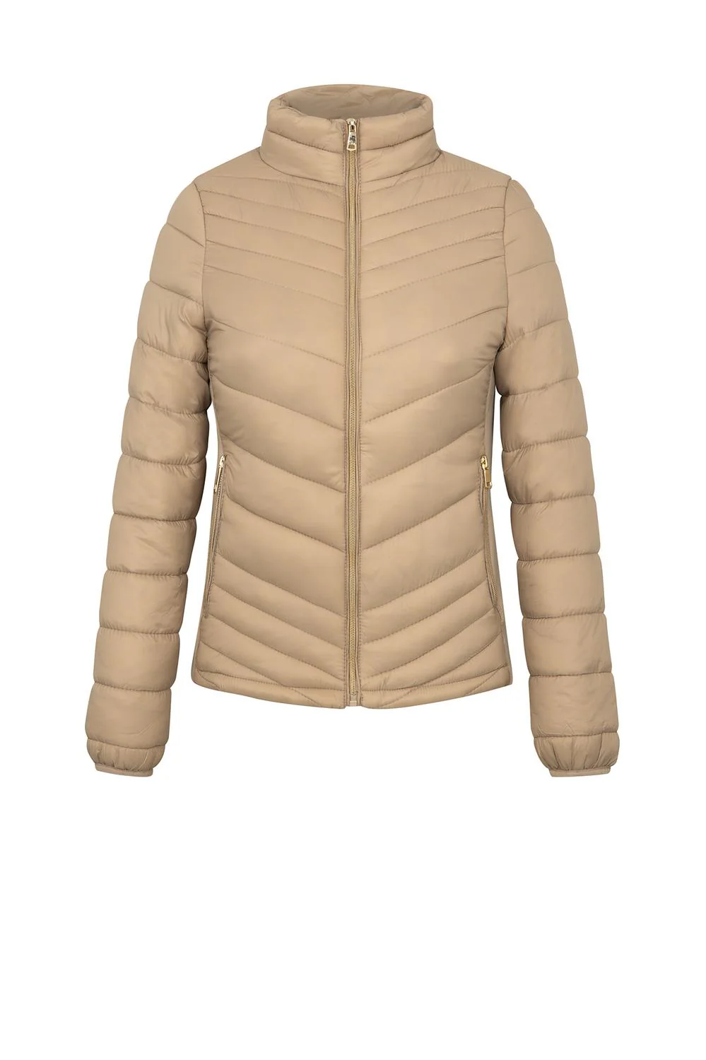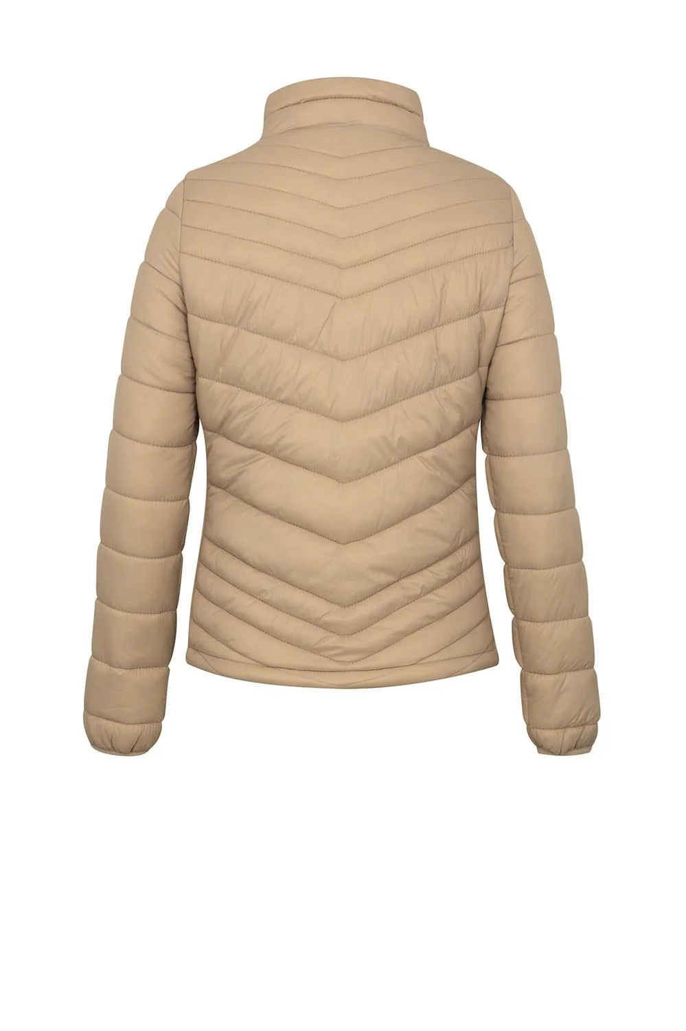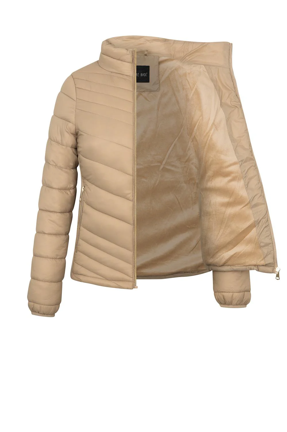 - Chamarra capitonada con cuello alto, cierre frontal, bolsillos laterales, rib en costados, mangas largas e interior afelpado.