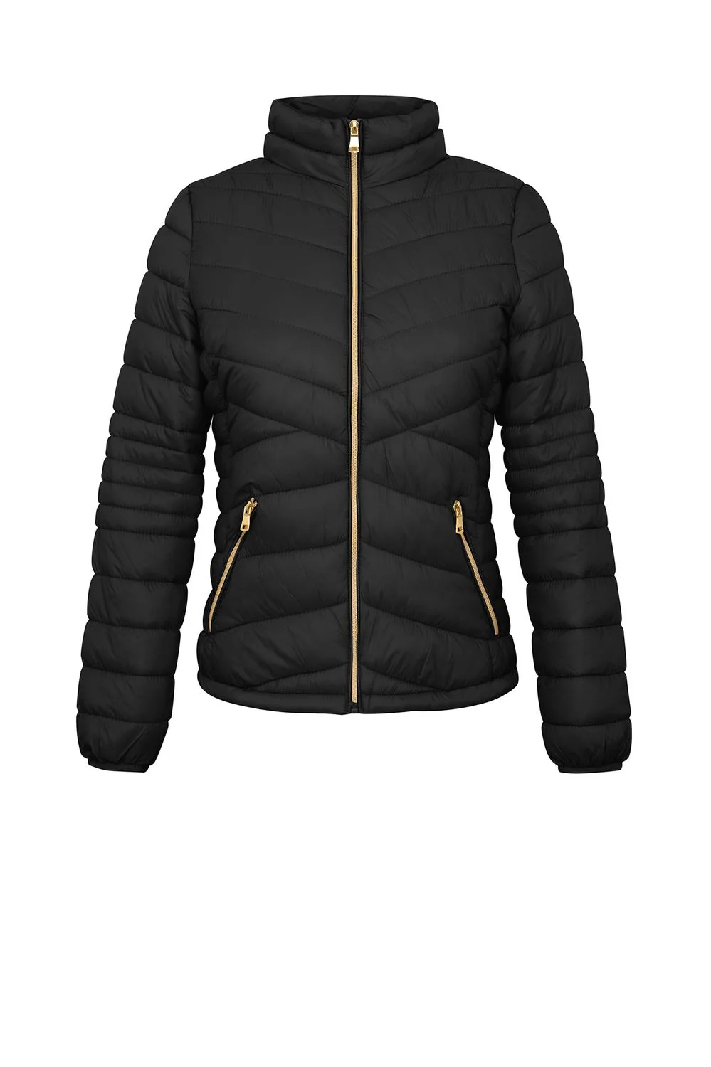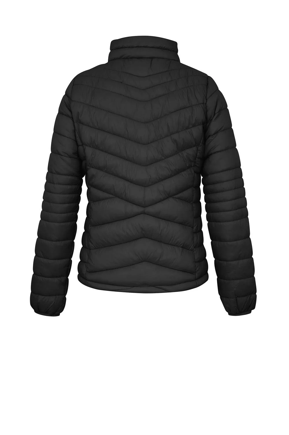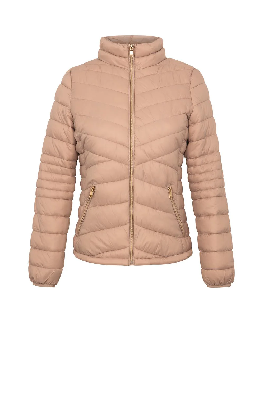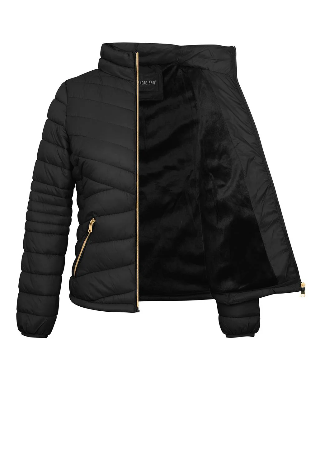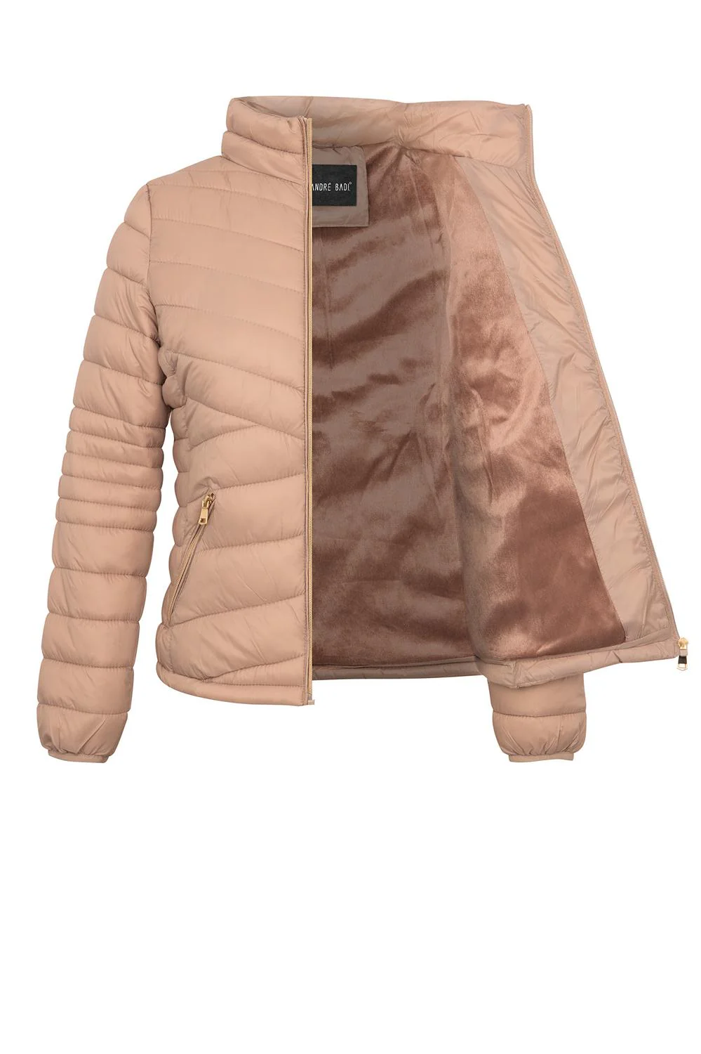- Chamarra capitonada con cuello alto, cierre frontal, bolsillos laterales, mangas largas e interior afelpado.