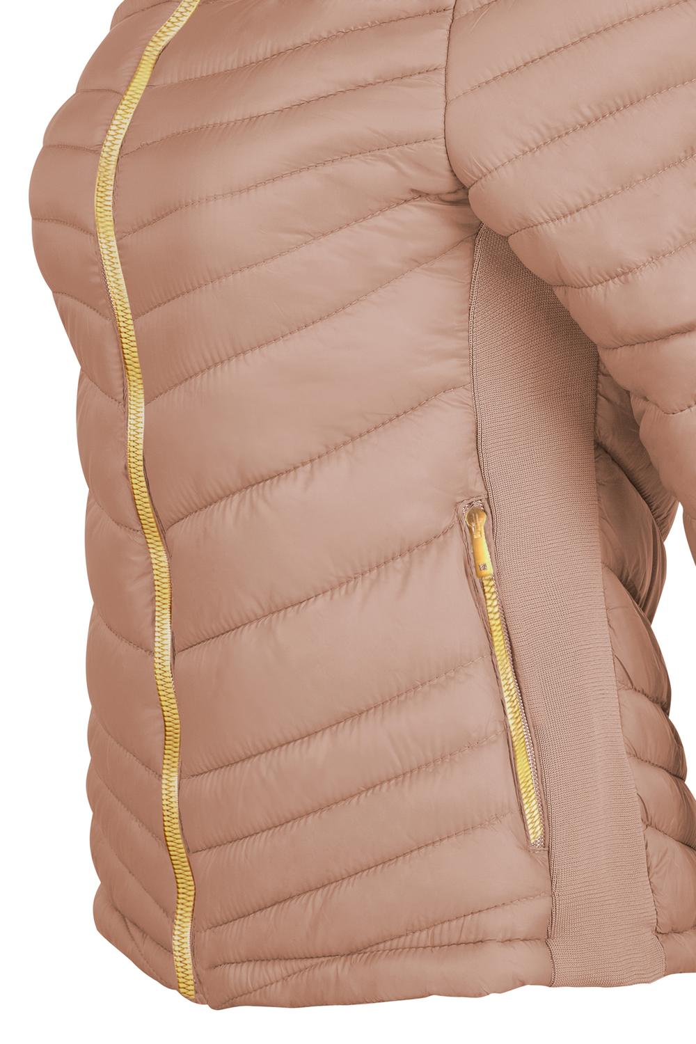 - Chamarra capitonada con cuello, cierres frontales, bolsillos laterales, rib en costados, mangas largas e interior afelpado.
