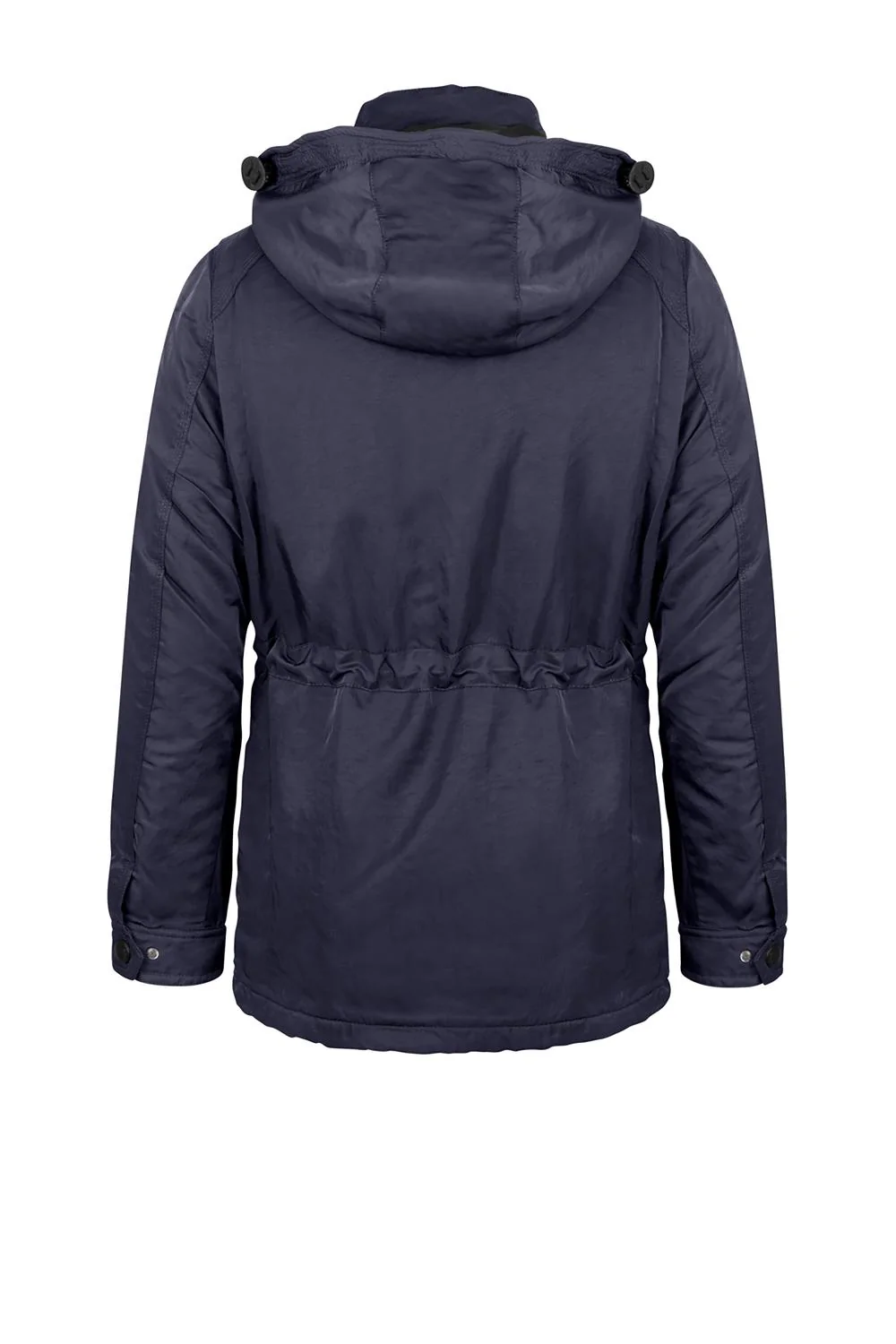 Chamarra con capucha ajustable y desmontable, dos bolsillos frontales, dos interiores, jareta con cordón ajustable, cierre y botones snap al frente. prod. # 01-1045