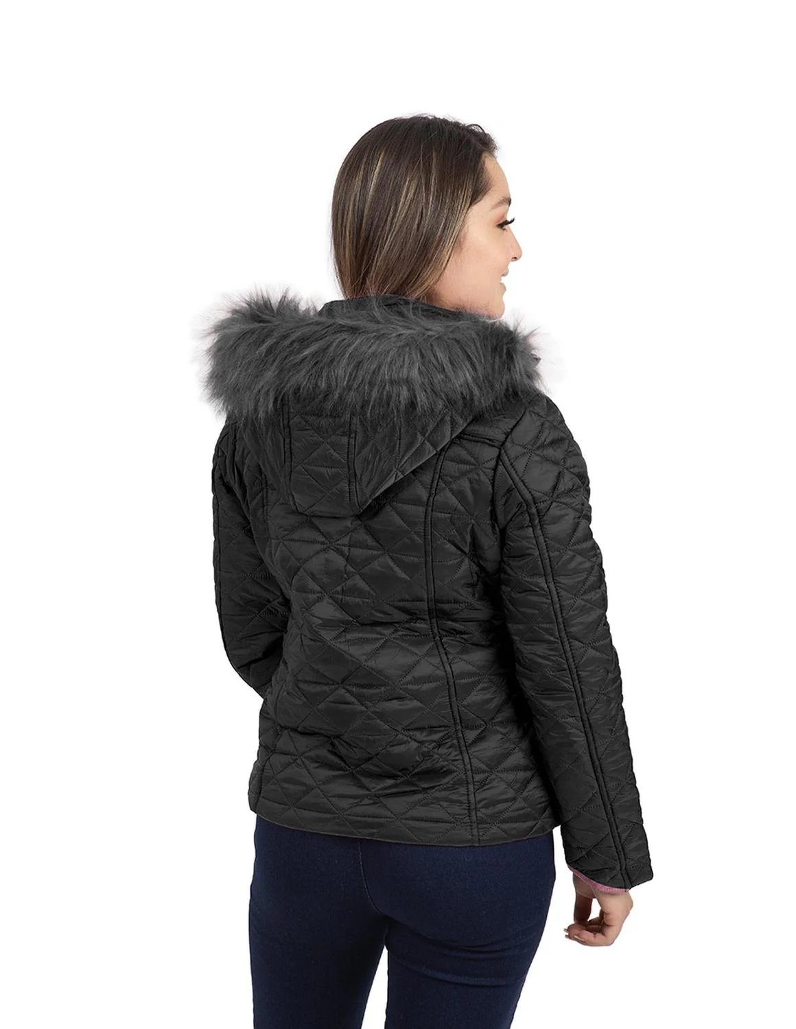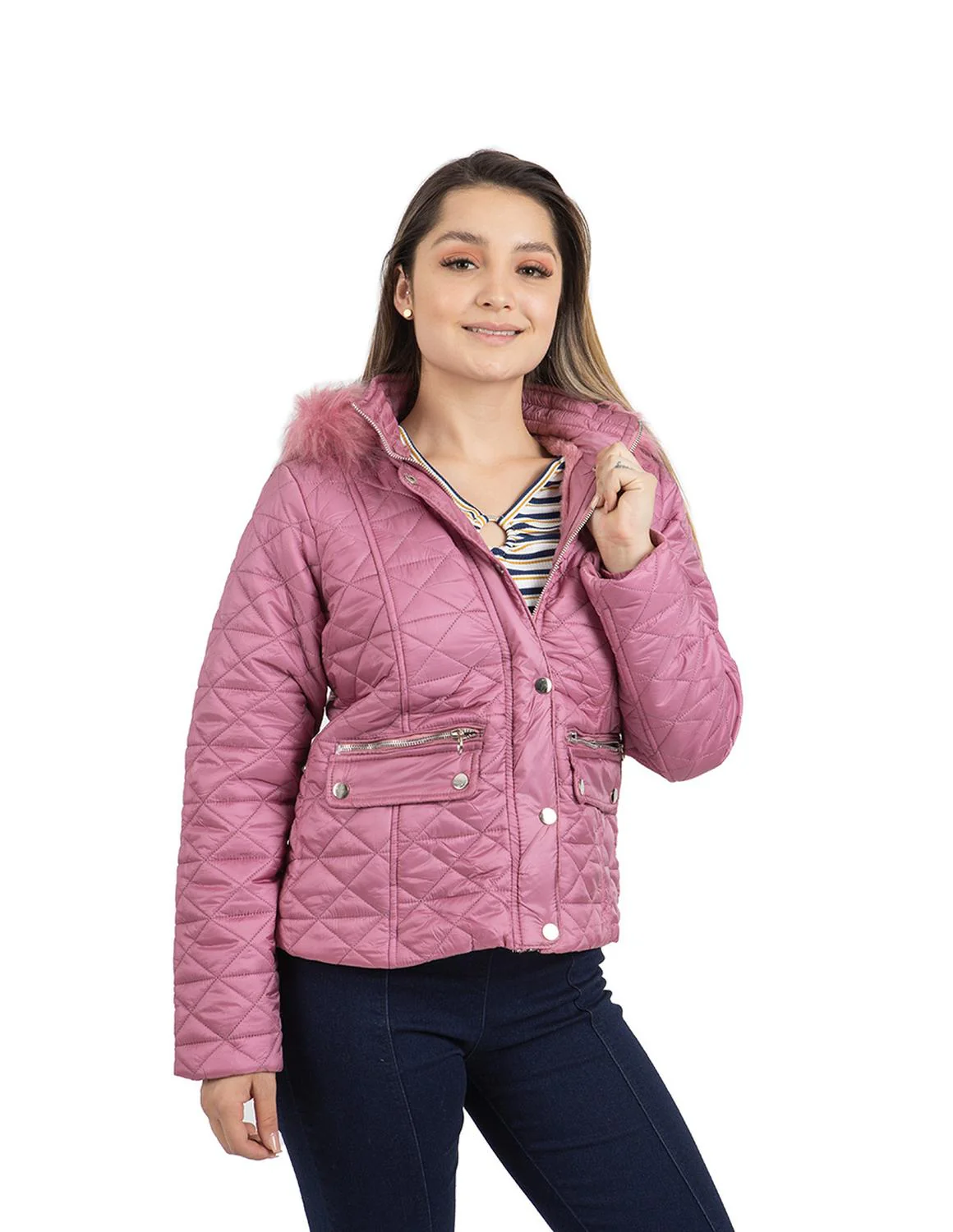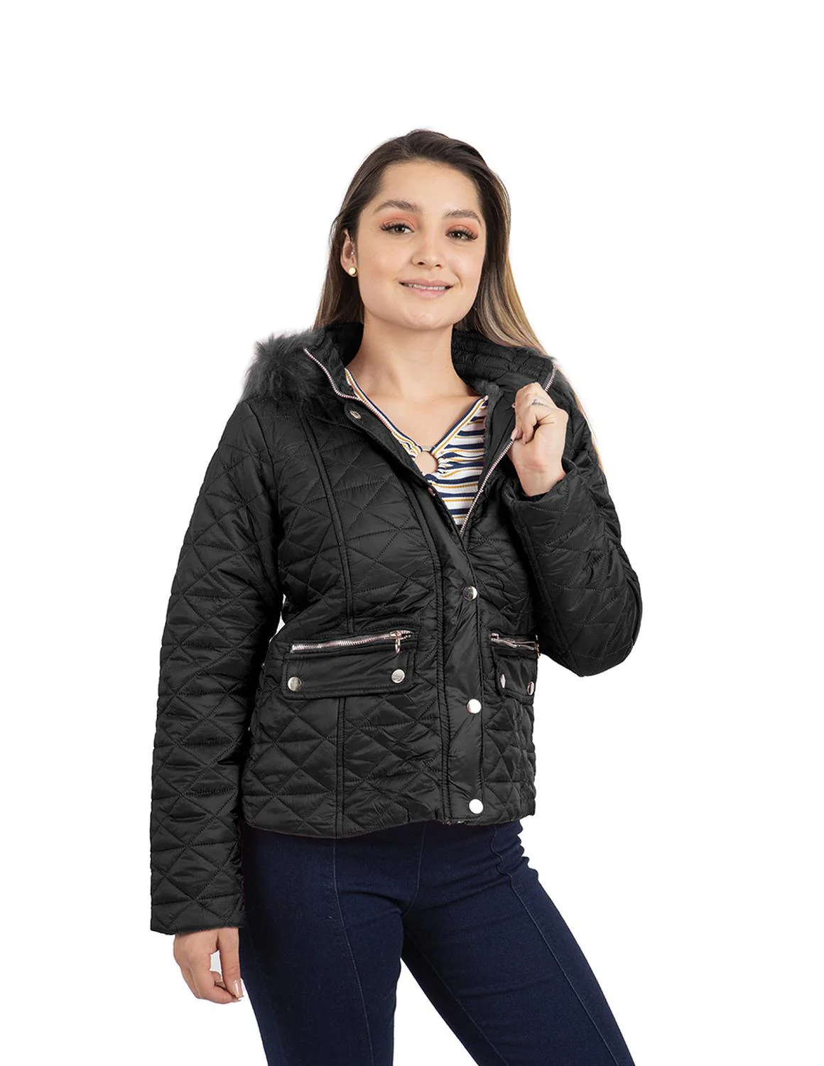 - Chamarra capitonada, capucha desmontable con peluche, carteras decorativas, botonadura metálica, cierres frontales, bolsillos laterales e interior afelpado.