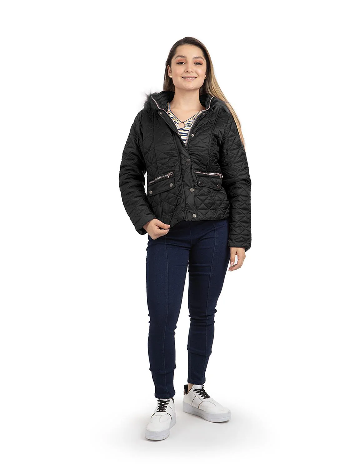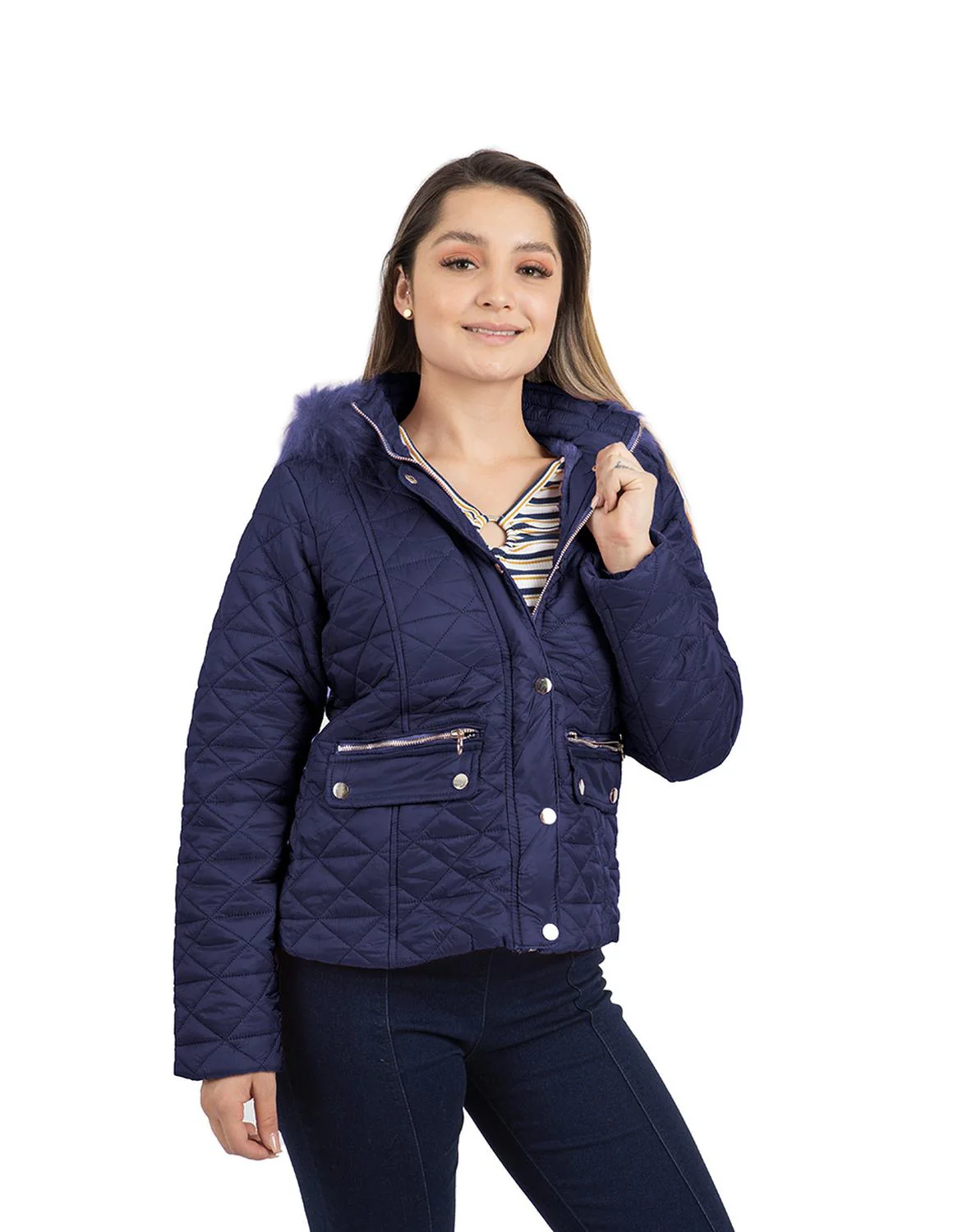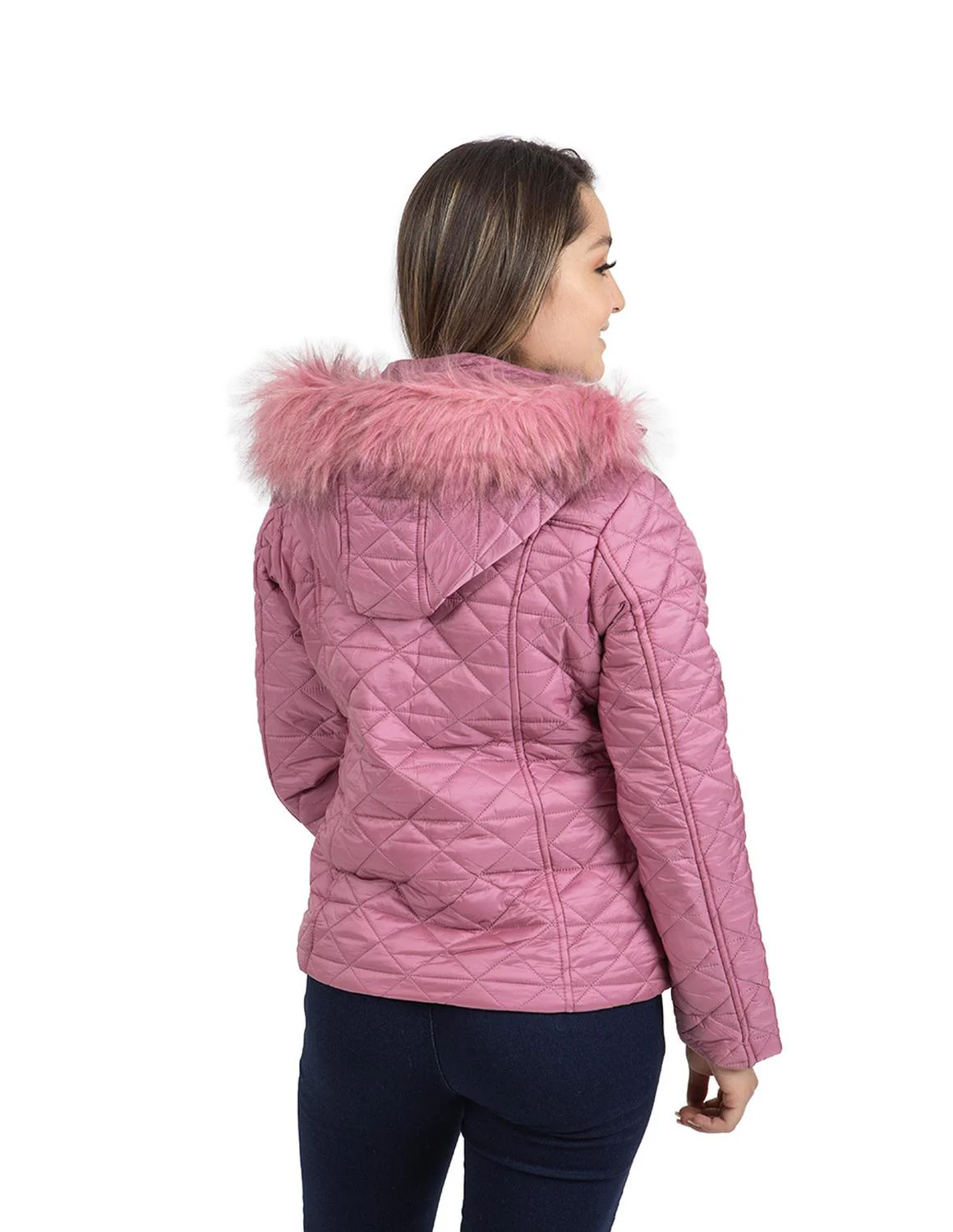 - Chamarra capitonada, capucha desmontable con peluche, carteras decorativas, botonadura metálica, cierres frontales, bolsillos laterales e interior afelpado.
