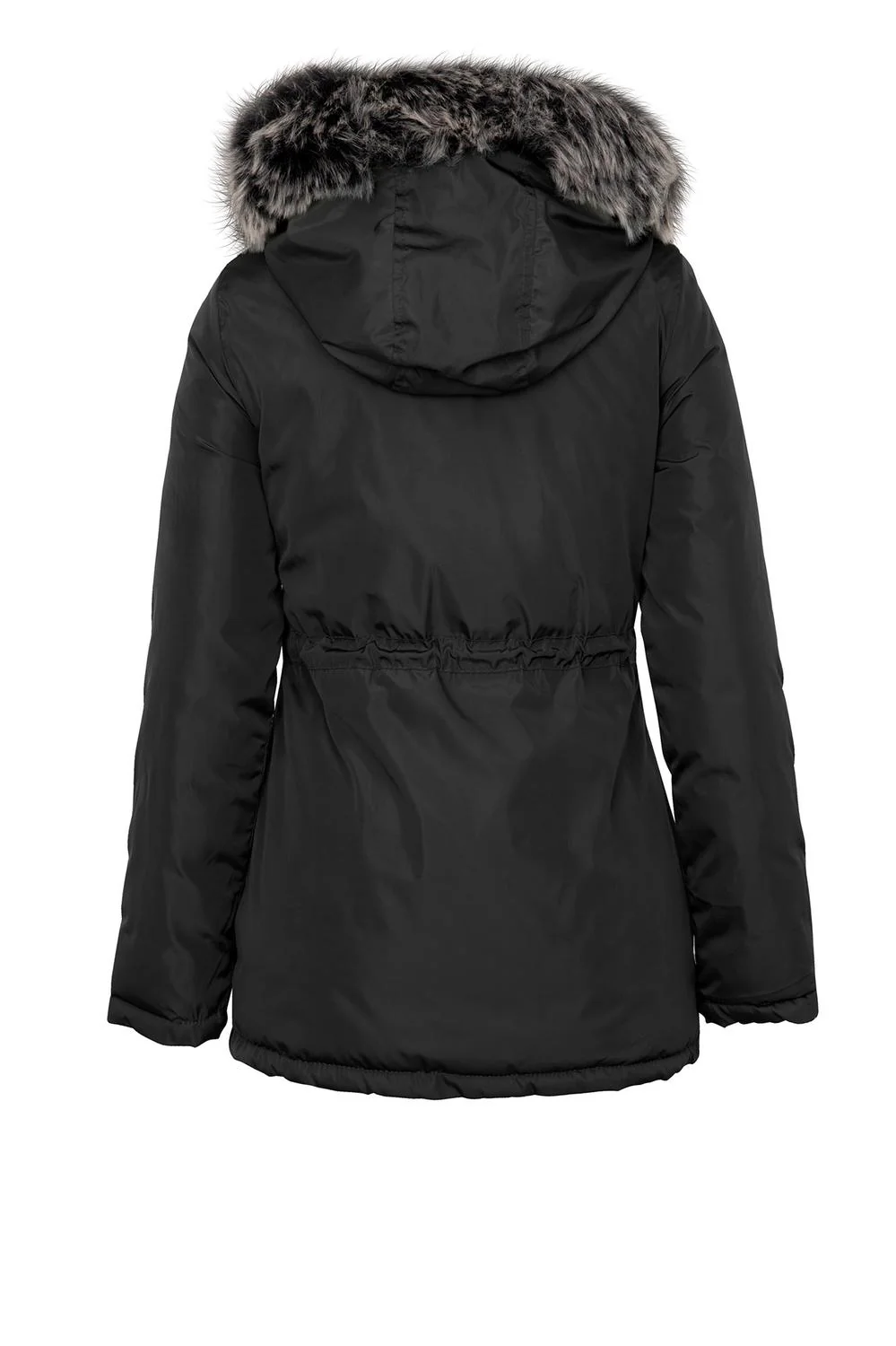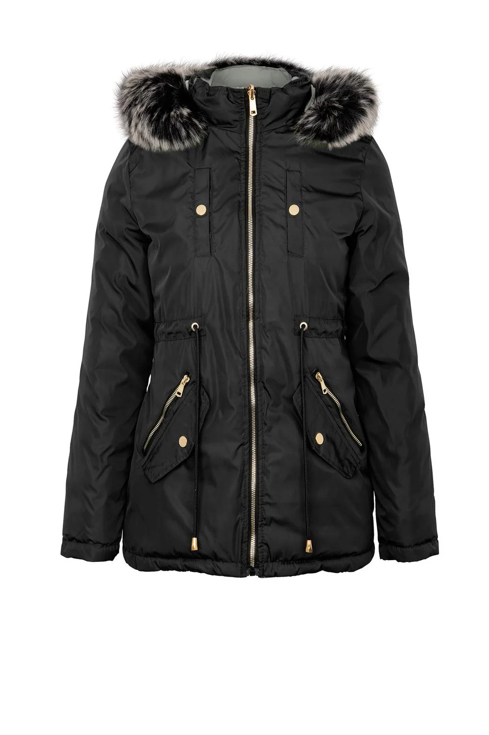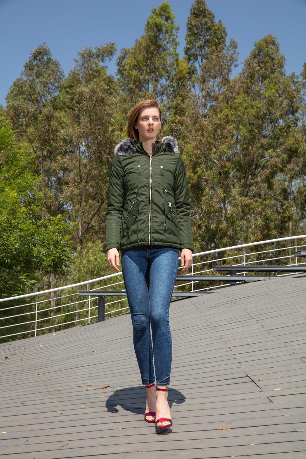 - Chamarra doble vista con capucha desmontable, pelo sintético, cuello alto, cierre frontal, cuatro bolsillos funcionales, carteras decorativas, jareta ajustable en cintura y mangas largas.