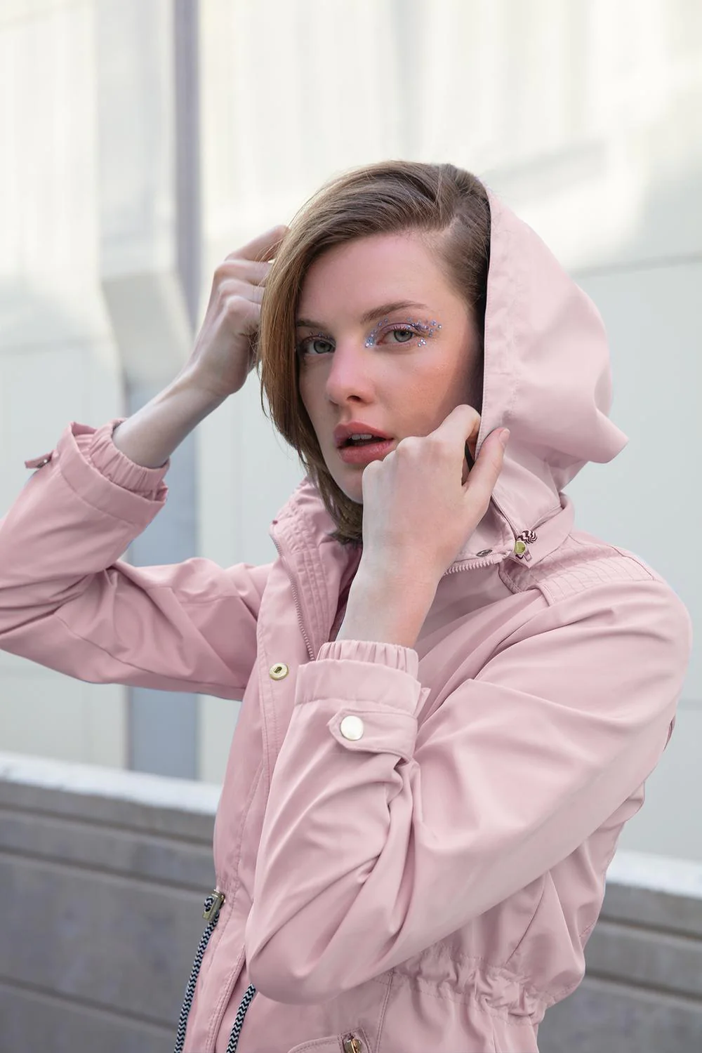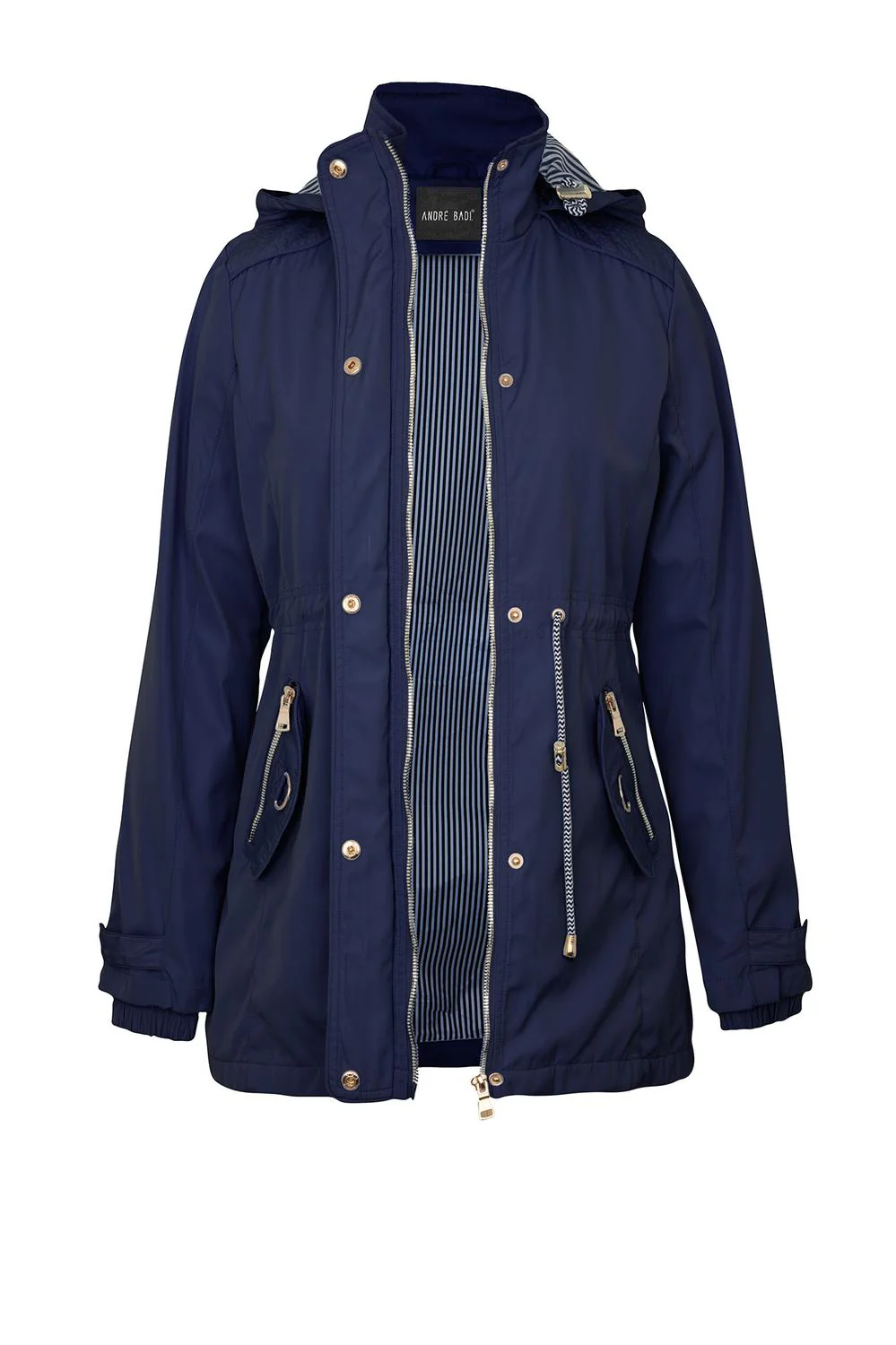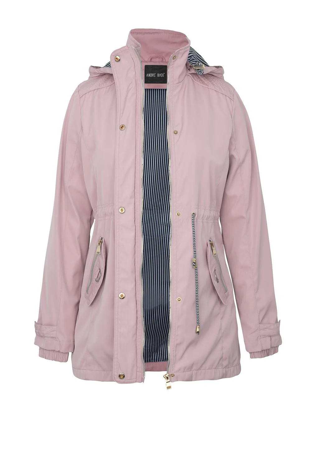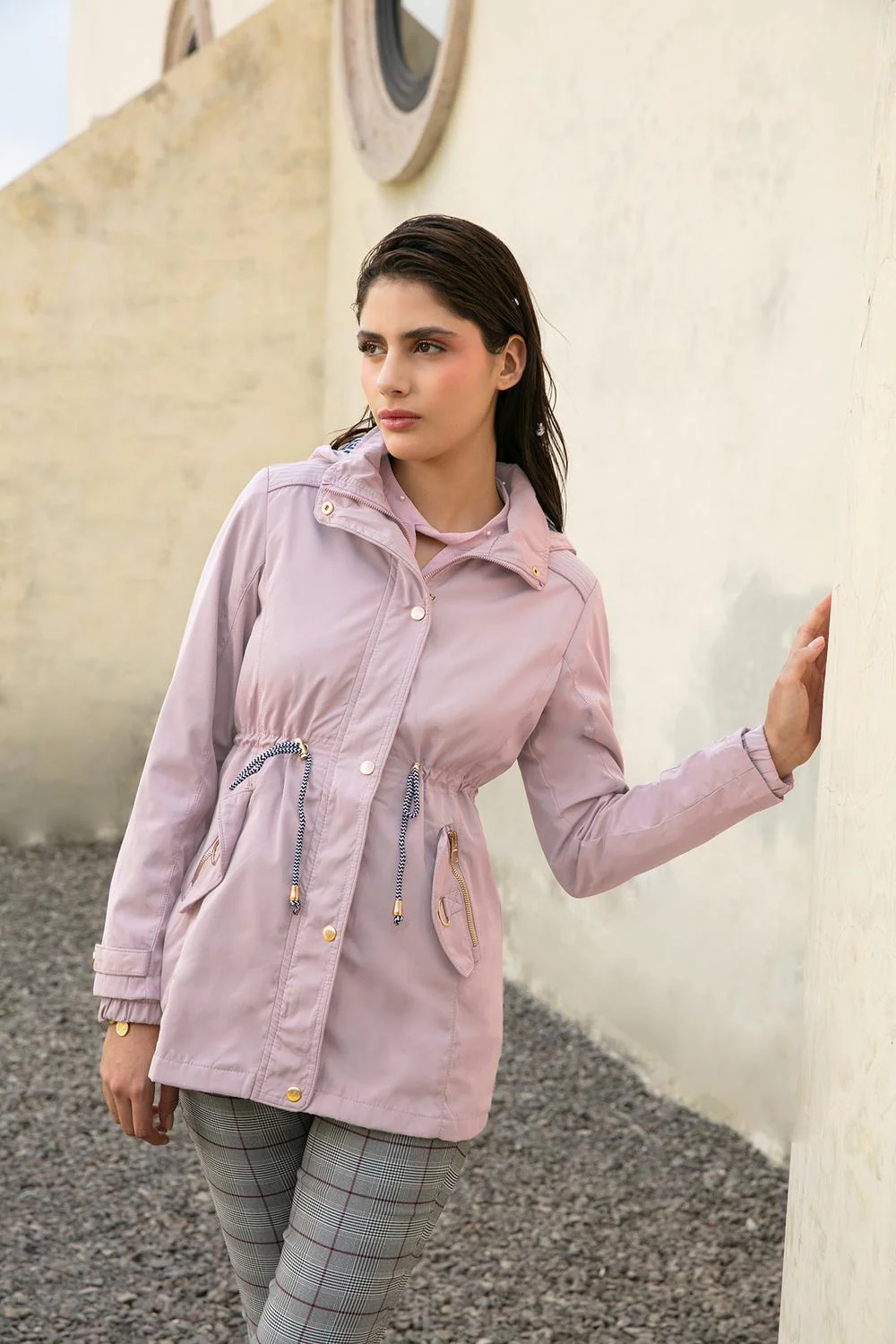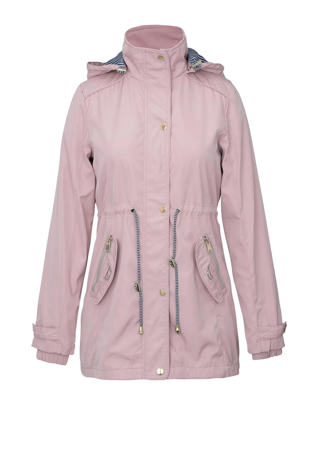 • Chamarra estilo rompevientos con capucha desmontable, cuello alto, aletilla frontal, cierre central, bolsillos funcionales, jareta ajustable en cintura, mangas largas, elástico en puños y forro con estampado decorativo.