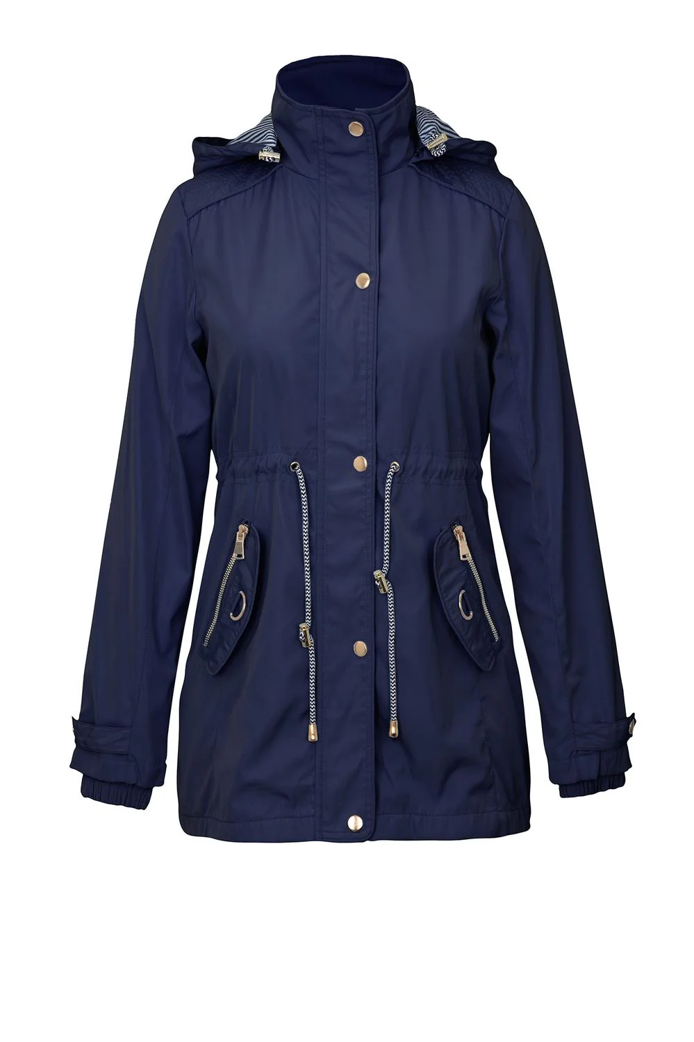 Chamarra estilo rompevientos con capucha desmontable, cuello alto, aletilla frontal, cierre central, bolsillos funcionales, jareta ajustable en cintura, mangas largas, elástico en puños y forro con estampado decorativo. 01-1364