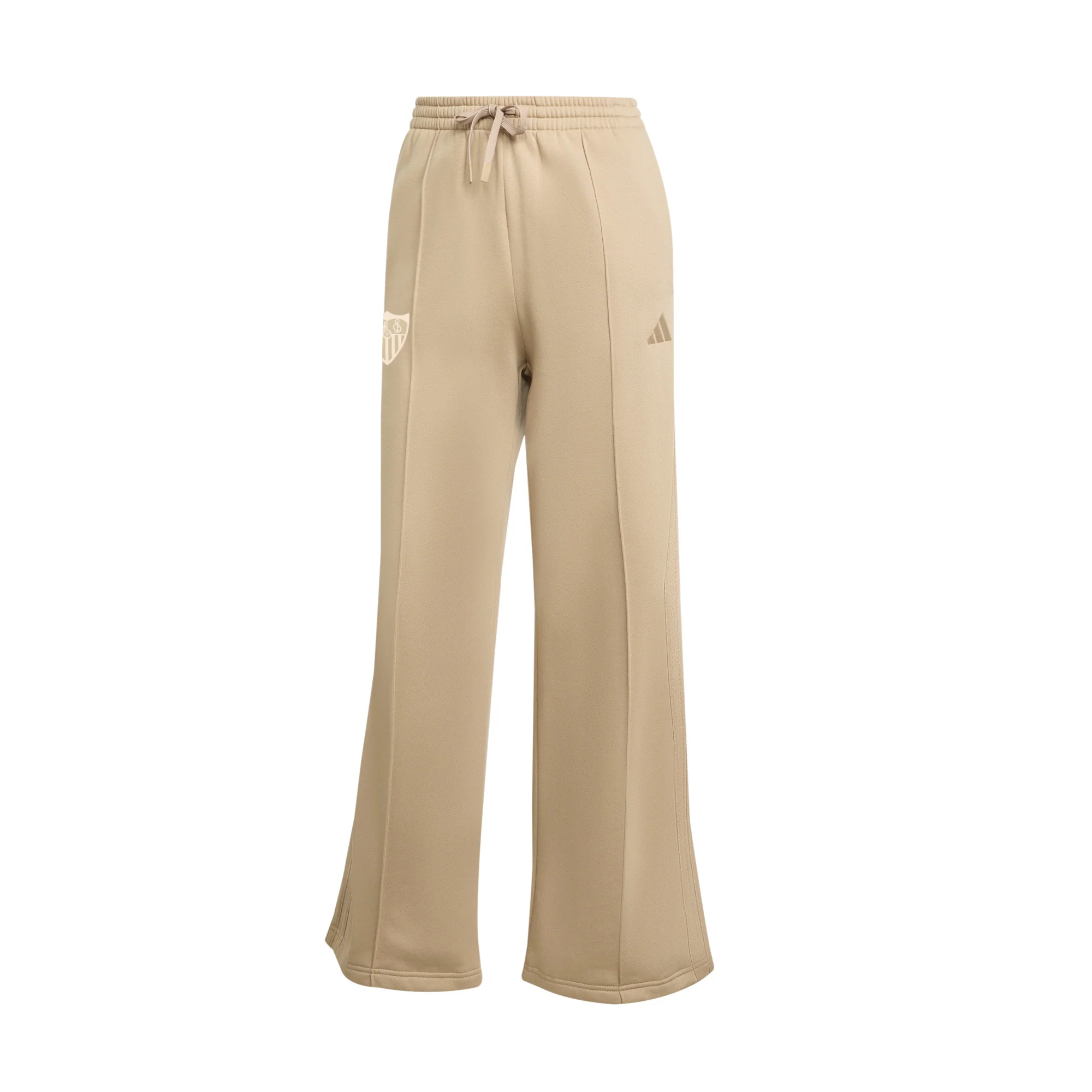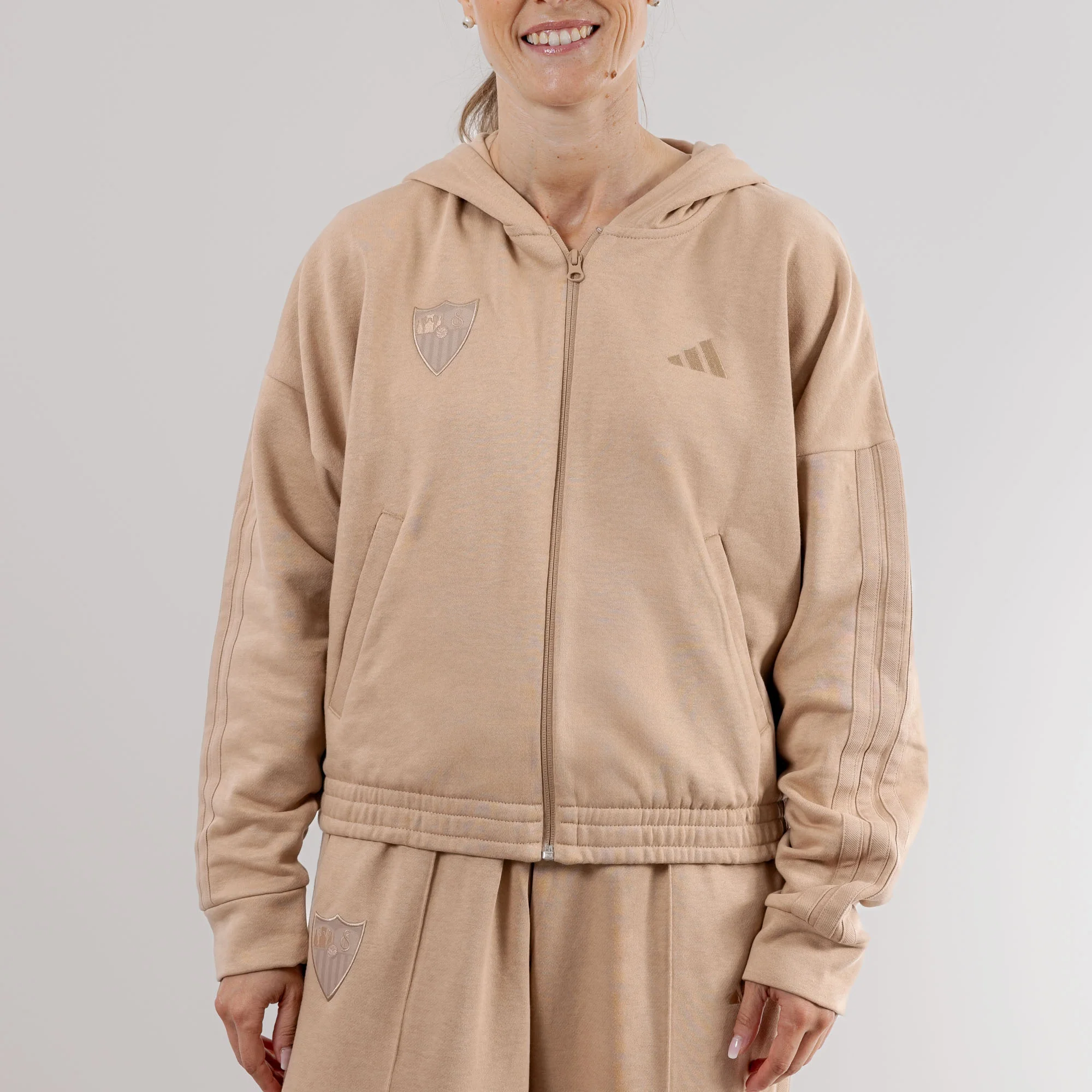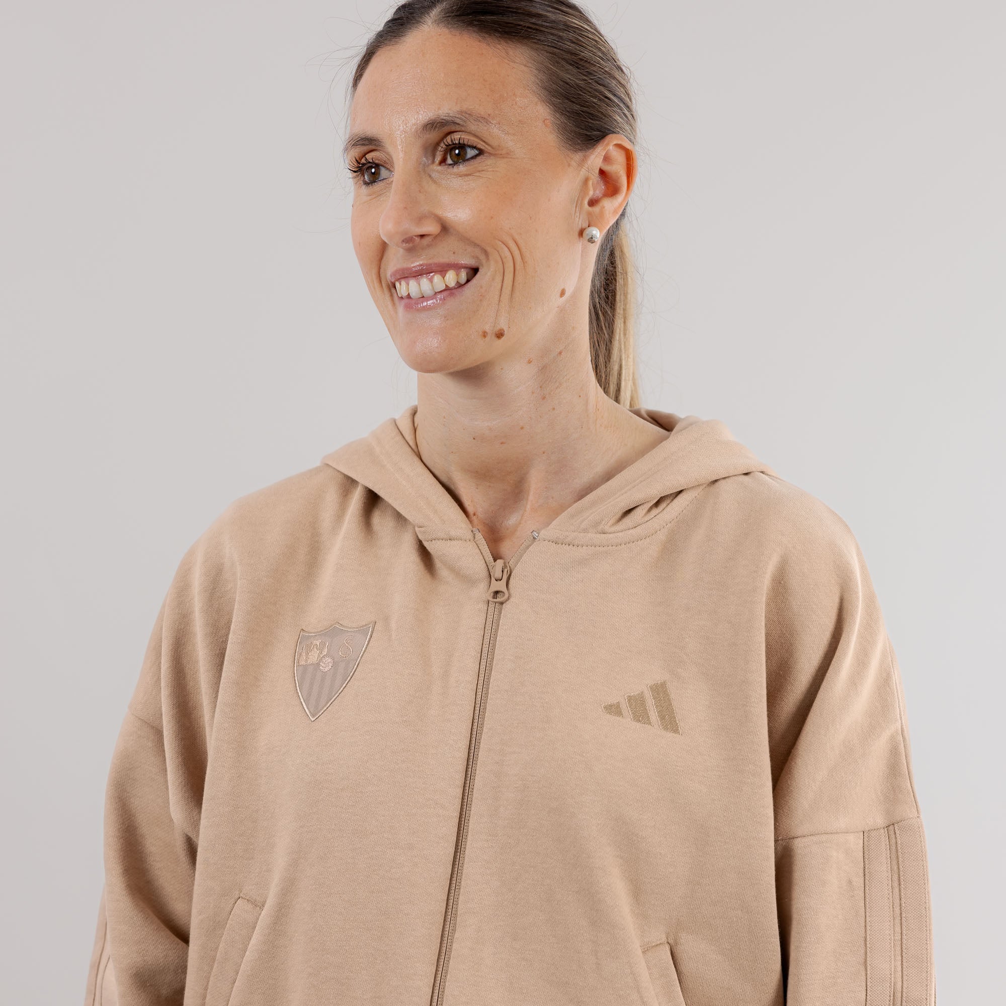 Este chándal de mujer, tiene un diseño especial con detalles en los hombros y con el escudo del Sevilla FC en color blanco serigrafiado sobre el pecho.