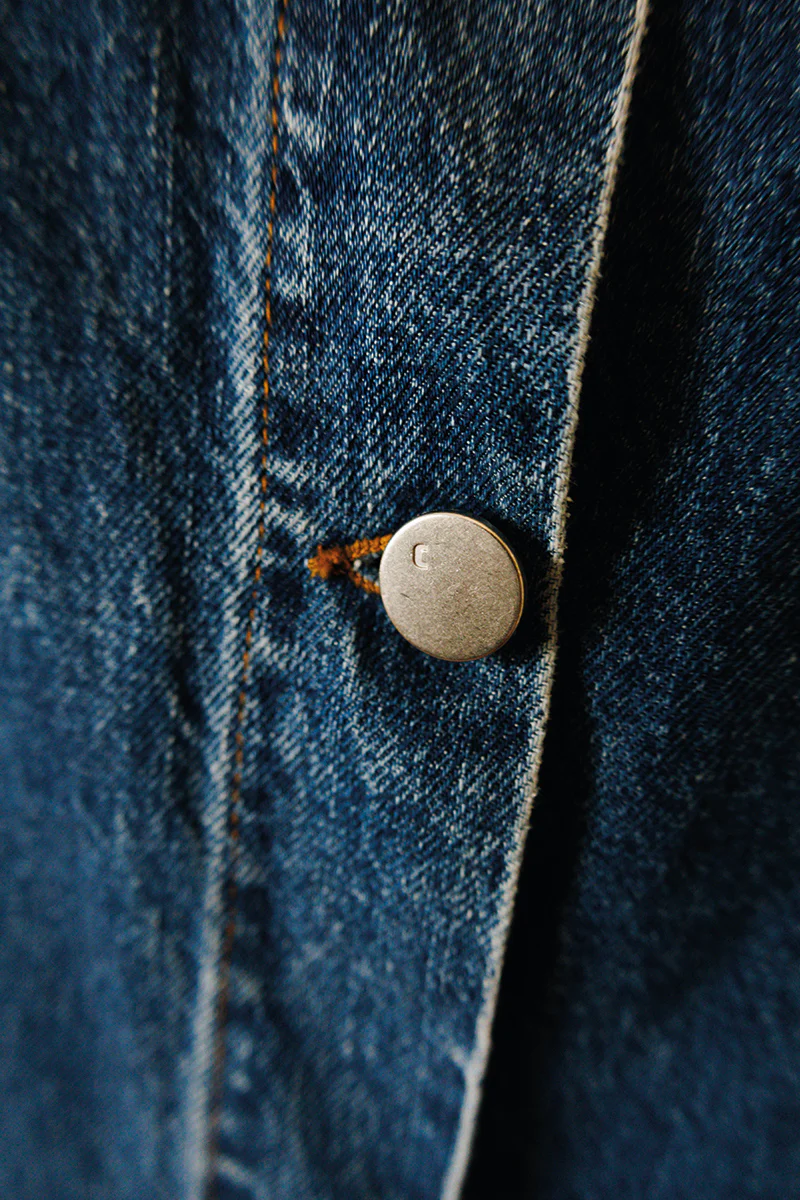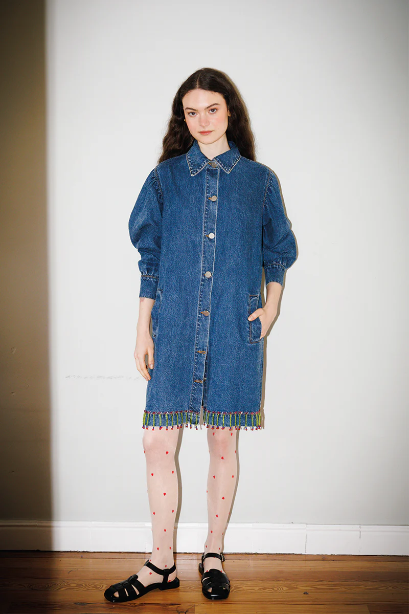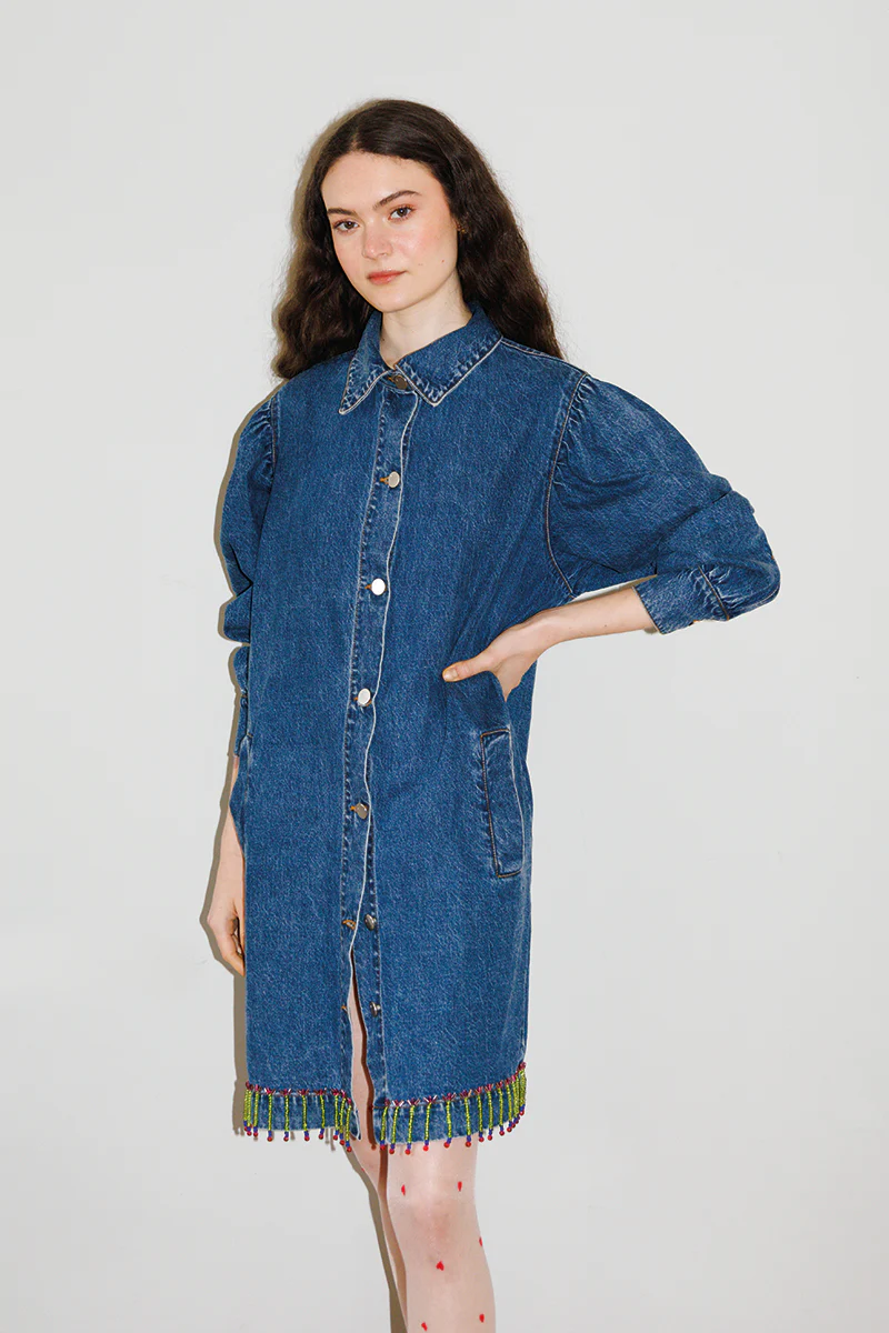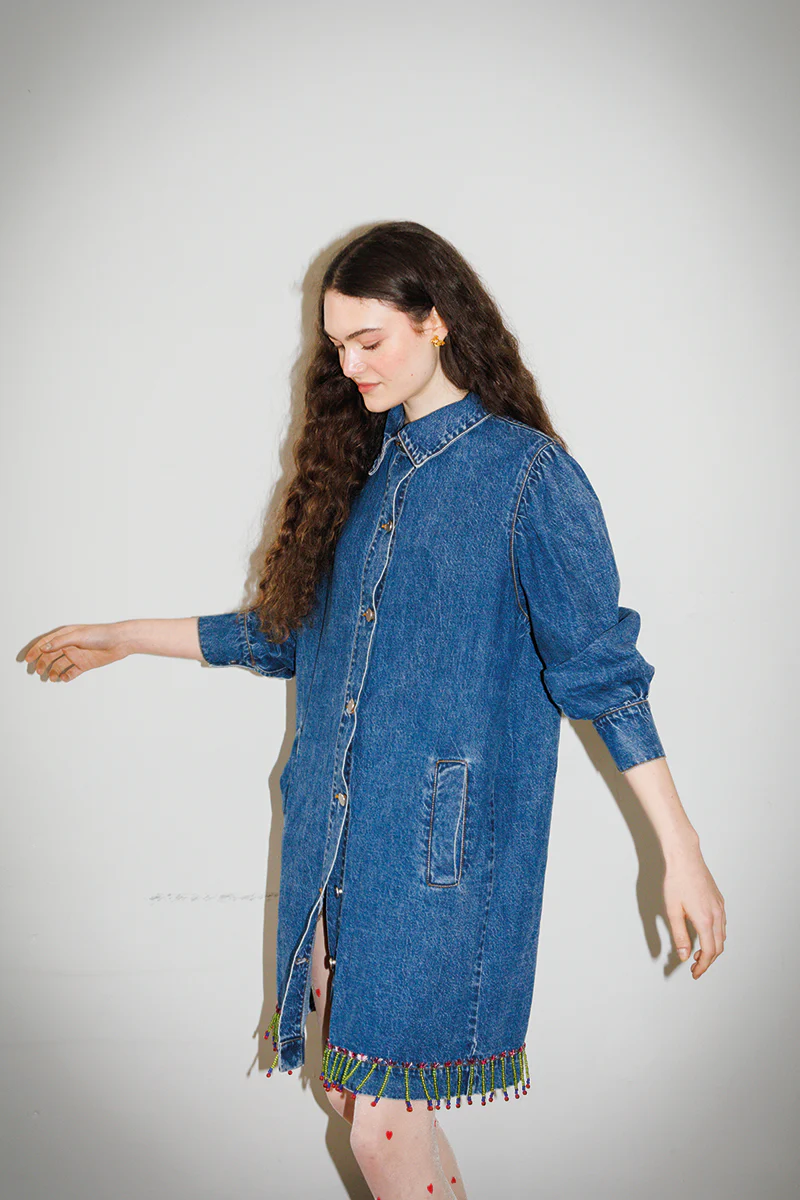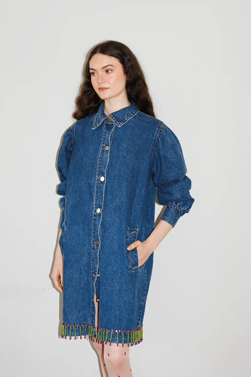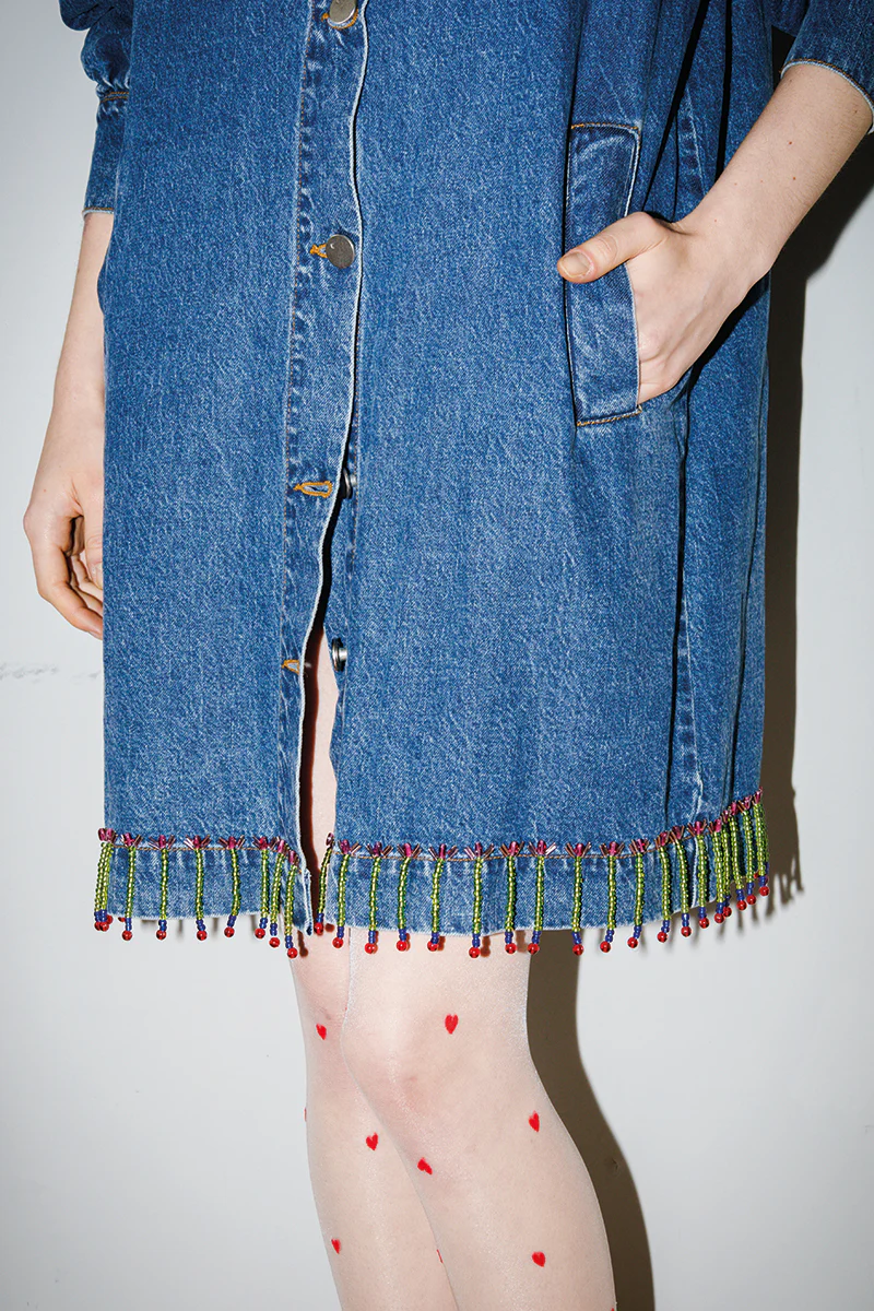 Denim jacket with hand-embroidered beads.