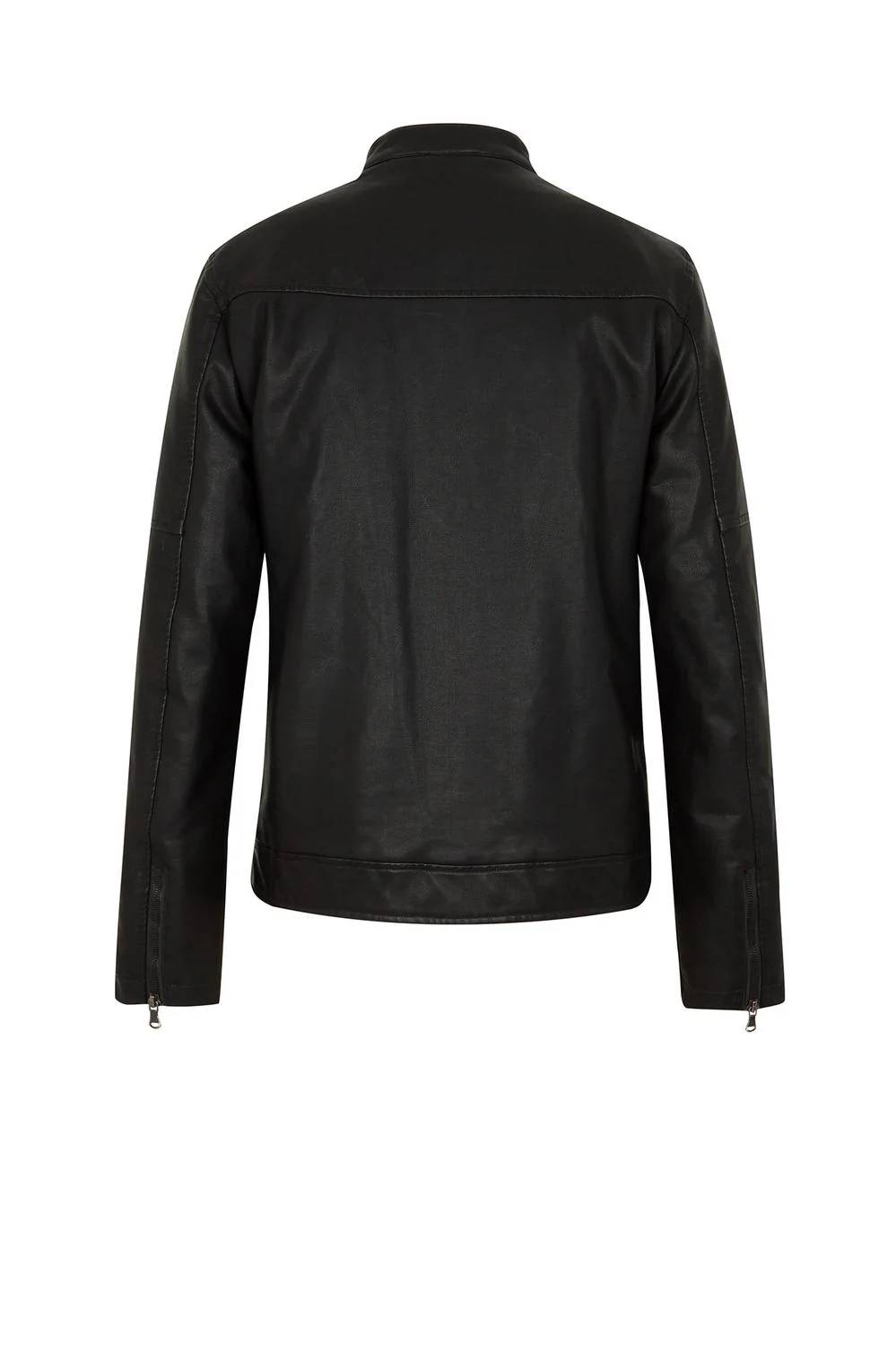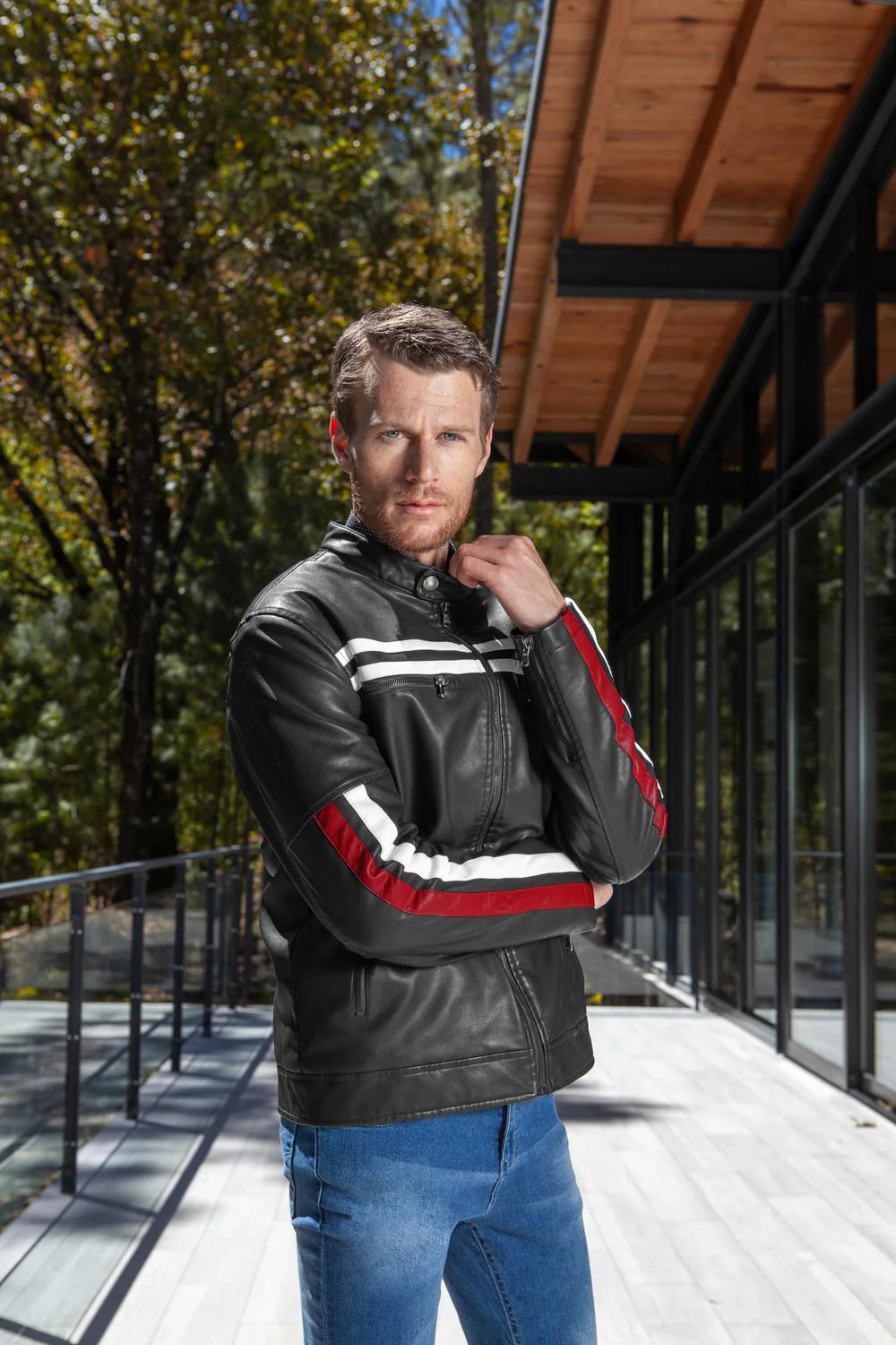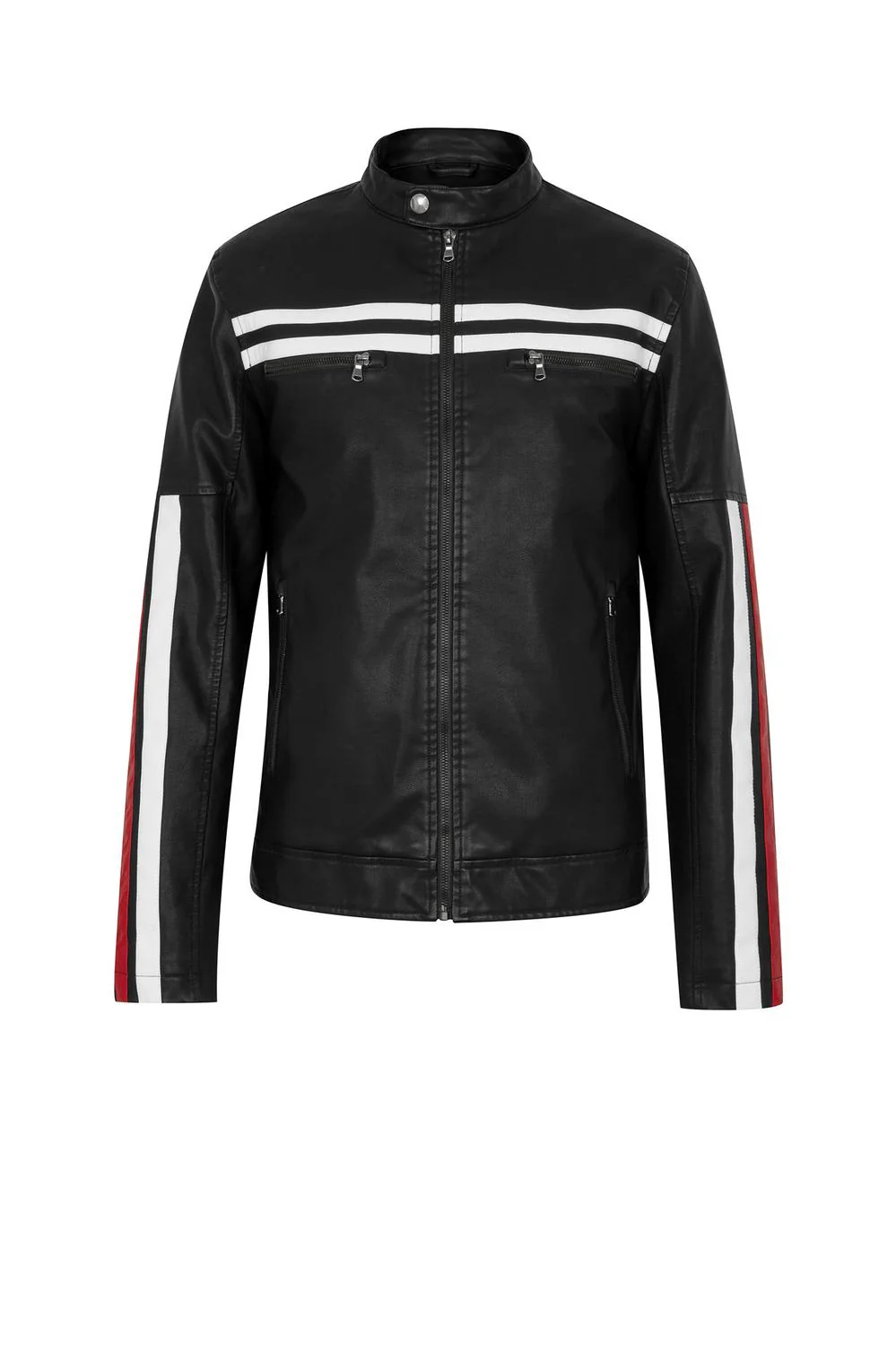 - Chaqueta con cuello, múltiples cierres, contrastes de color, interior afelpado, dos bolsillos exteriores y uno en el interior.