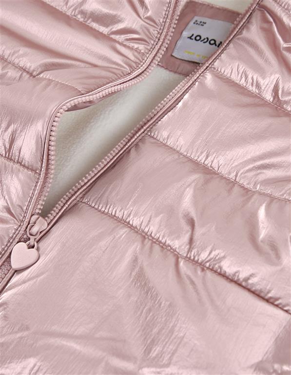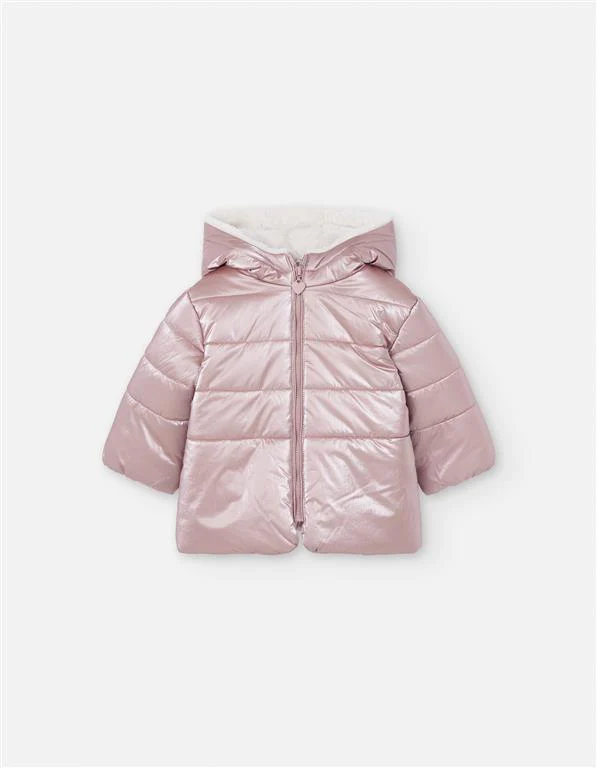 Chaqueta de cuello redondo con capucha, manga larga, cierre de ziper frontal, bolsillos laterales funcionales y de color liso con efecto metalico. Con detalles que la hacen lucir elegante o casual. Interior de peluche.