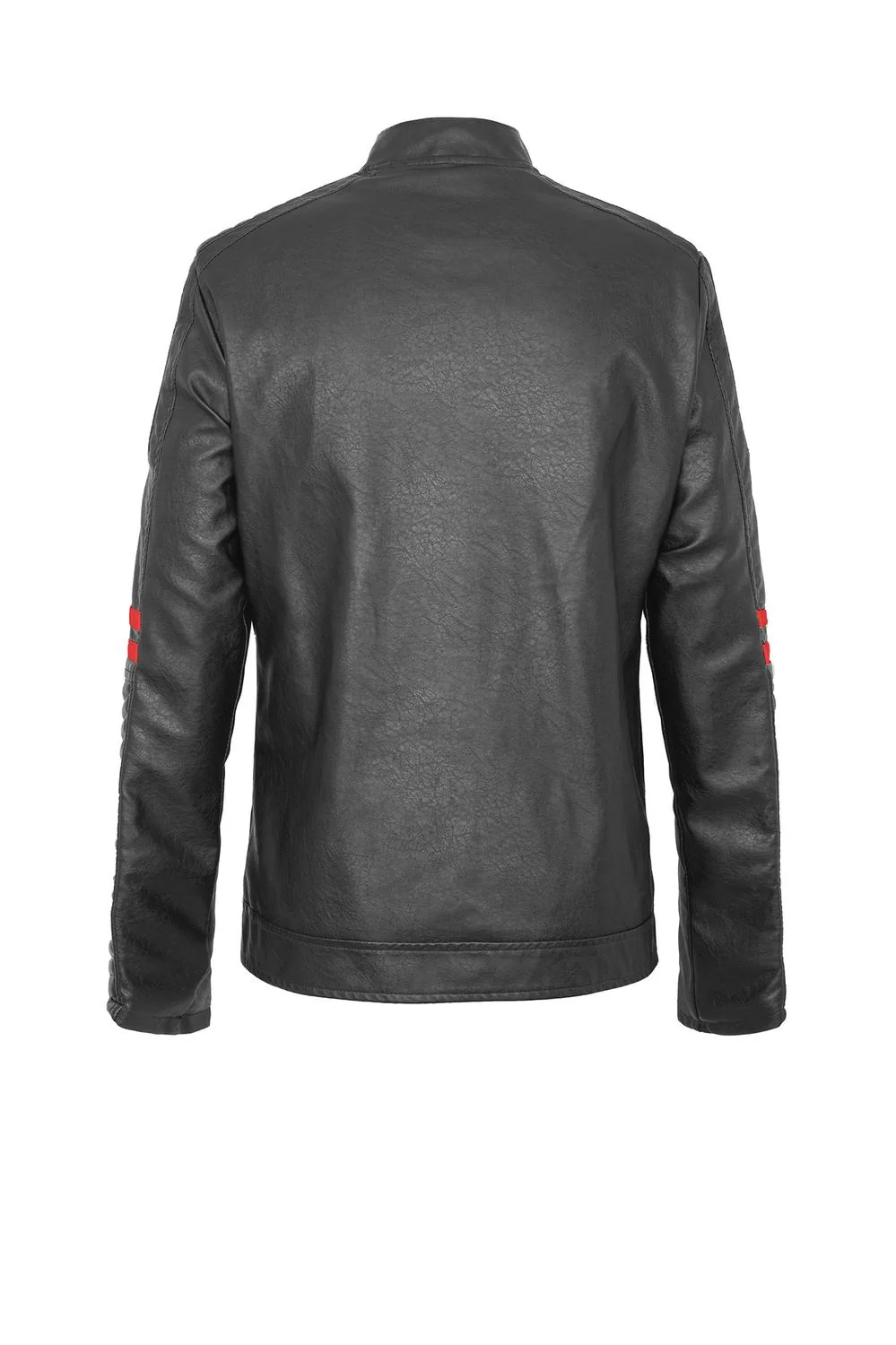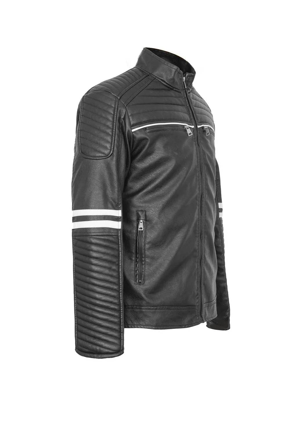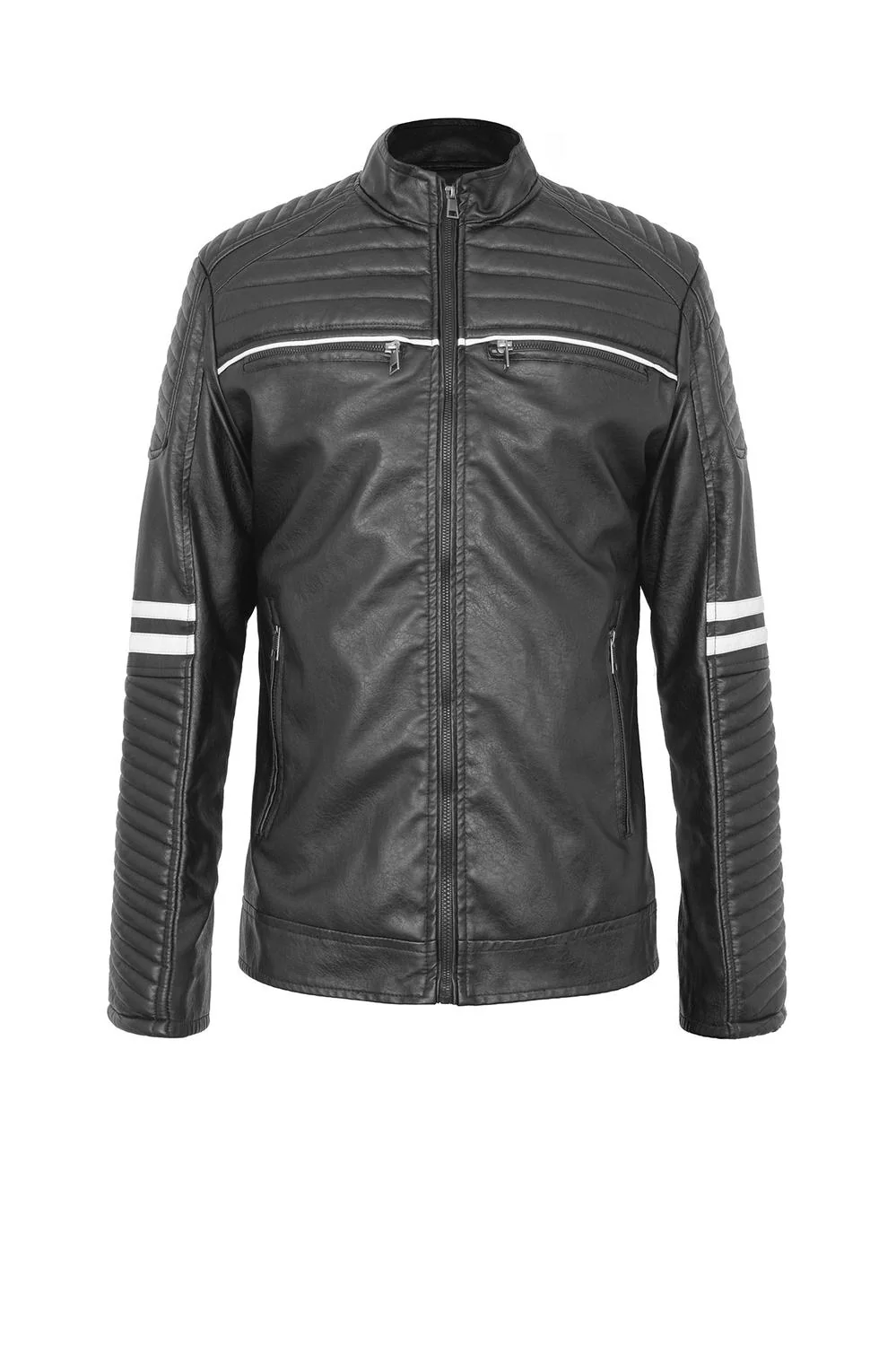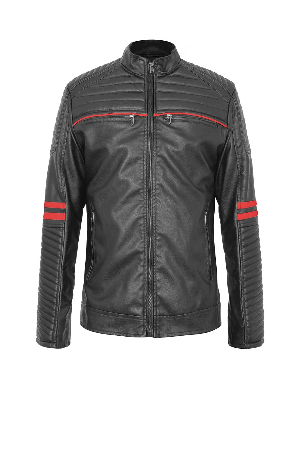 - Chaqueta tipo biker con cuello alto, costuras decorativas, detalles en contraste de color y múltiples cierres