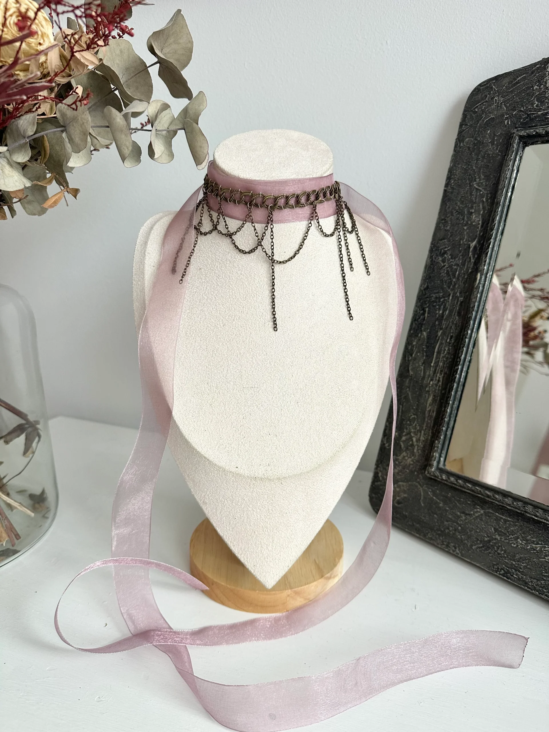 Choker elegante y sofisticado en terciopelo azul marino, adornado con una mezcla de cadenas bordadas en dorado de acero inoxidable y detalles en oro viejo que le dan un aire vintage y lujoso. En el centro, una estrella de cristal en tonos antracita agrega un toque de brillo y misterio al diseño. Este choker es perfecto para darle un toque distintivo y moderno a tu look, ideal para ocasiones especiales o para un estilo único y atrevido.