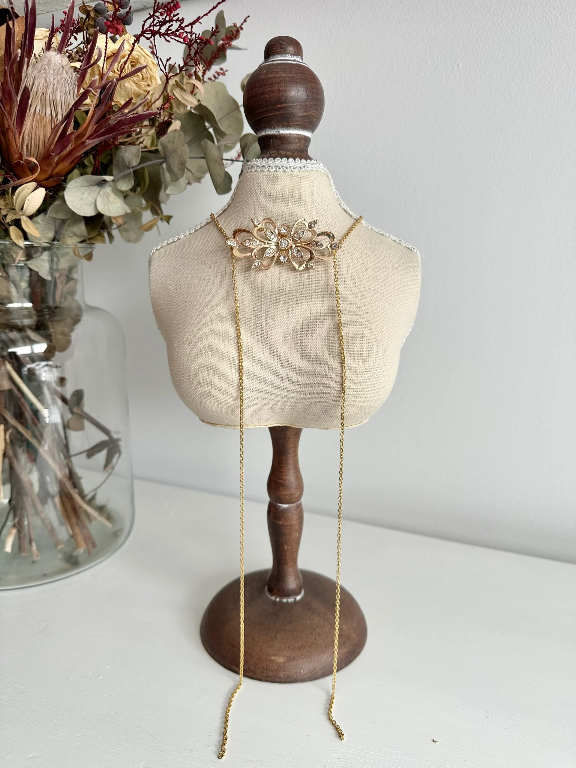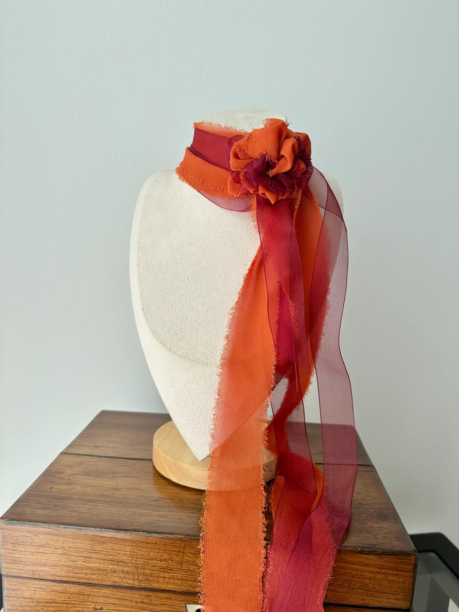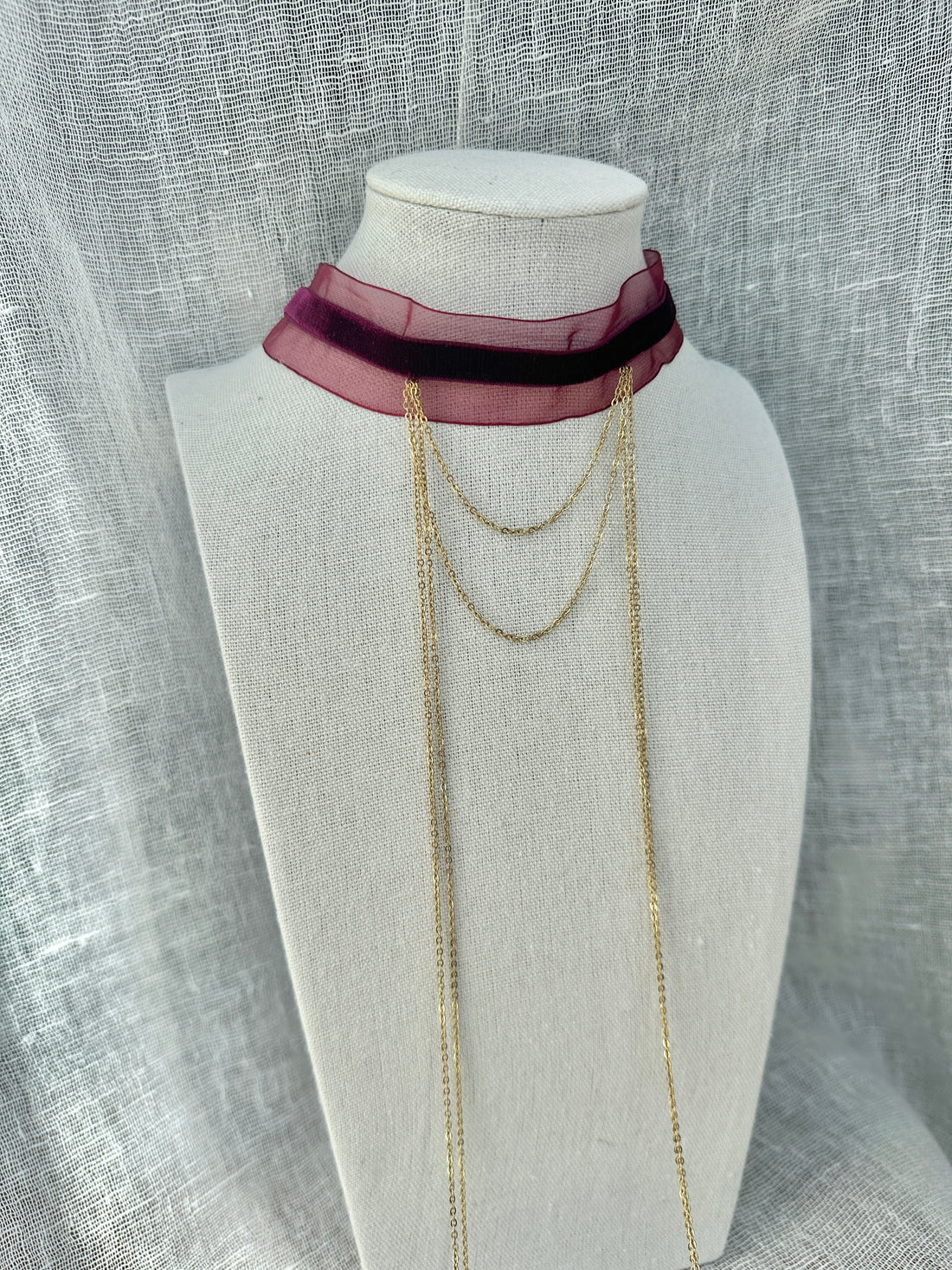 Choker de terciopelo burdeos con base de organza con cadenas finas doradas de acero inoxidable