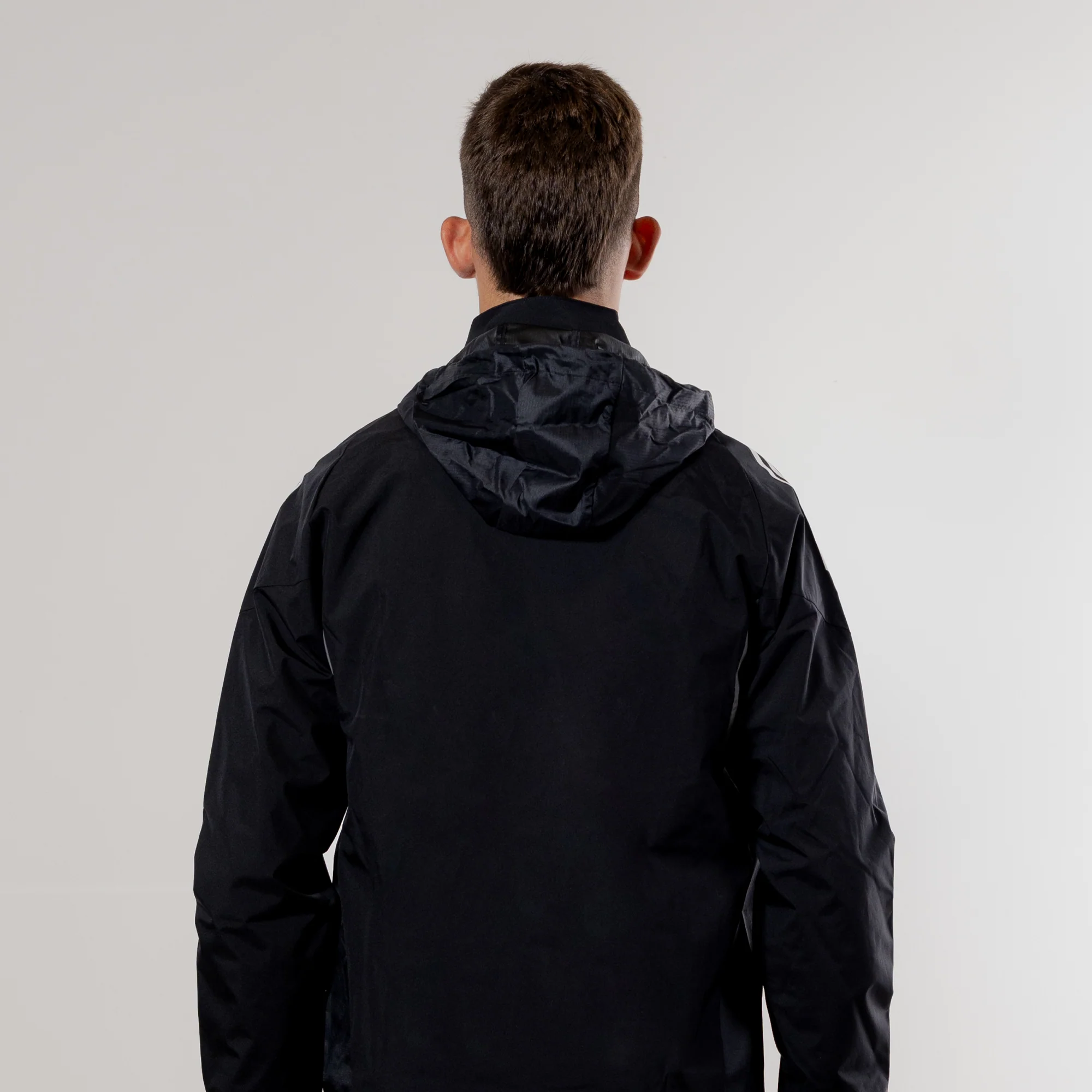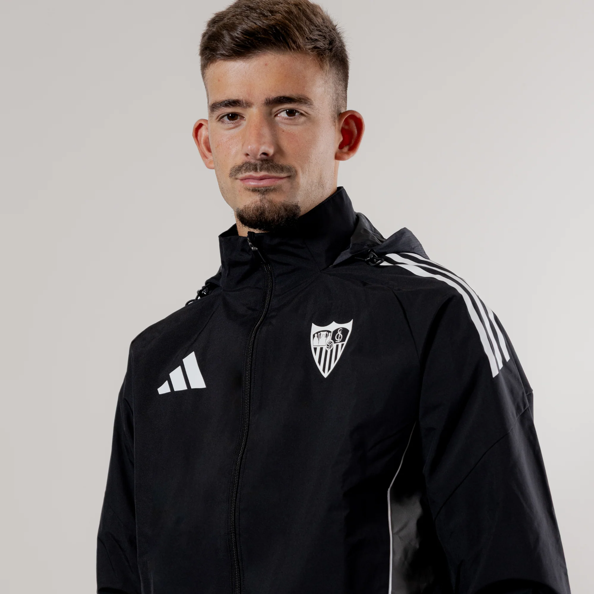Perteneciente a la Colección Oficial de Entrenamiento del Sevilla Fútbol Club para la temporada 25/26, este chubasquero en color negro, detalles en mangas y logo de sponsor técnico y escudo del Club en color blanco sobre el pecho.