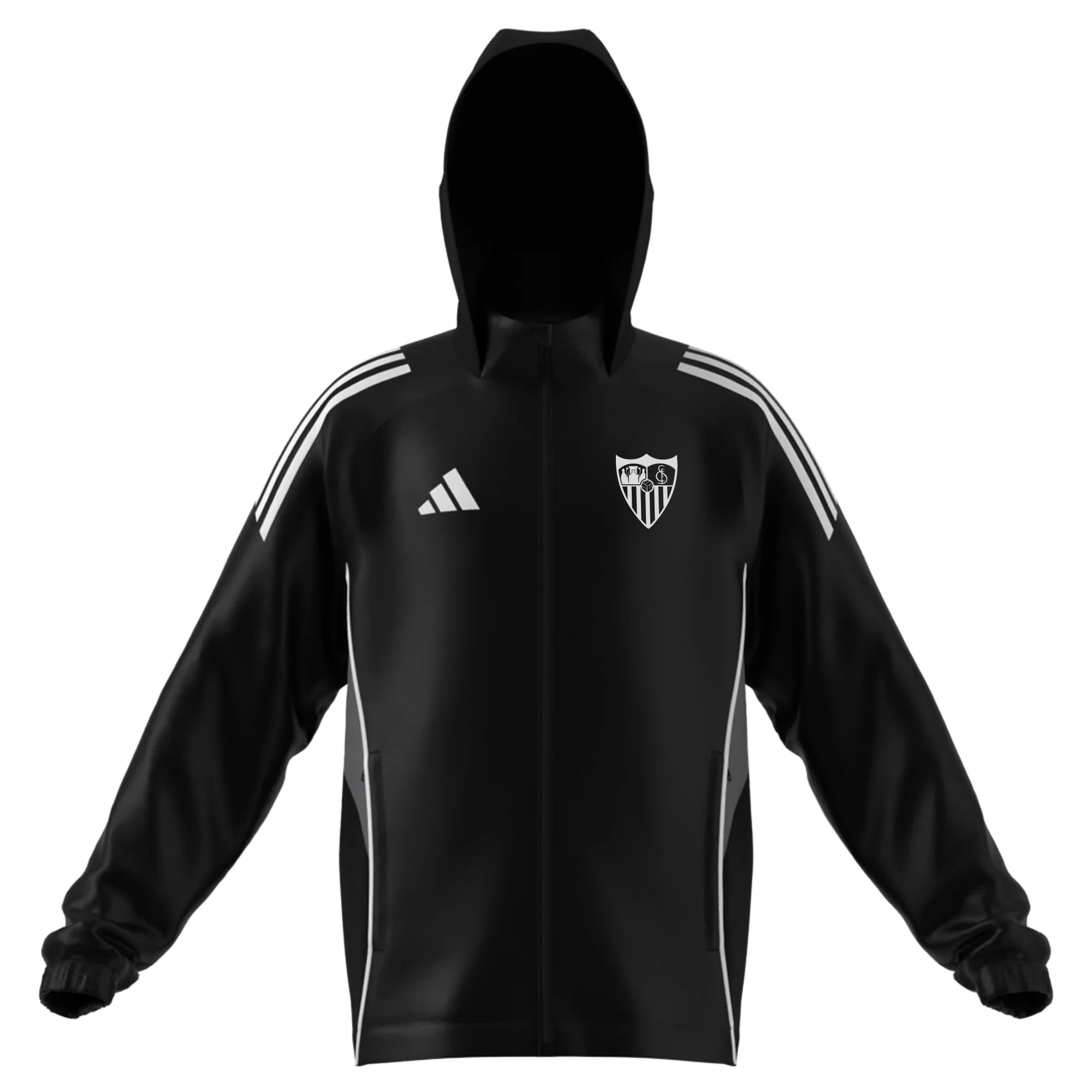 Perteneciente a la Colección Oficial de Entrenamiento del Sevilla Fútbol Club para la temporada 25/26, este chubasquero en color negro, detalles en mangas y logo de sponsor técnico y escudo del Club en color blanco sobre el pecho.