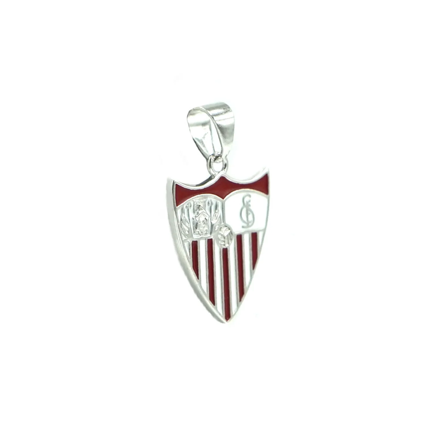 Precioso colgante de plata del Sevilla FC con escudo esmaltado a todo color con los colores blanquirrojos del Club. Esta pieza de la colección de joyería del Sevilla Fútbol Club es perfecta para cualquier sevillista, para coleccionistas y para regalar a aficionados.