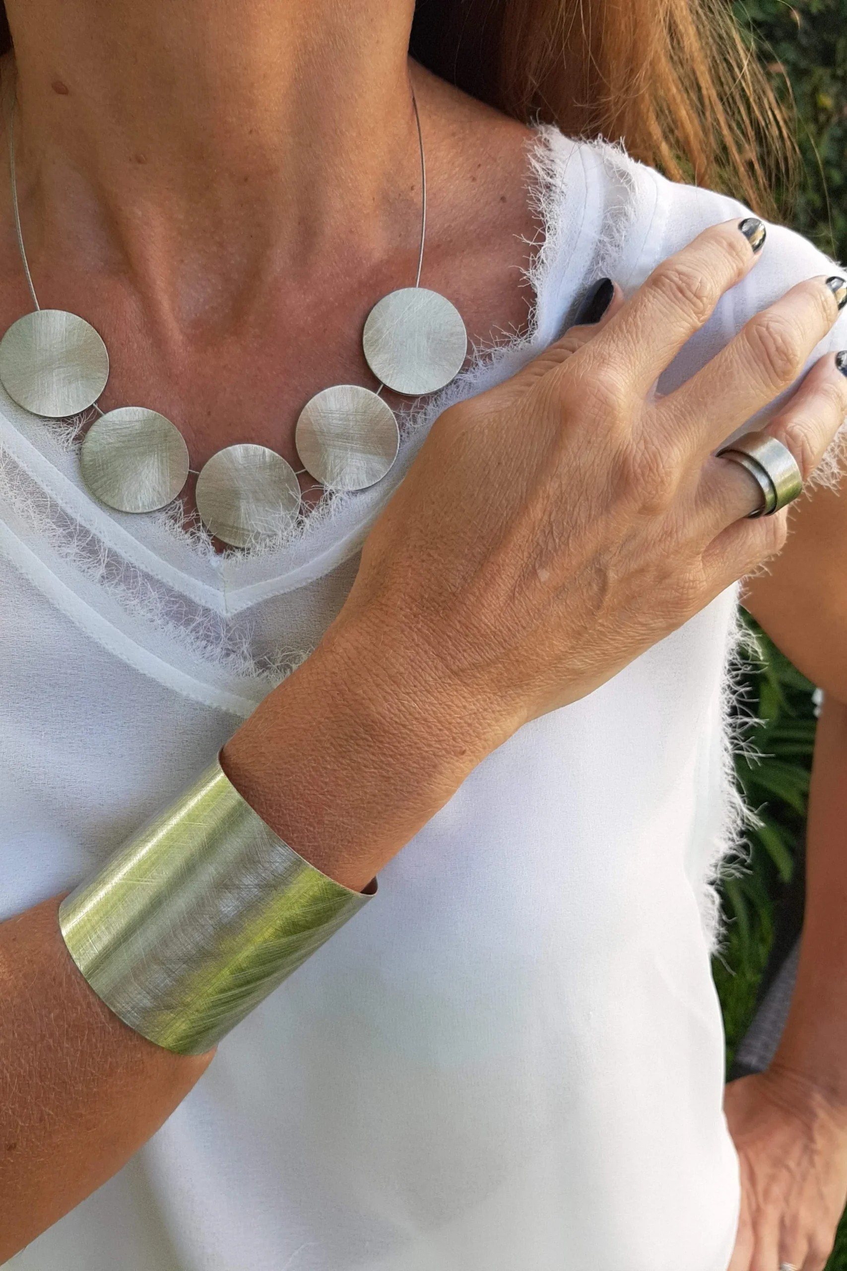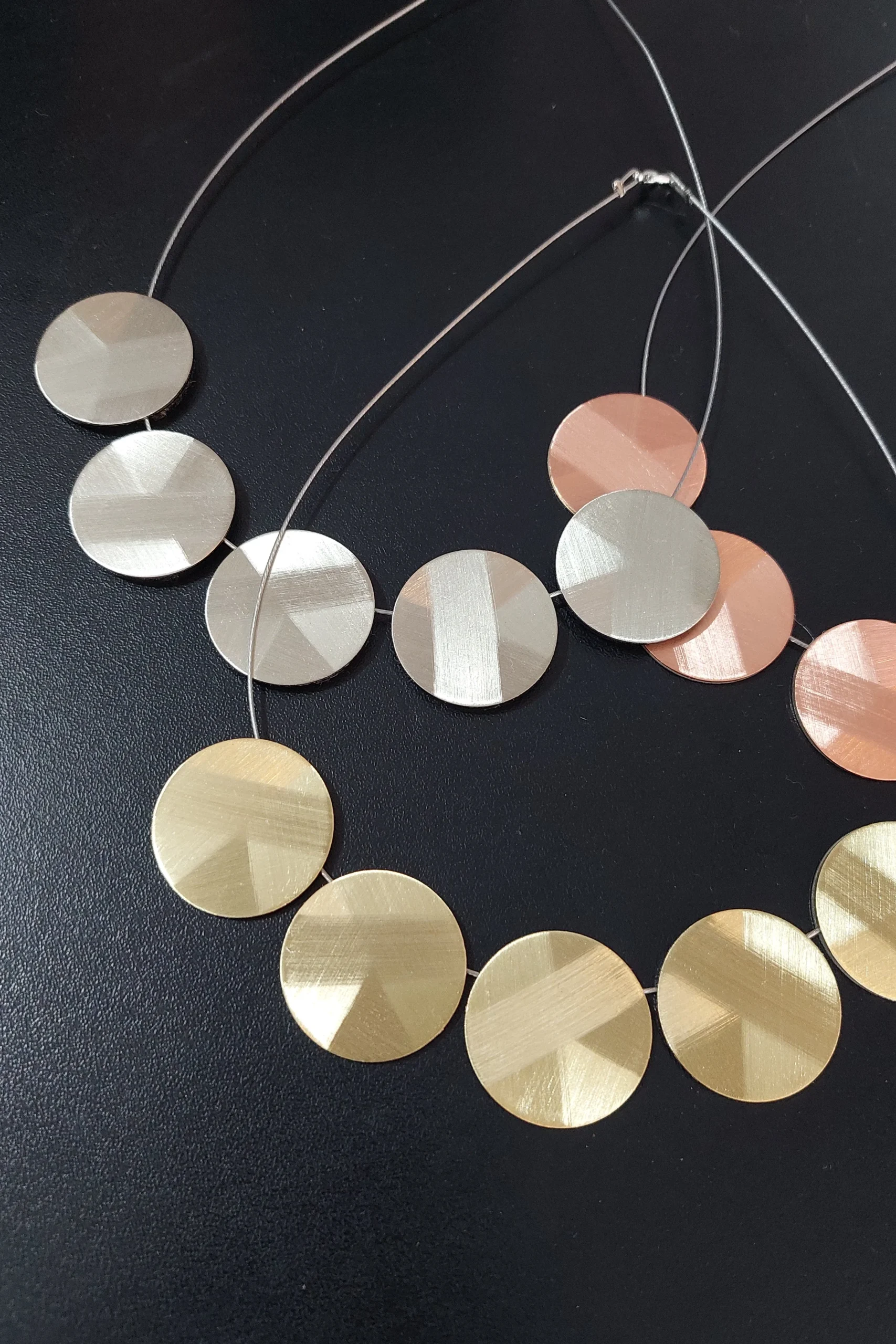 Collares REVERSIBLES. Textura realizada a mano, característica de la marca. Todas las piezas están laquedas, logrando una terminación brillante y duradera. Tanza de acero inoxidable de 46 cm de largo