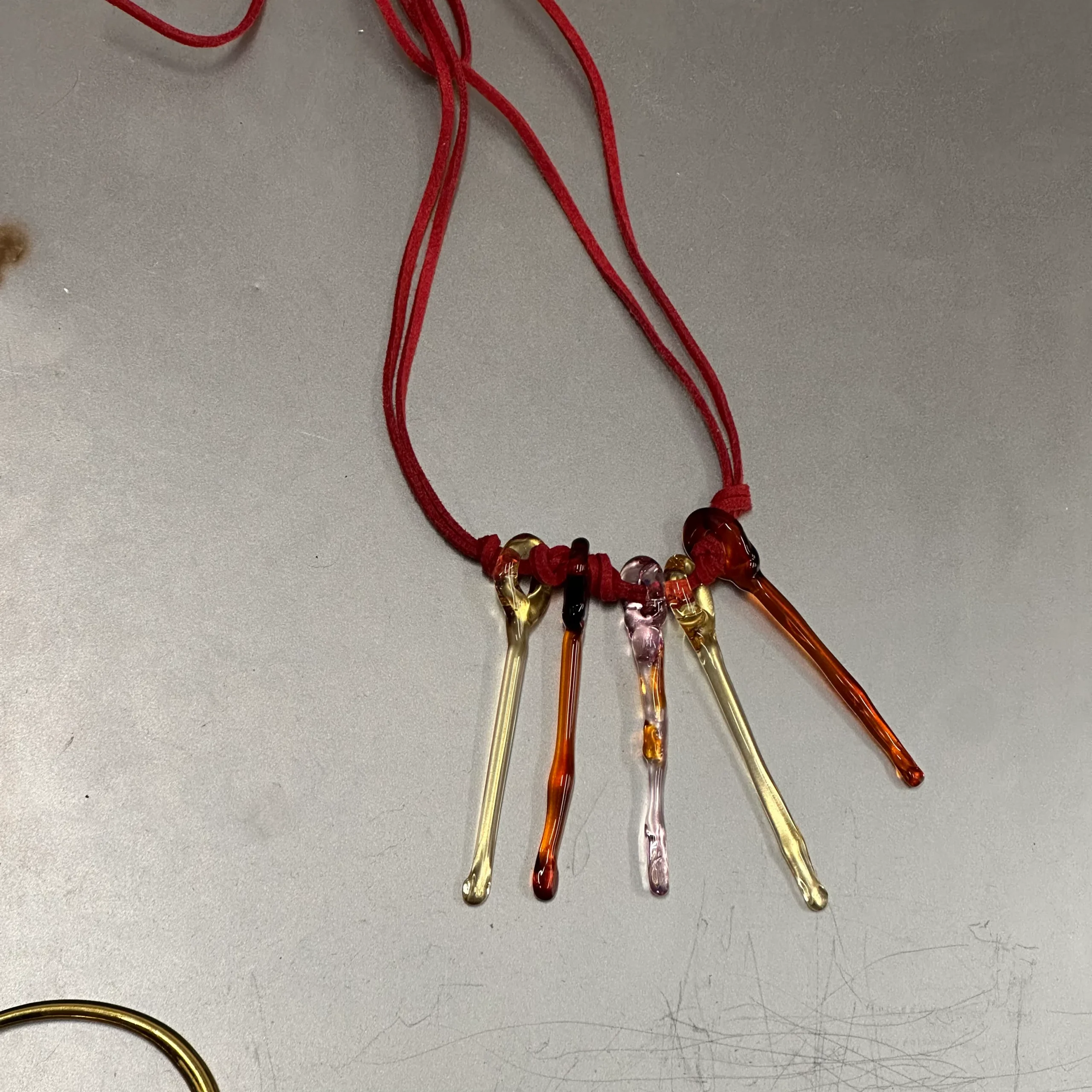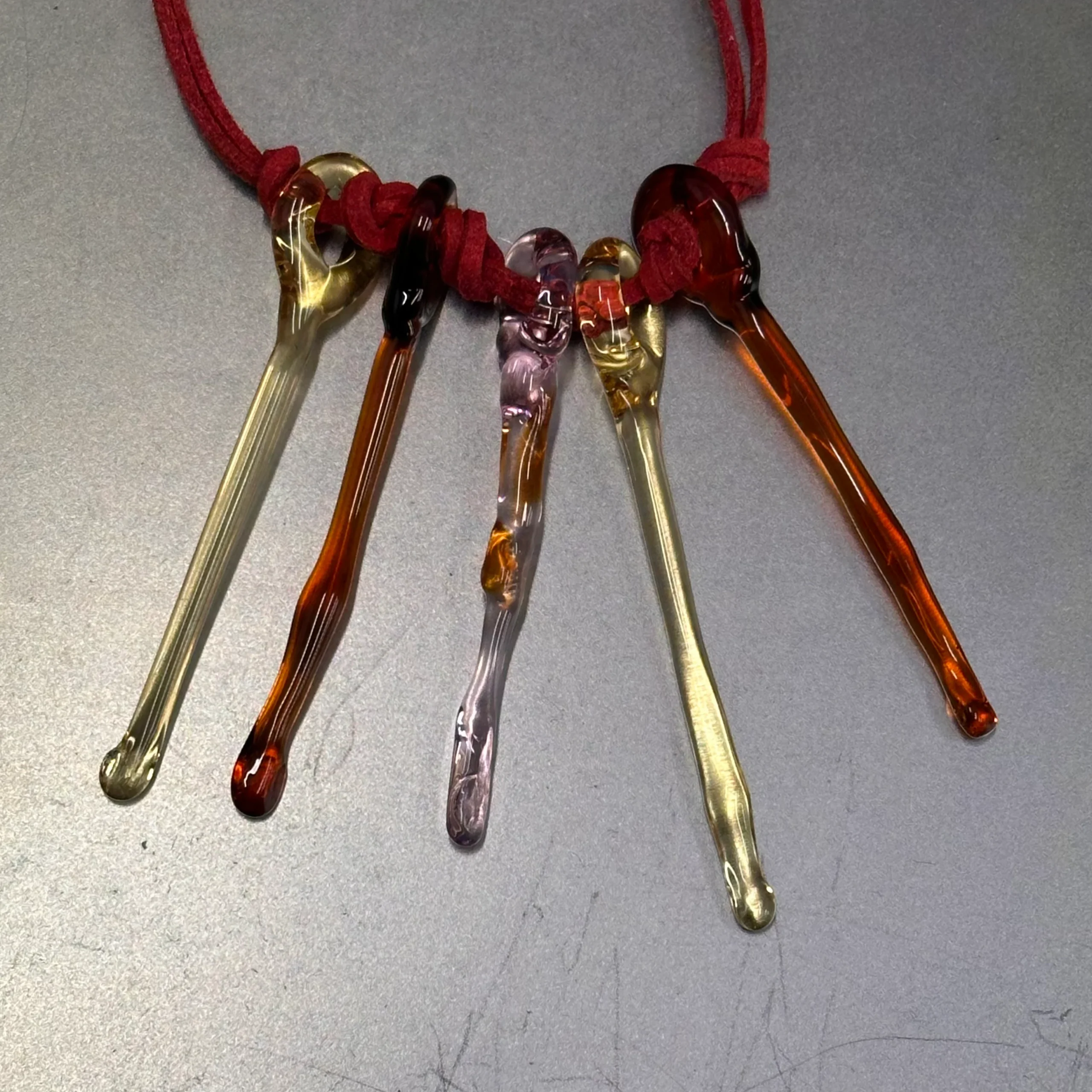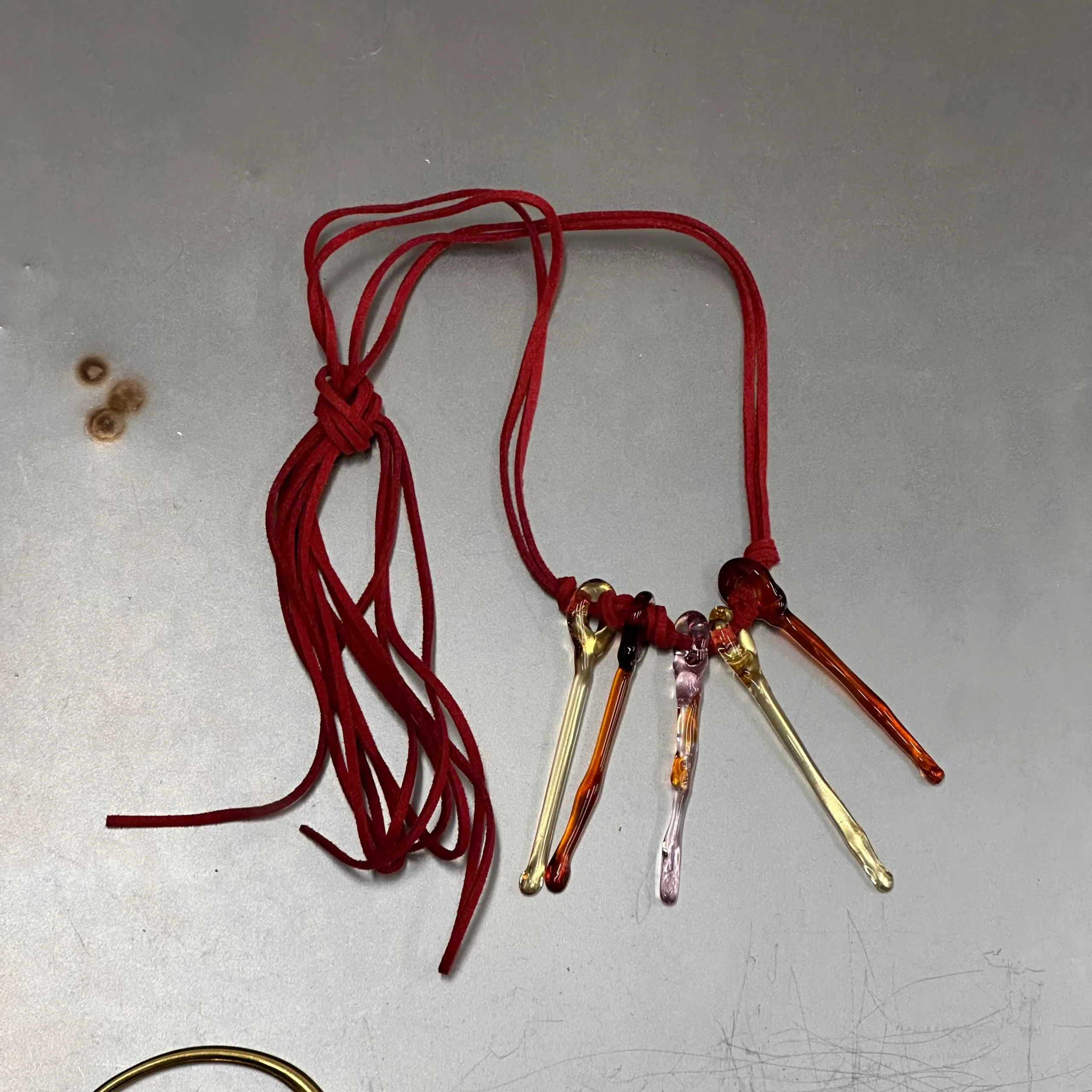 Collar compuesto por cinta de ante y 5 palitos hechos de vidrio de borosilicato (es el mismo material en todas las joyas de vidrio). Las cuerdas se anudan pudiendo ponerlo de diferentes maneras. Los palitos chocan entre sí recordando a un llamador de ángeles.