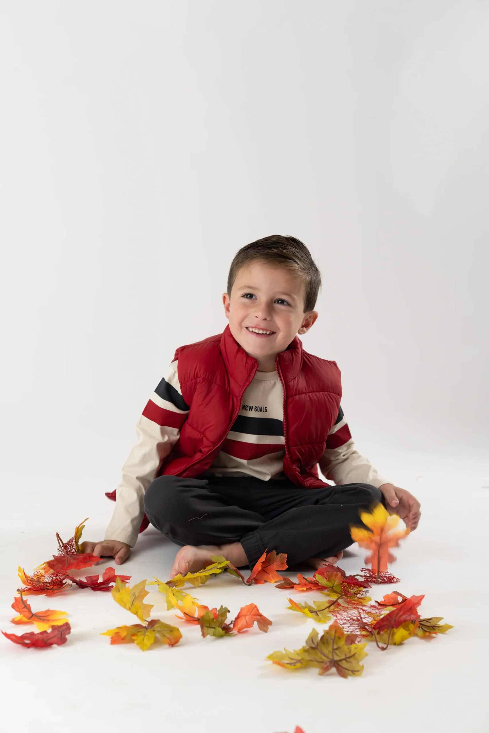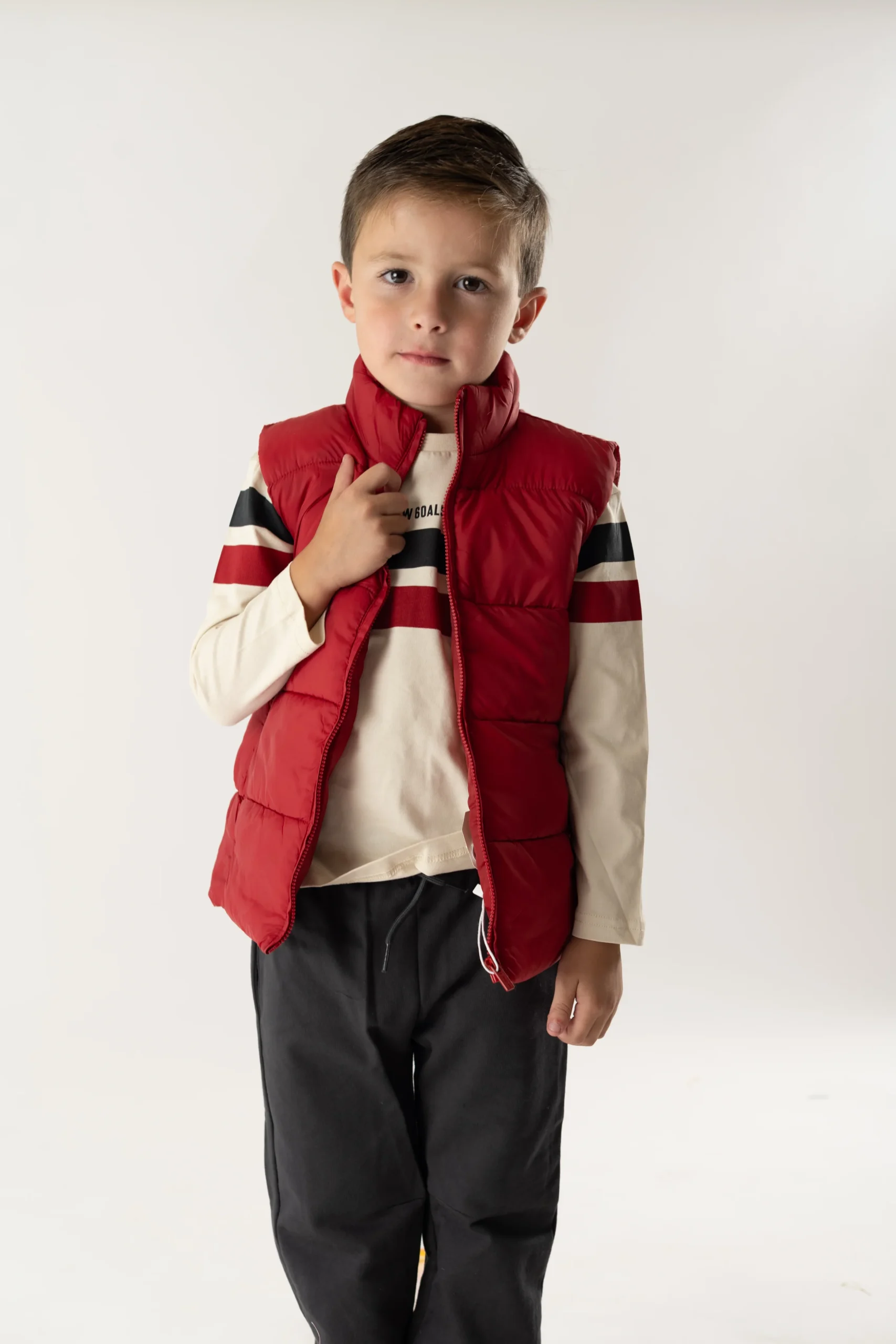¡Padrisimo conjunto de tres piezas basicas a juego! Chaleco con cuello redondo, sin mangas y cierre de ziper frontal. Camiseta de manga larga, cuello redondo y diseño a rayas. Y pants tipo joggers de color liso, con cordon ajustable en la cintura y elastico en tobillos para mayor ajuste.