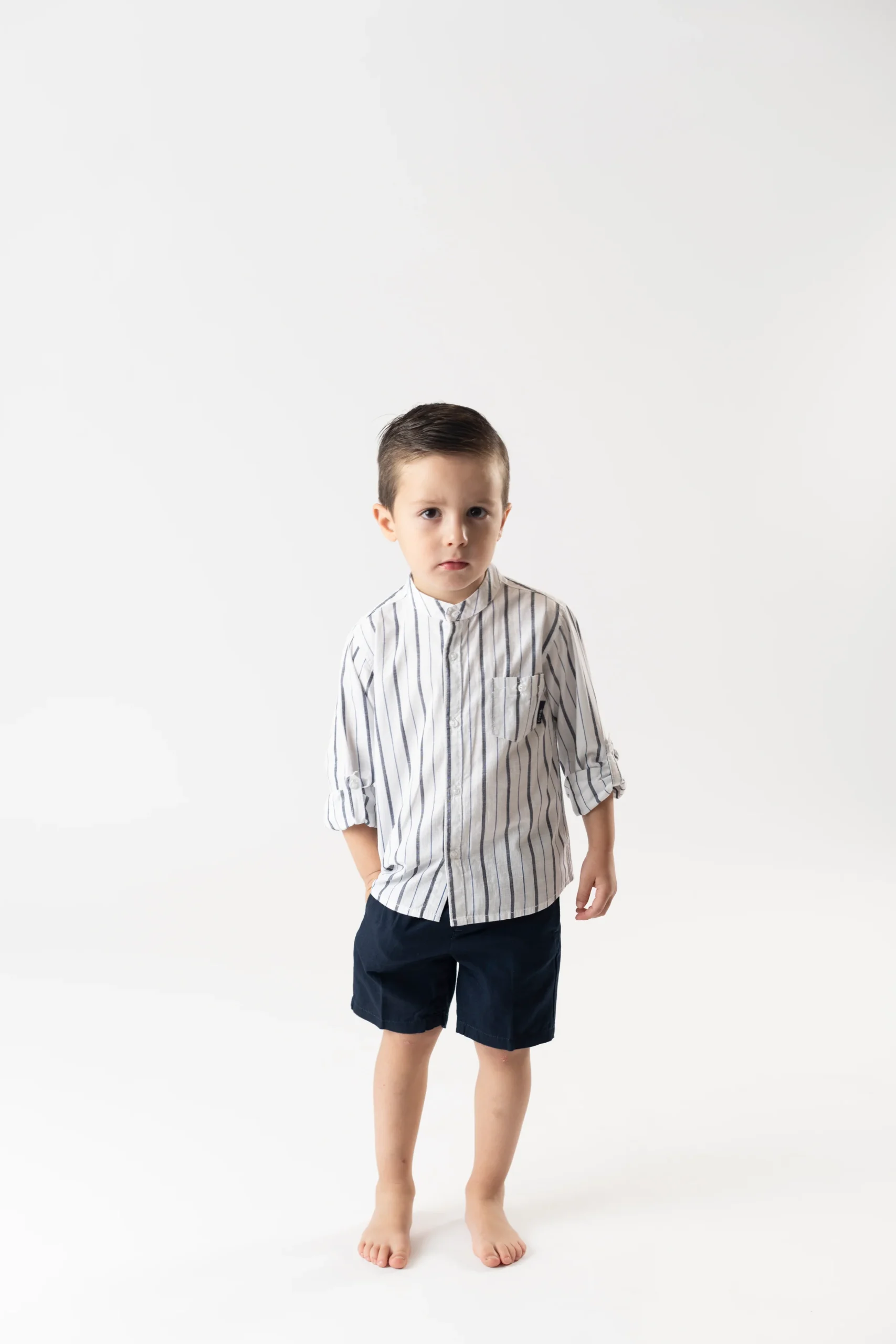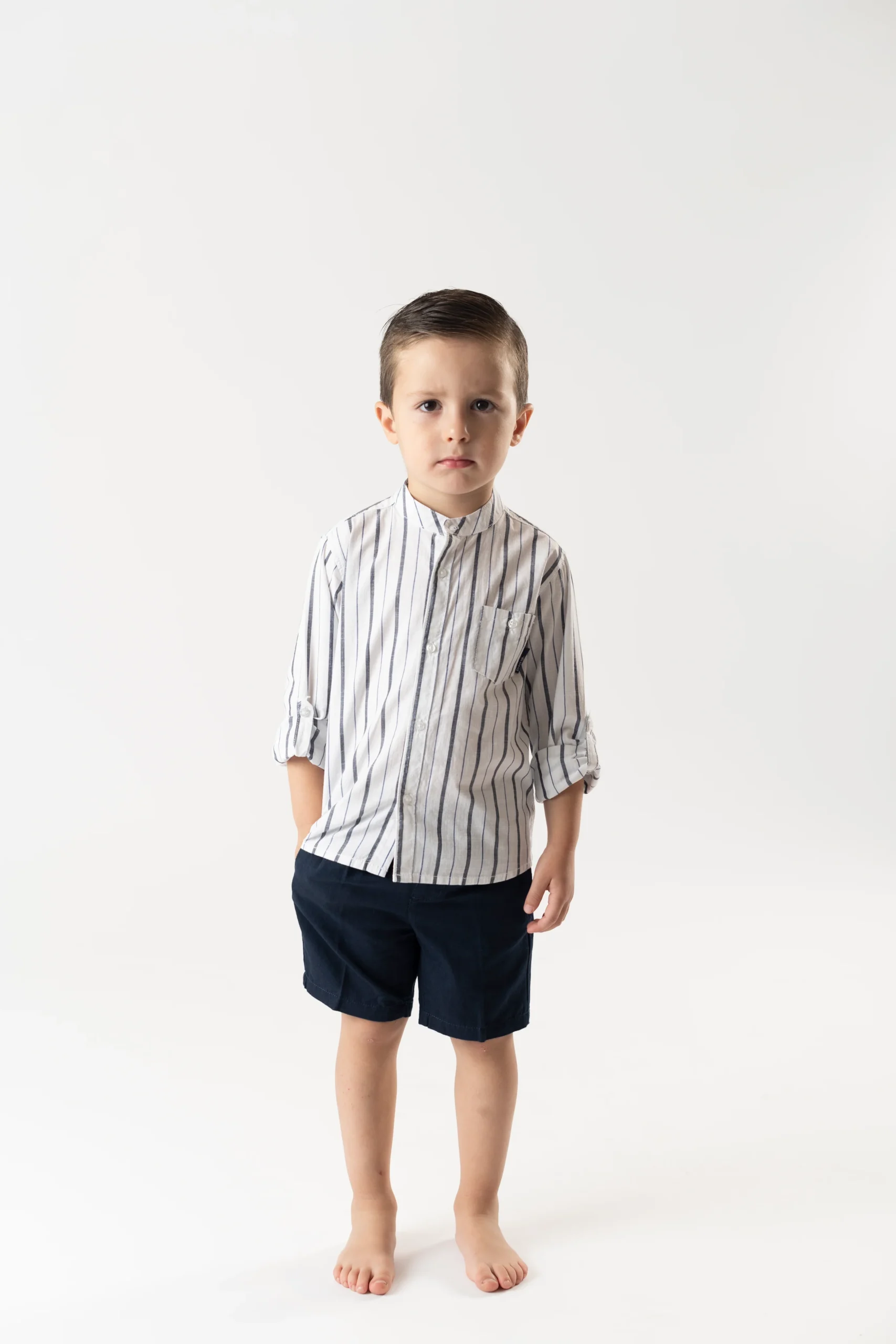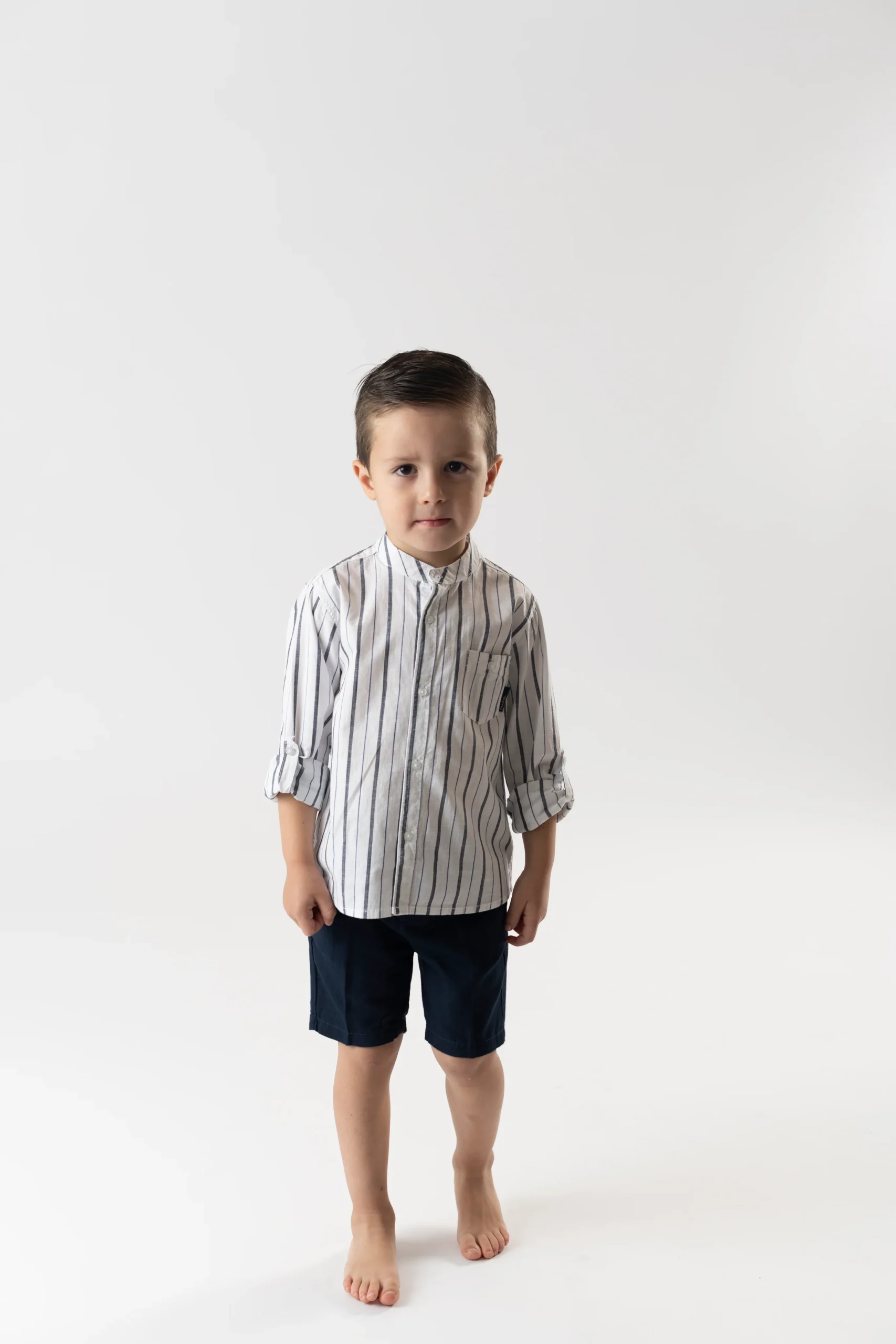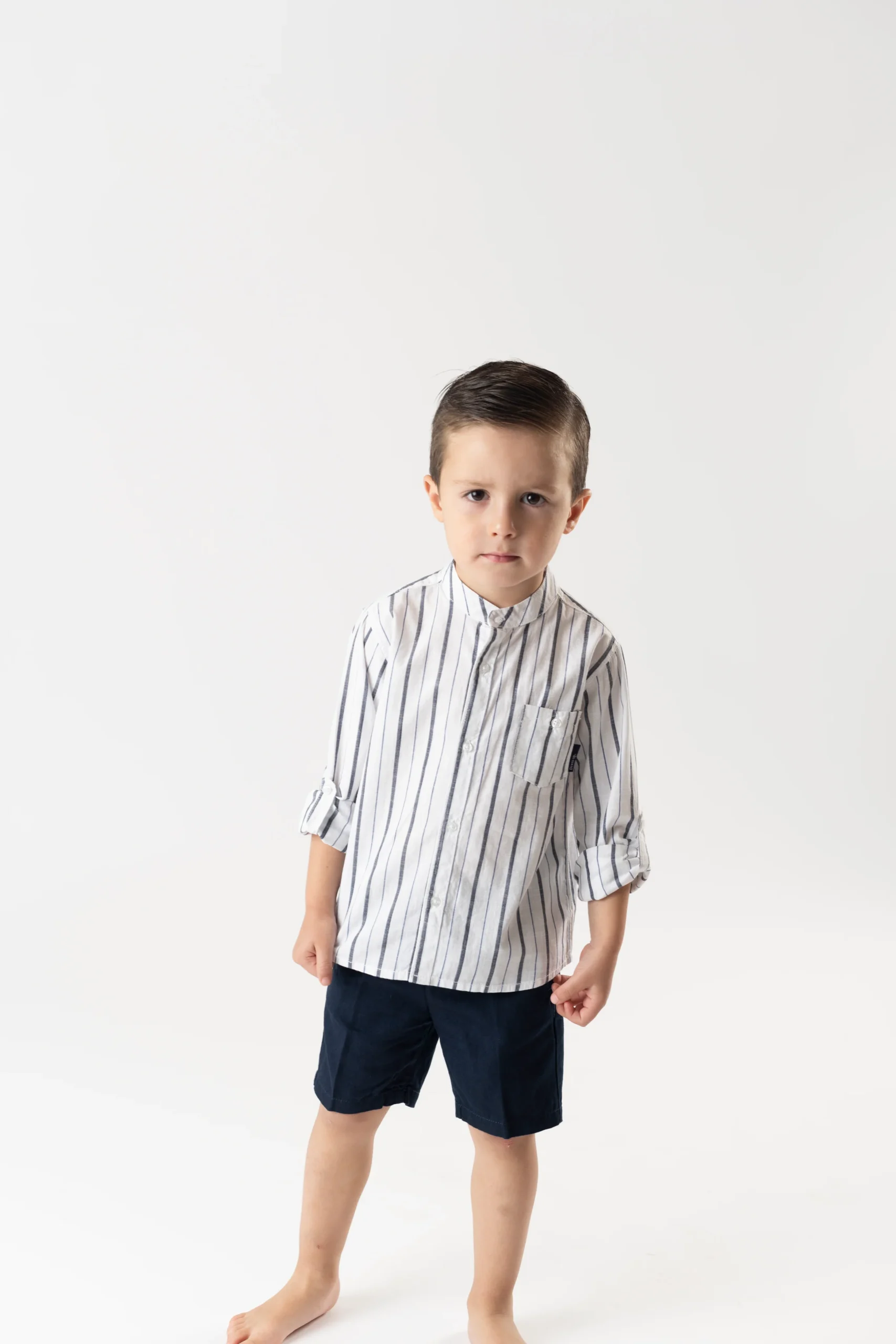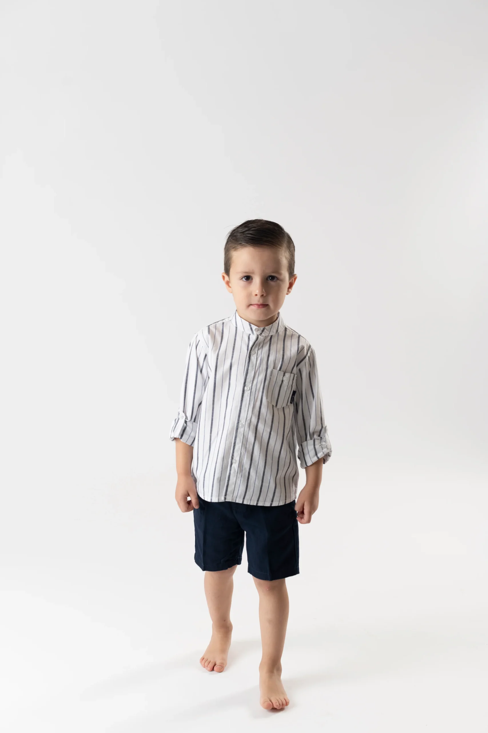 ¡Divino y elegante conjunto de camisa y bermudas a juego! Camisa de rayas, cuello mao, manga larga ajustable y cierre de botones por el frente. Bermudas de color liso, cierre de boton y ziper, con elastico ajustable en cintura.