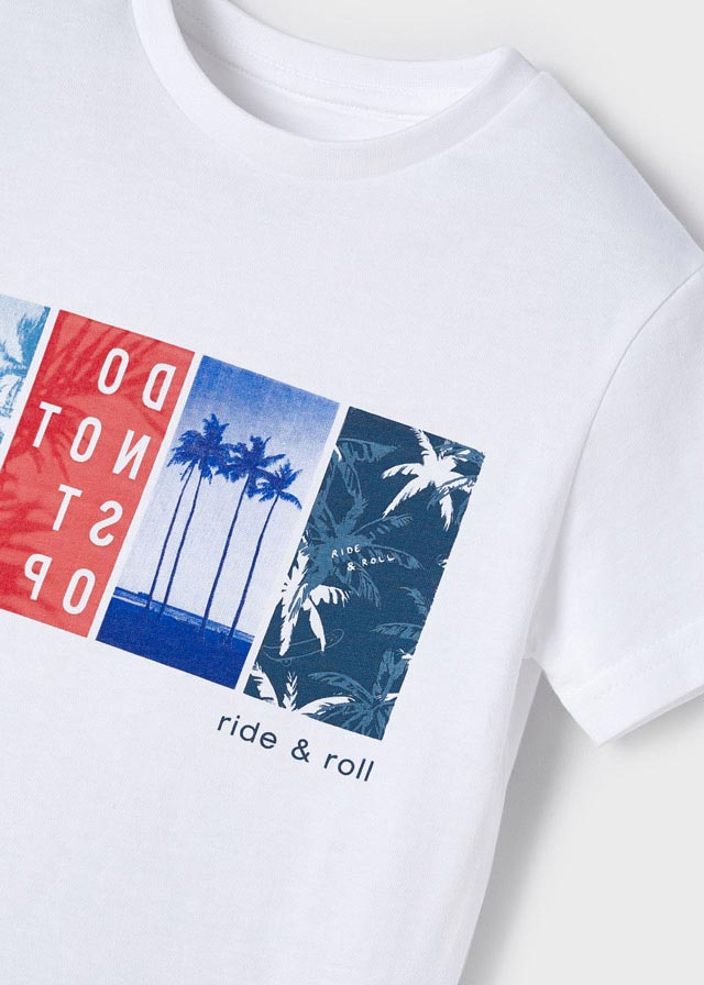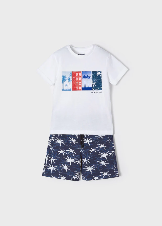 ¡Padre, comodo y basico conjunto de t-shirt con sus bermudas a juego! T-shirt de cuello redonda, manga corta y dibujo estampado por el frente. Bermudas a juego con cordon ajustable en la cintura y estampado de palmeras.