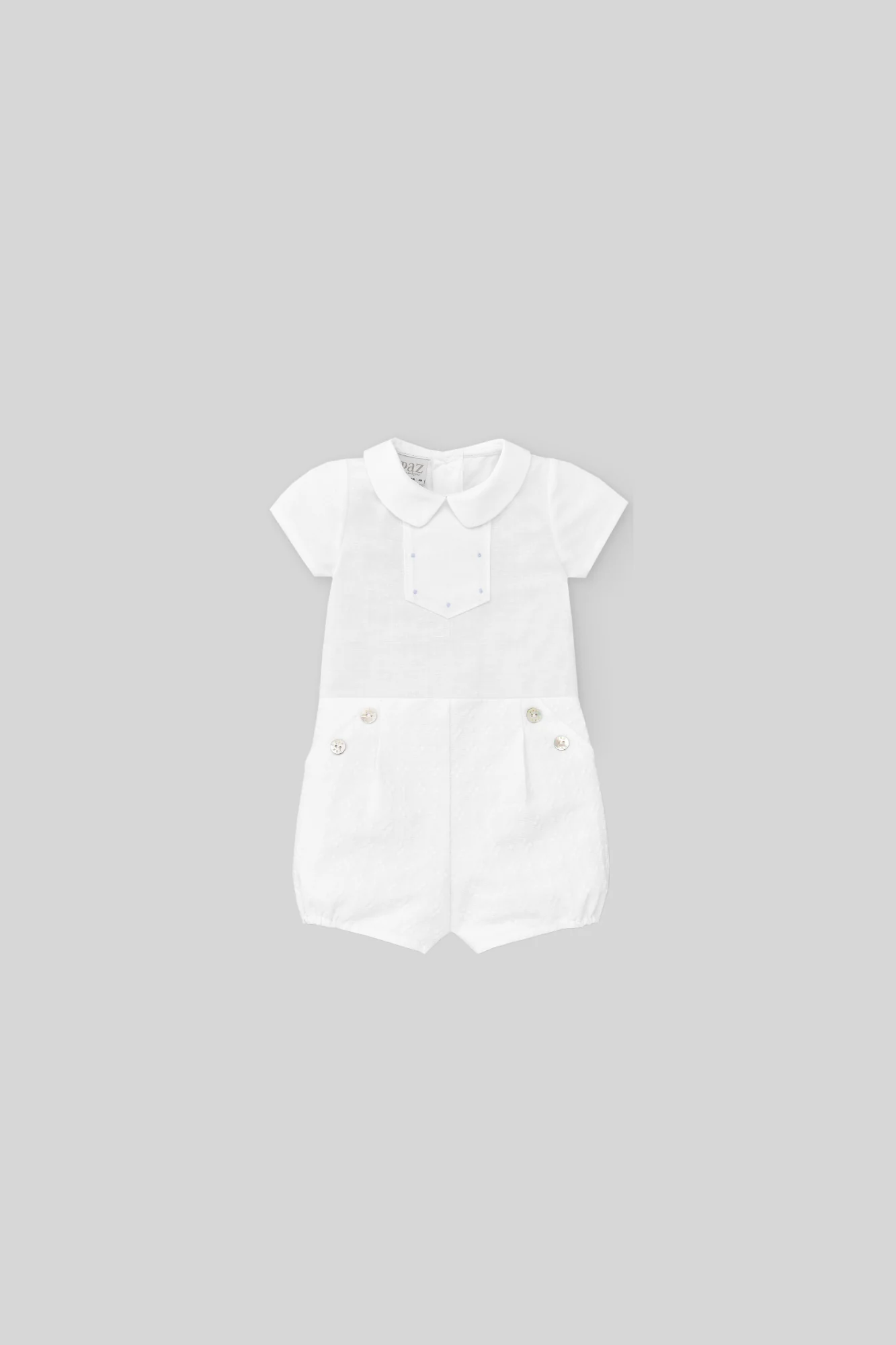 ¡Divino y elegante conjunto de shorts cortos con camisa a juego! ¡Pensado especialmente para las ocasiones mas especiales! Camisa con cuello camisero redondo, botones de nácar en la parte delantera que se adhieren a los pantalones cortos para un acabado limpio. Con cierre de botones por atrás para facilitar su puesta. Shorts cortos con elastico ajustable en la cintura y elastico en pierna para efecto bombacho.
