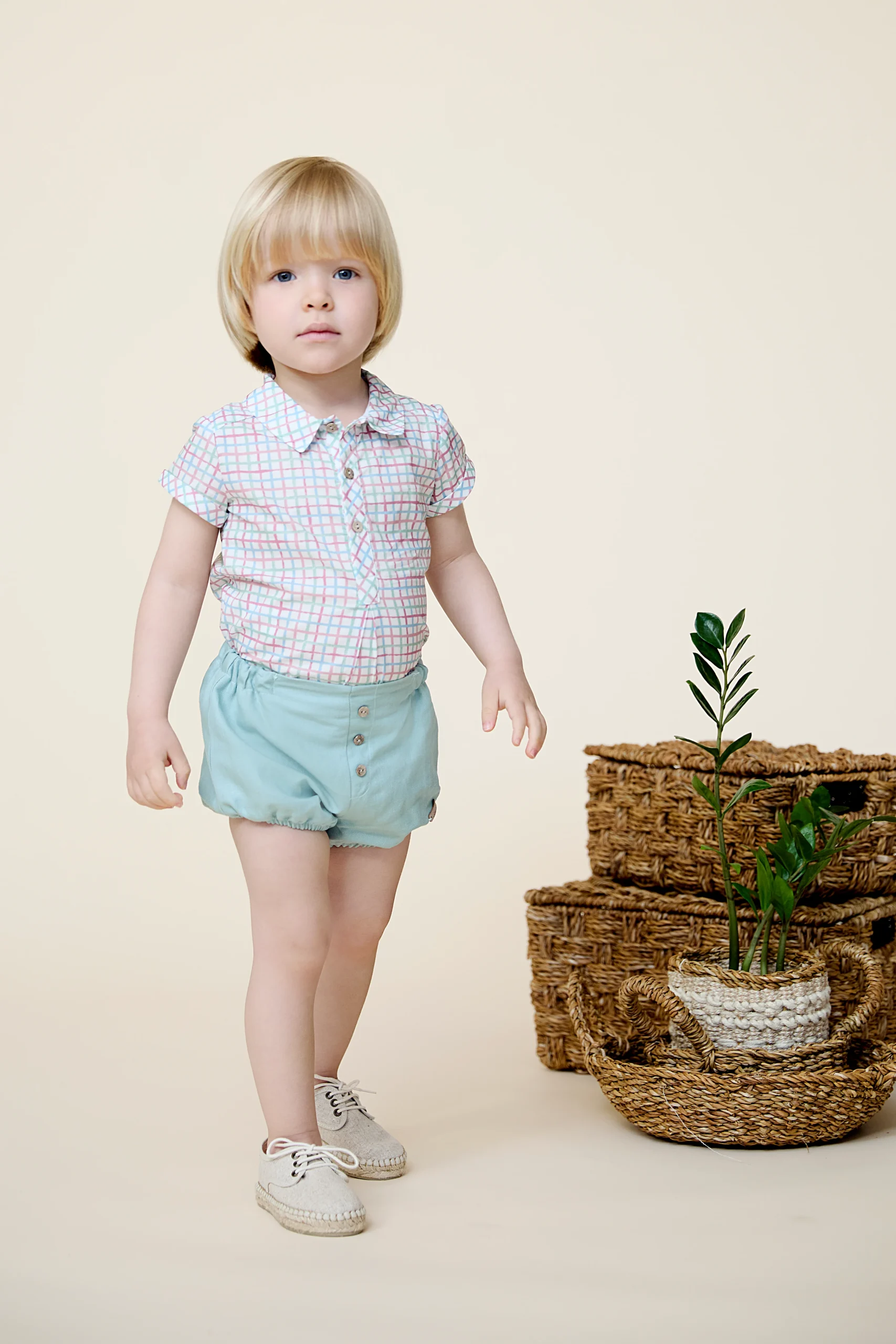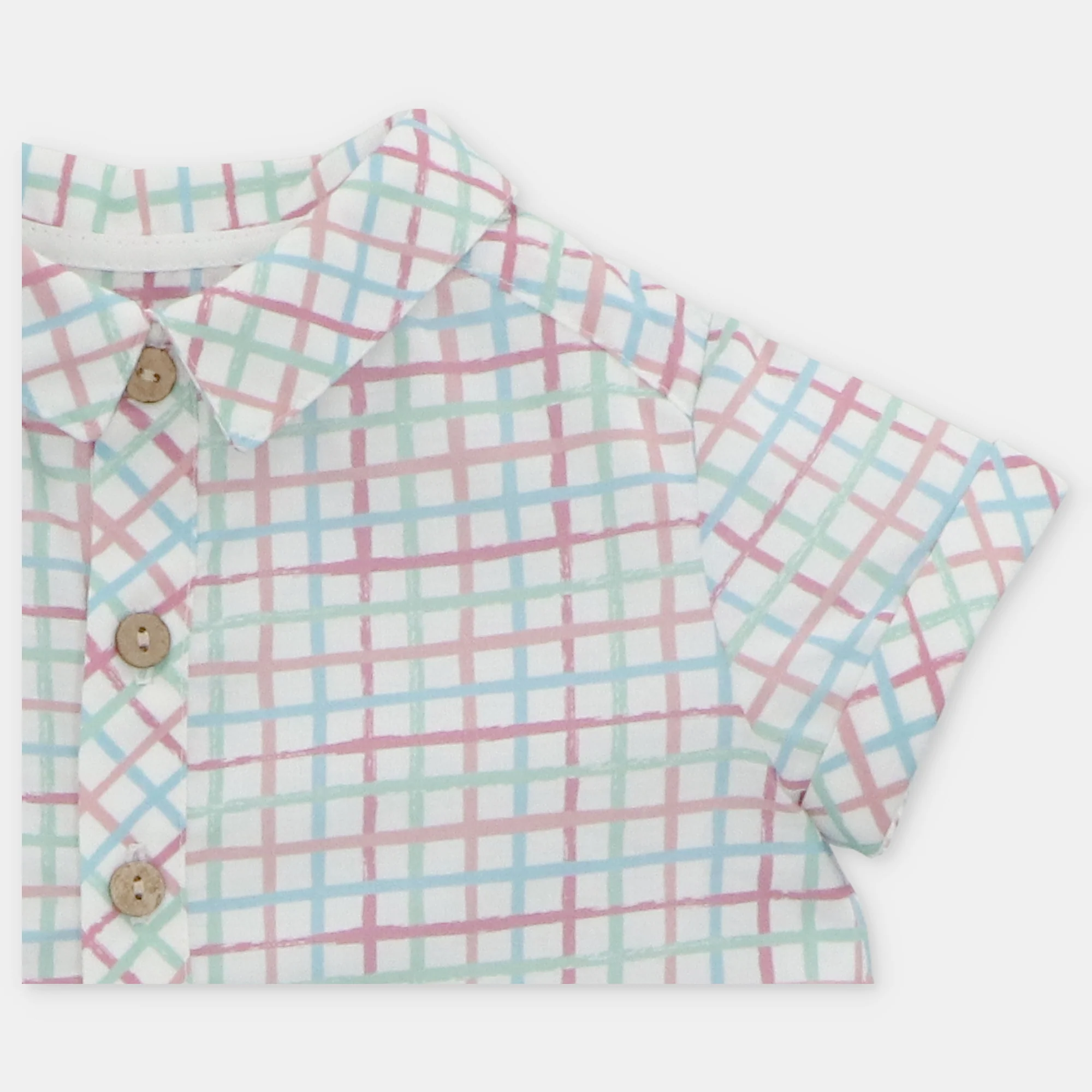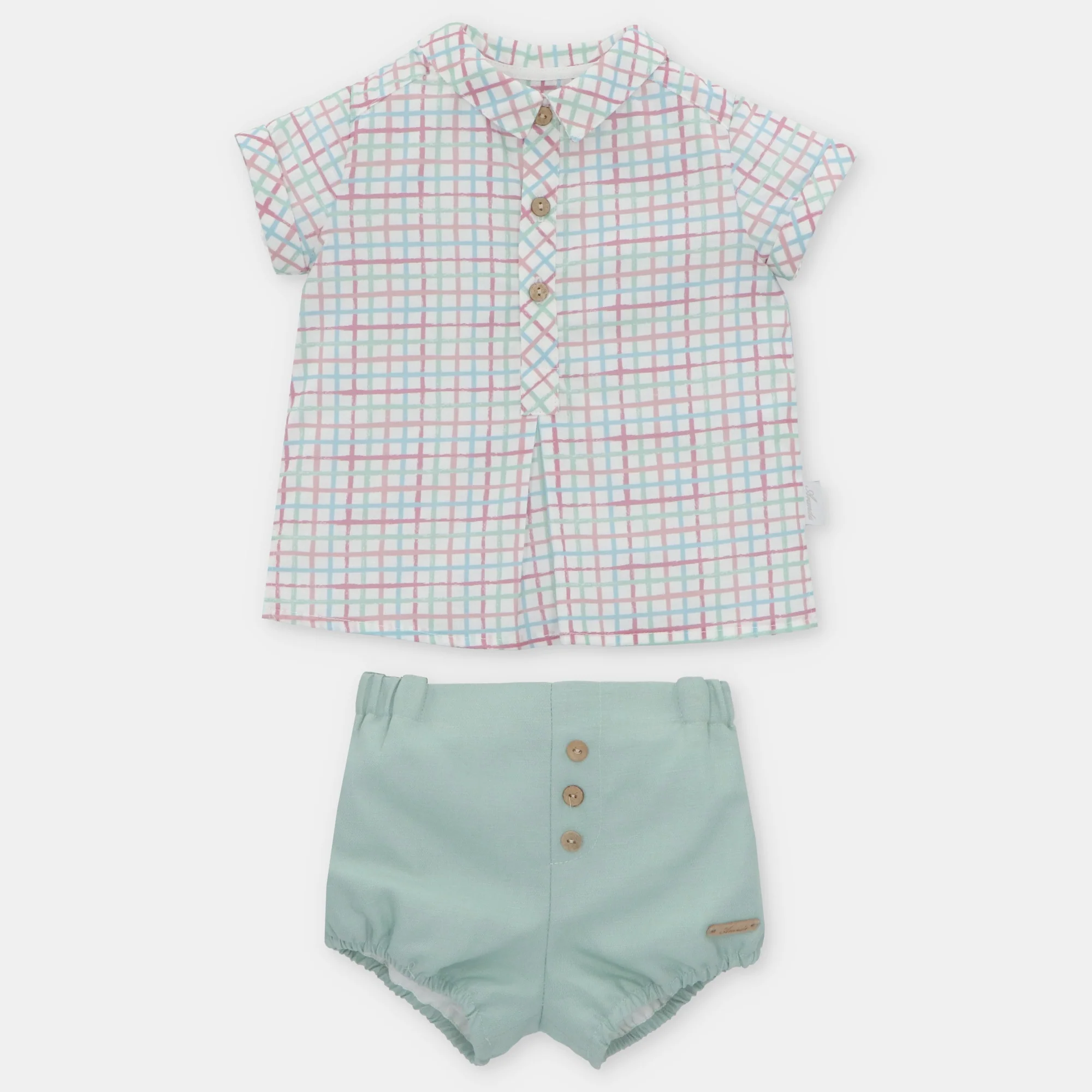 ¡Divino, fresco y elegante conjunto de camisa a cuadros con sus shorts cortos a juego! Camisa de cuello camisero redondo, manga corta y cierre de botones por el frente. Y sus shorts cortos con elastico ajustable en la cintura, cierre de botones frontales y con elastico en piernas para un mejor ajuste. Combinable con varios productos de la misma coleccion.