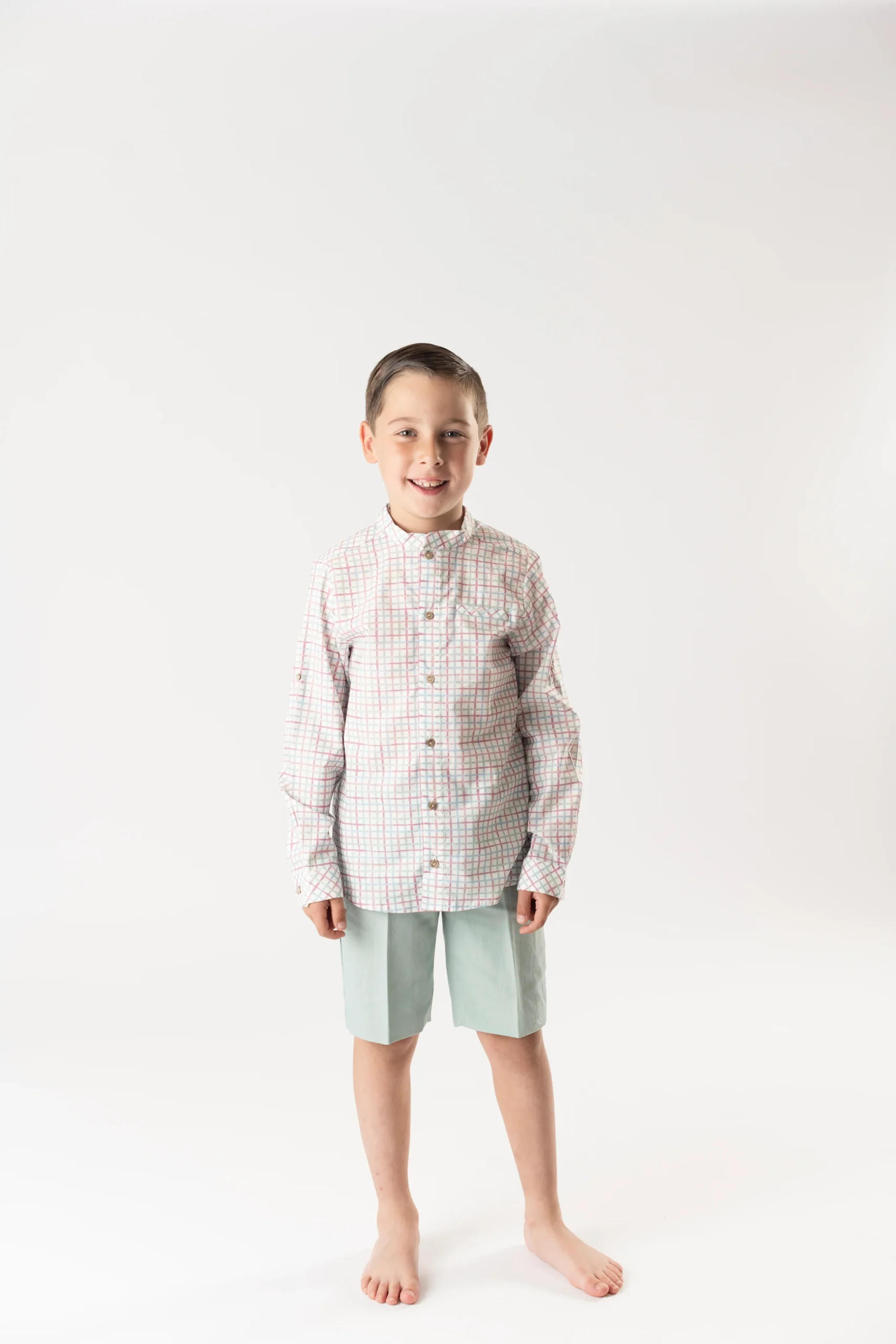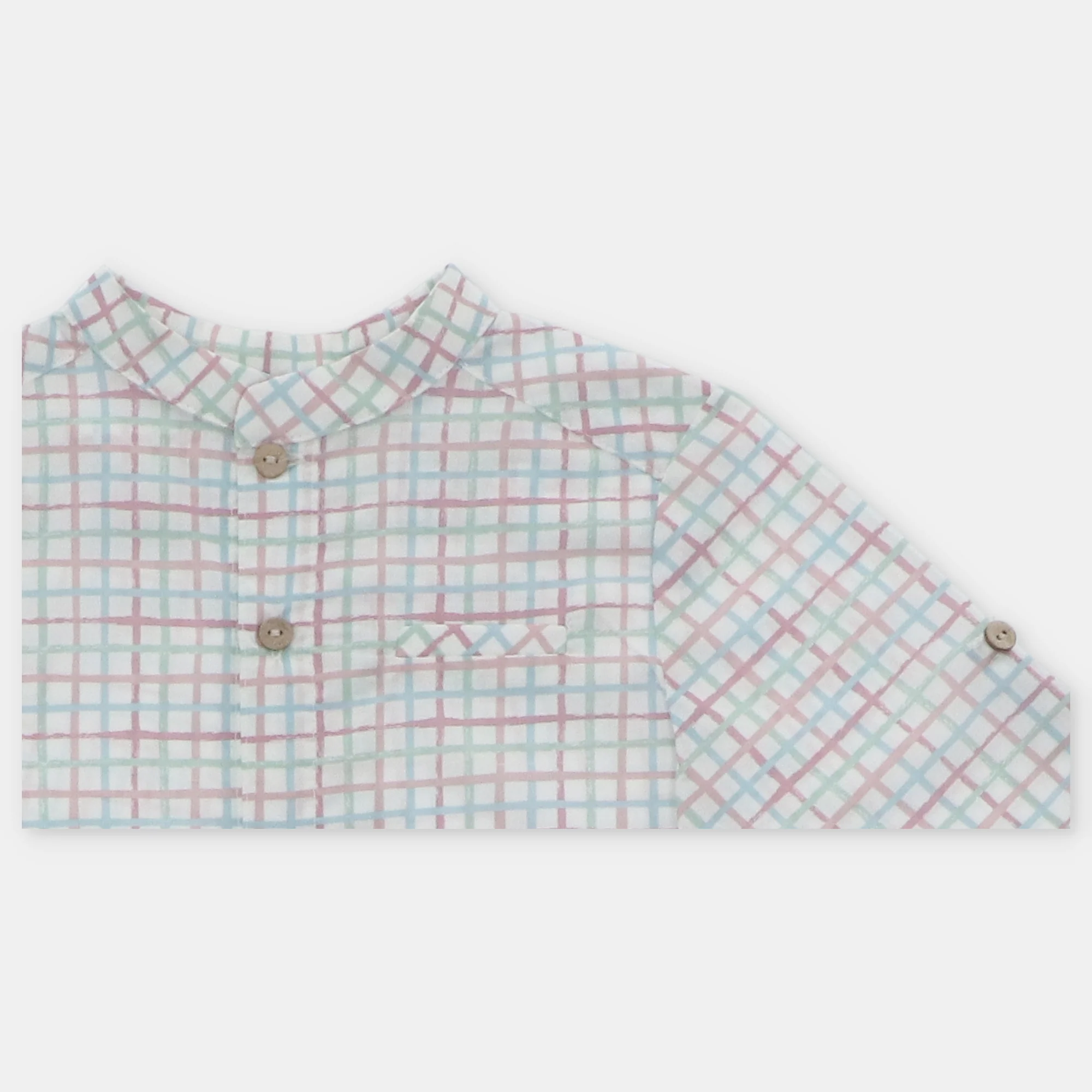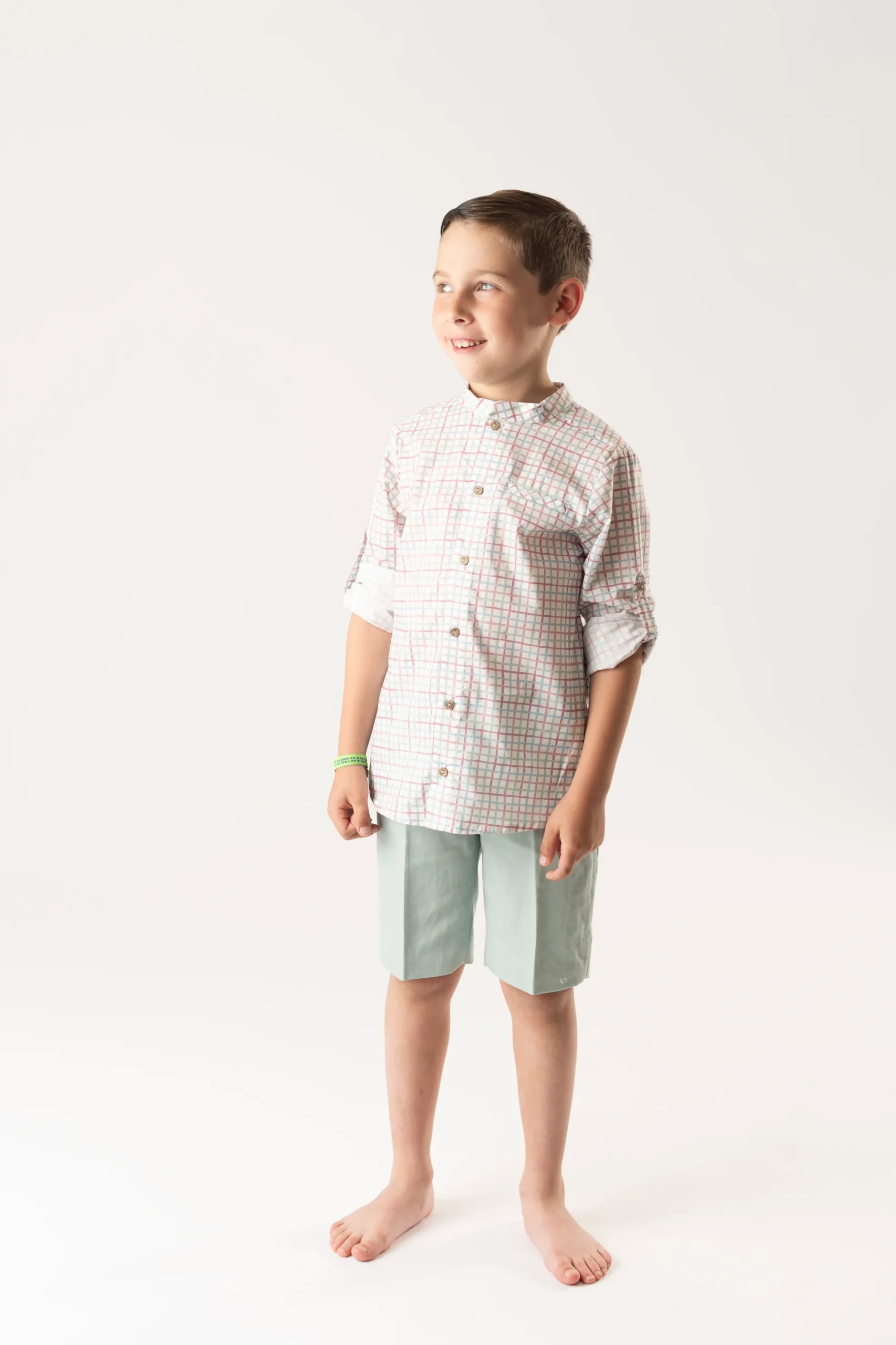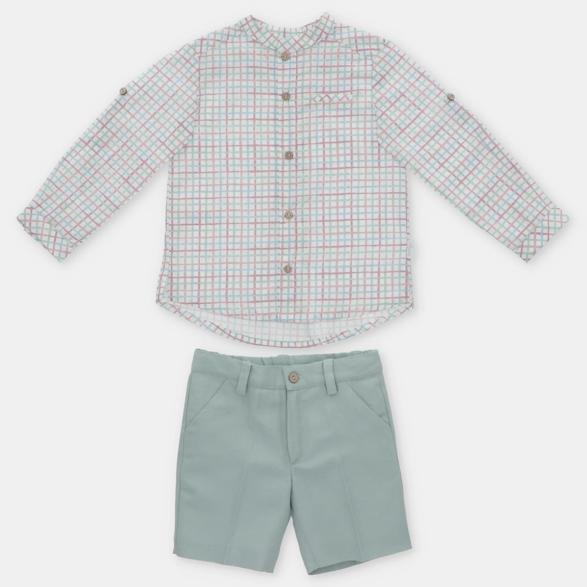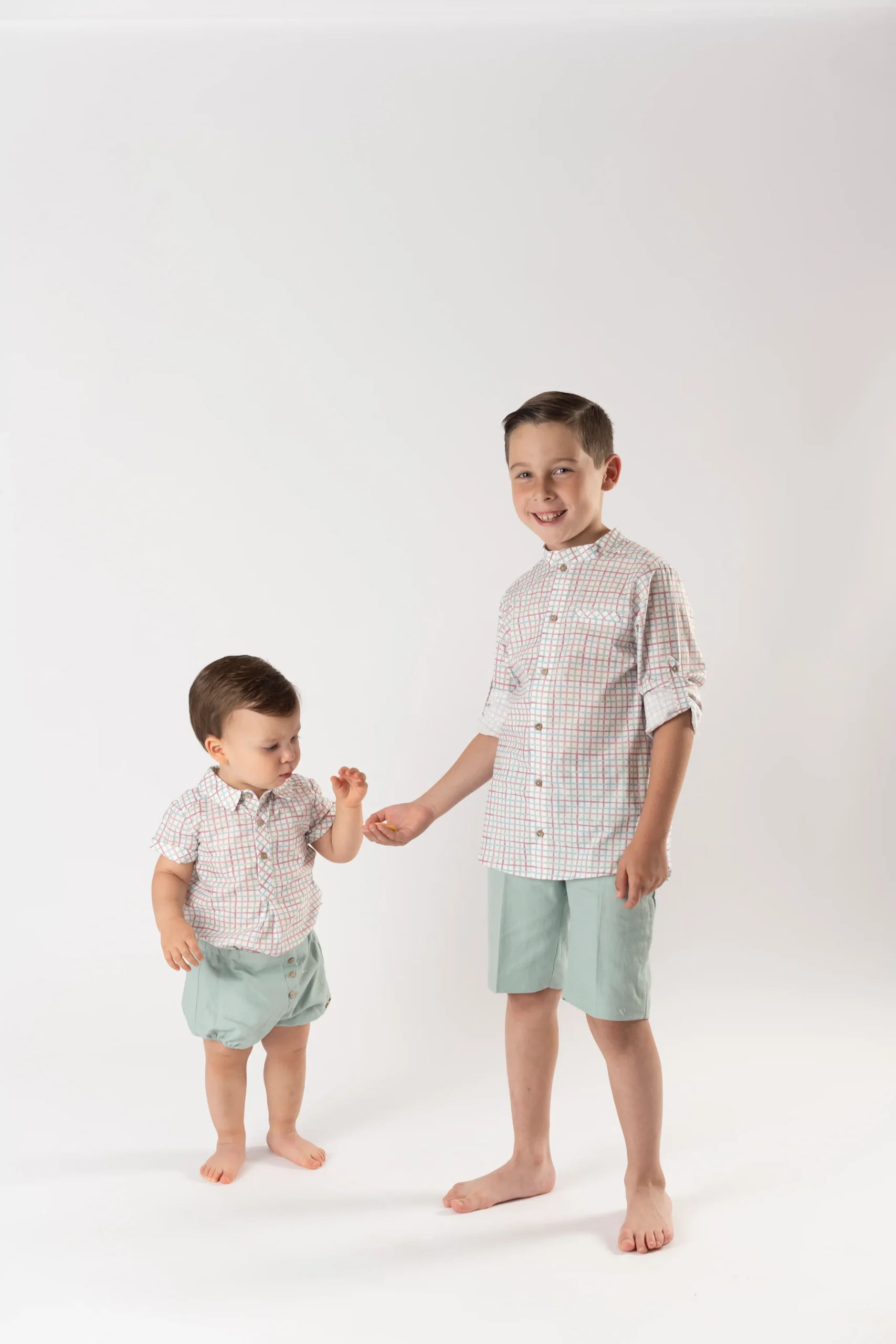 ¡Hermoso y elegante conjunto de camisa y bermudas a juego! Camisa de cuadros, cuello mao, manga larga ajustable con trabilla y cierre de botones por el frente. Bermudas de color liso, cierre de boton y ziper con elastico ajustable en cintura. Combinable con varios productos de la misma coleccion.