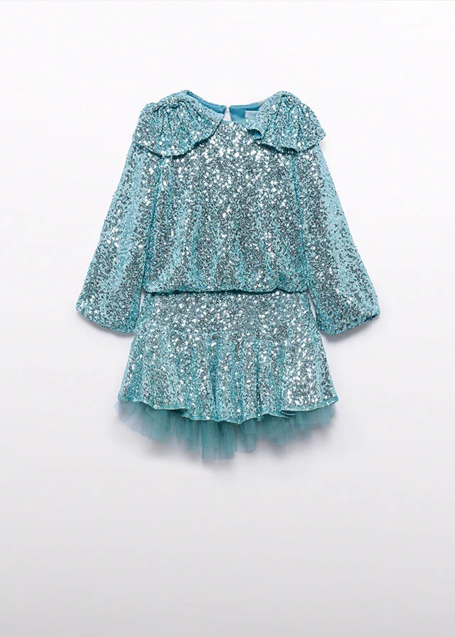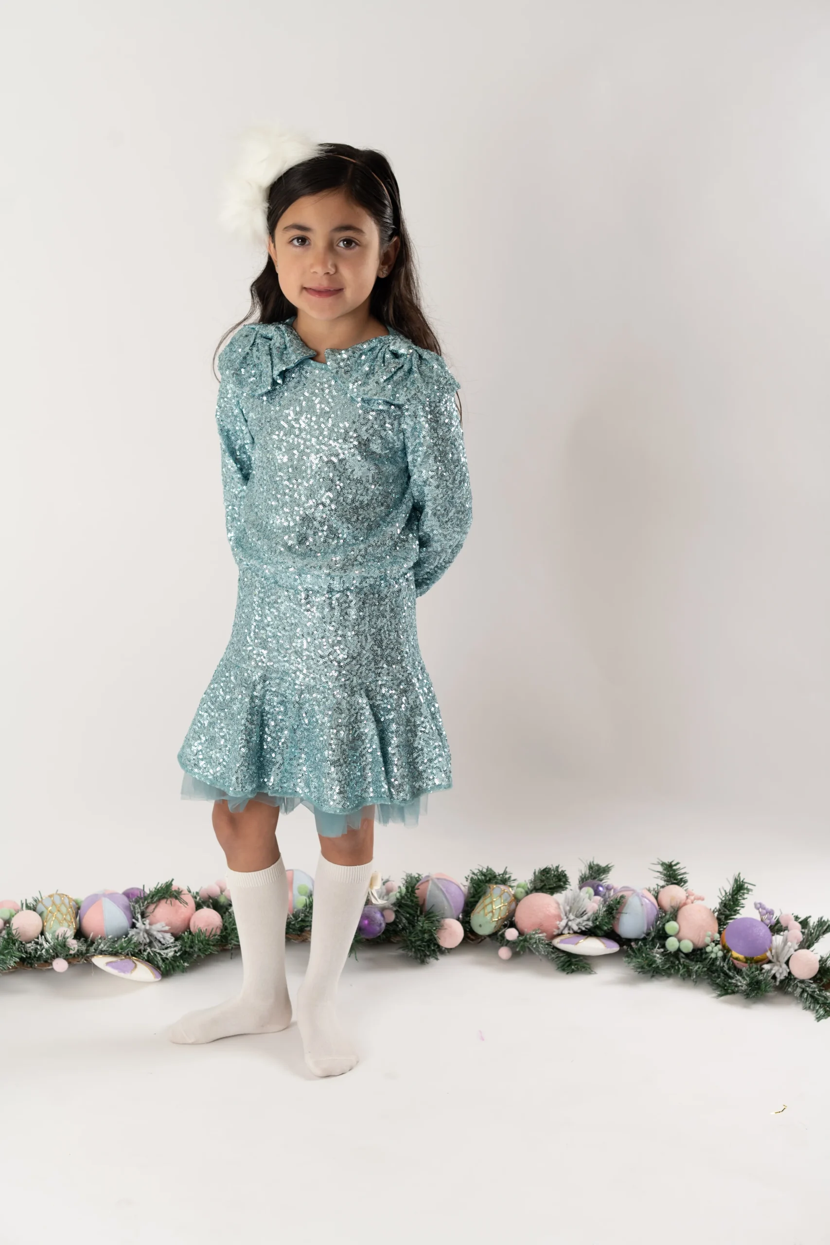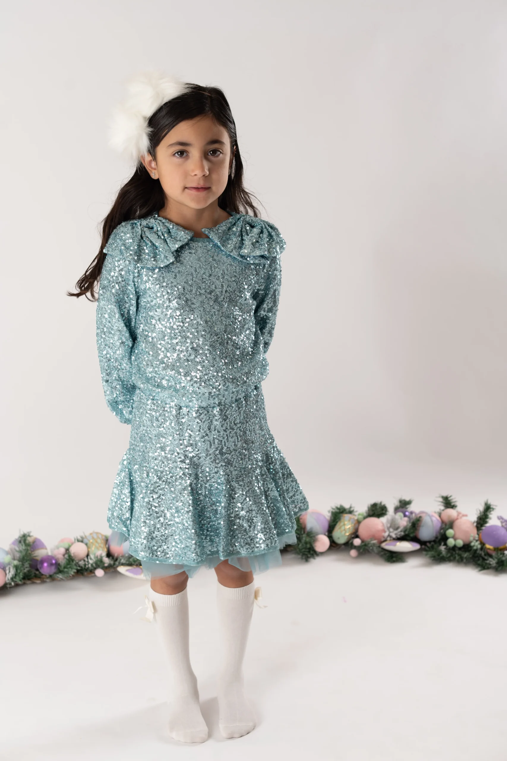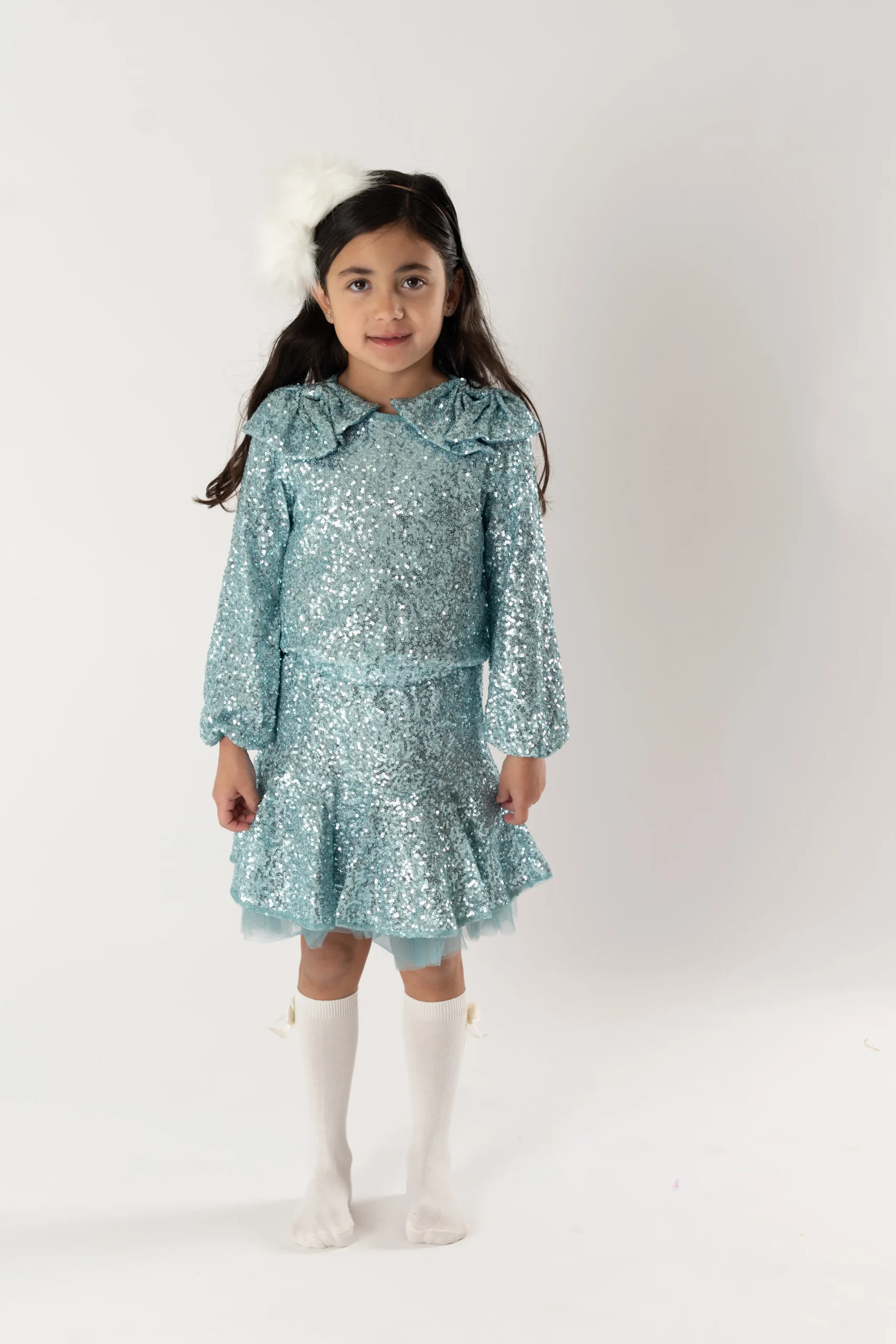 ¡Divino conjunto de lentejuelas de blusa con su falda a juego! ¡Con detalles que lo hacen lucir chic y elegante! Blusa de cuello redondo, manga larga, hombreras, bajo con elastico para mejor ajuste, cierre de unico boton por atras y su falda a juego con elastico en la cintura para un mejor ajuste y crinolina para efecto mas voluminoso.