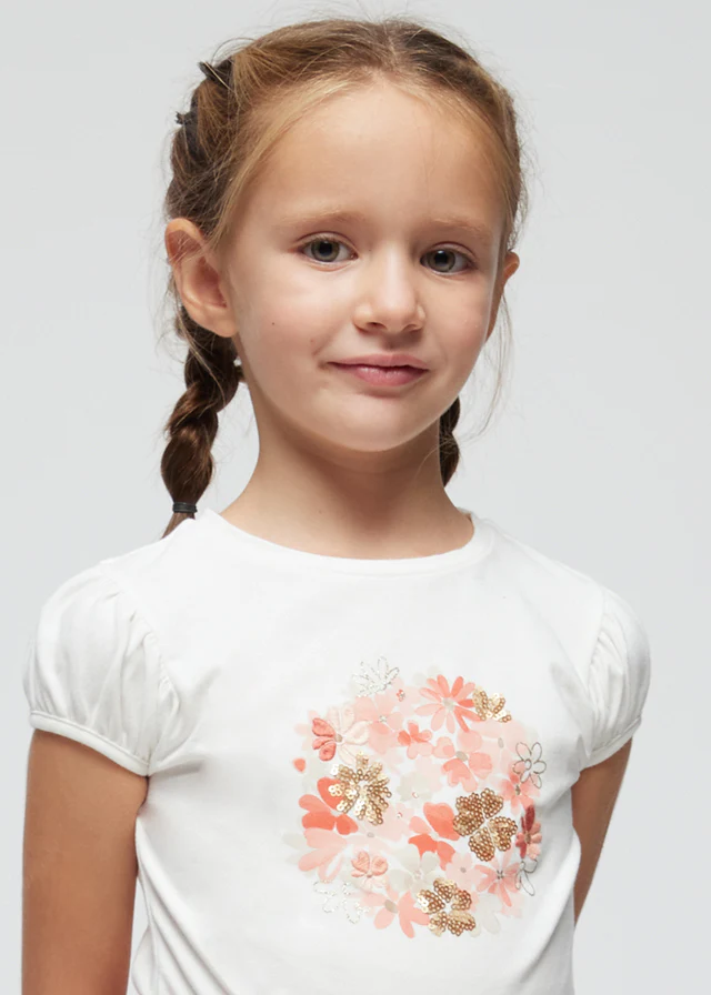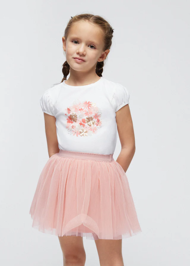 ¡Hermoso y divino conjunto de blusa con falda a juego! ¡Con detalles que lo hacen lucir chic y elegante! Blusa de cuello redondo, manga corta, dibujo estampado frontal con lentejuelas bordadas y su falda de tul con elastico en la citnura para un mejor ajuste.