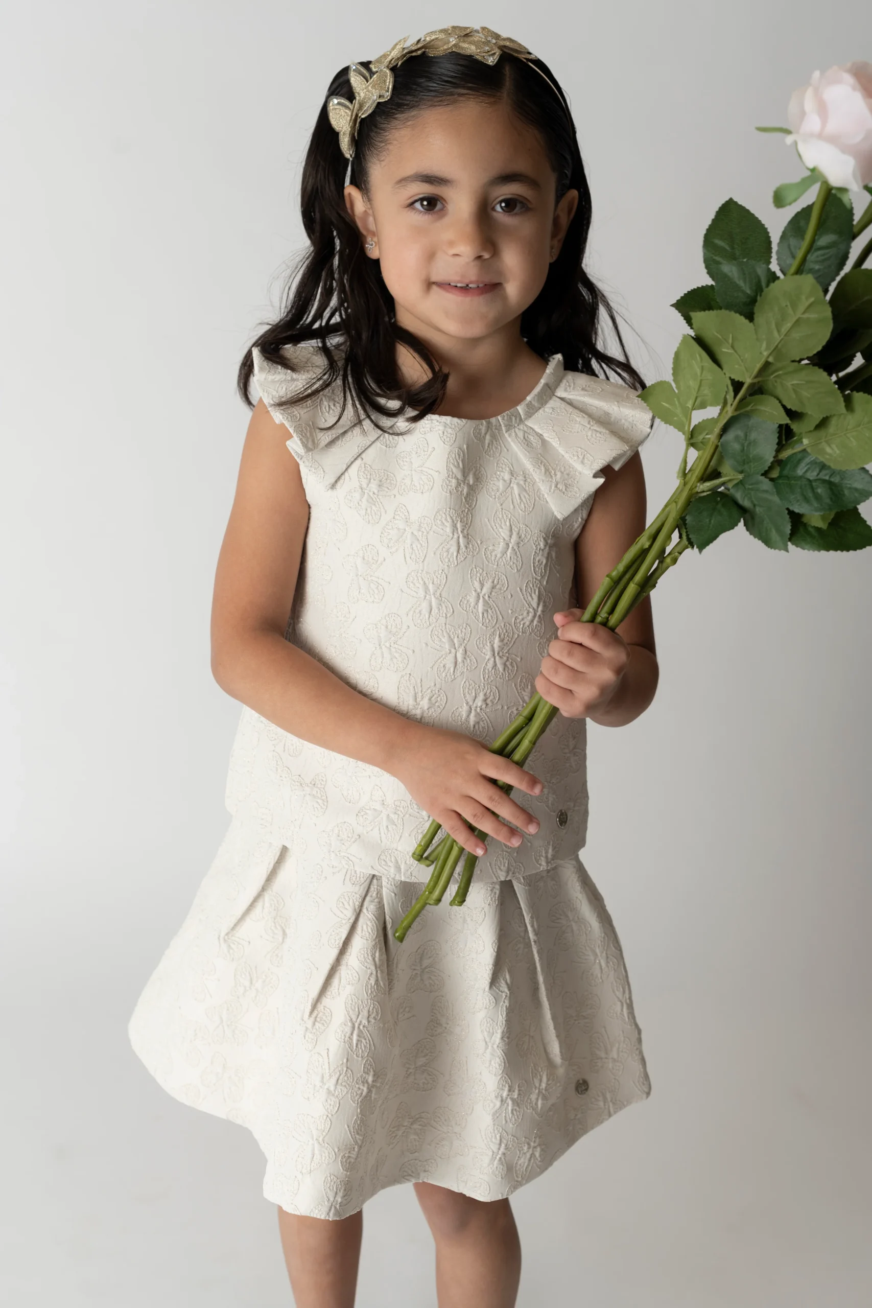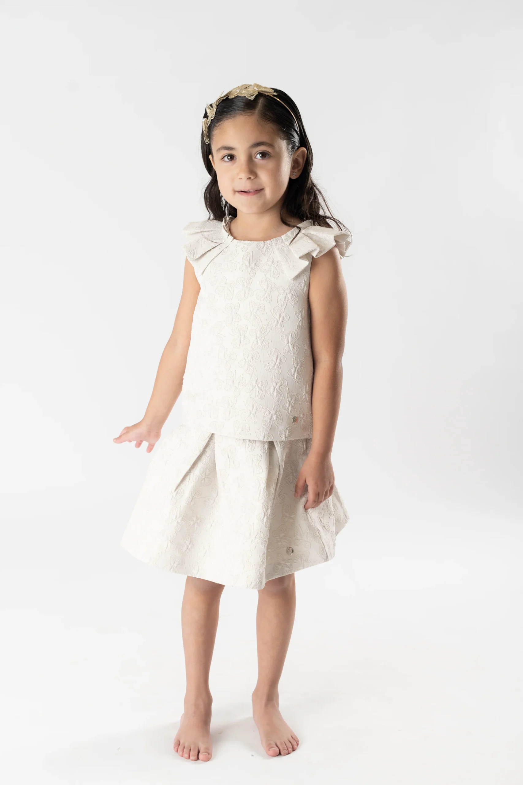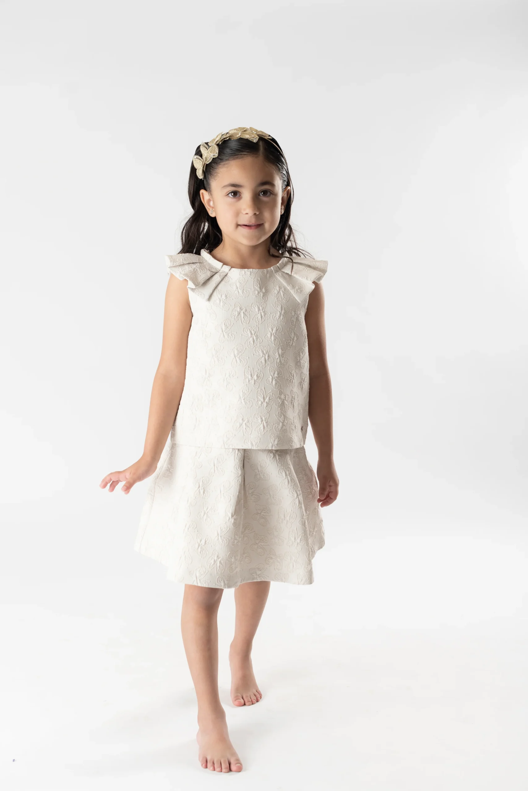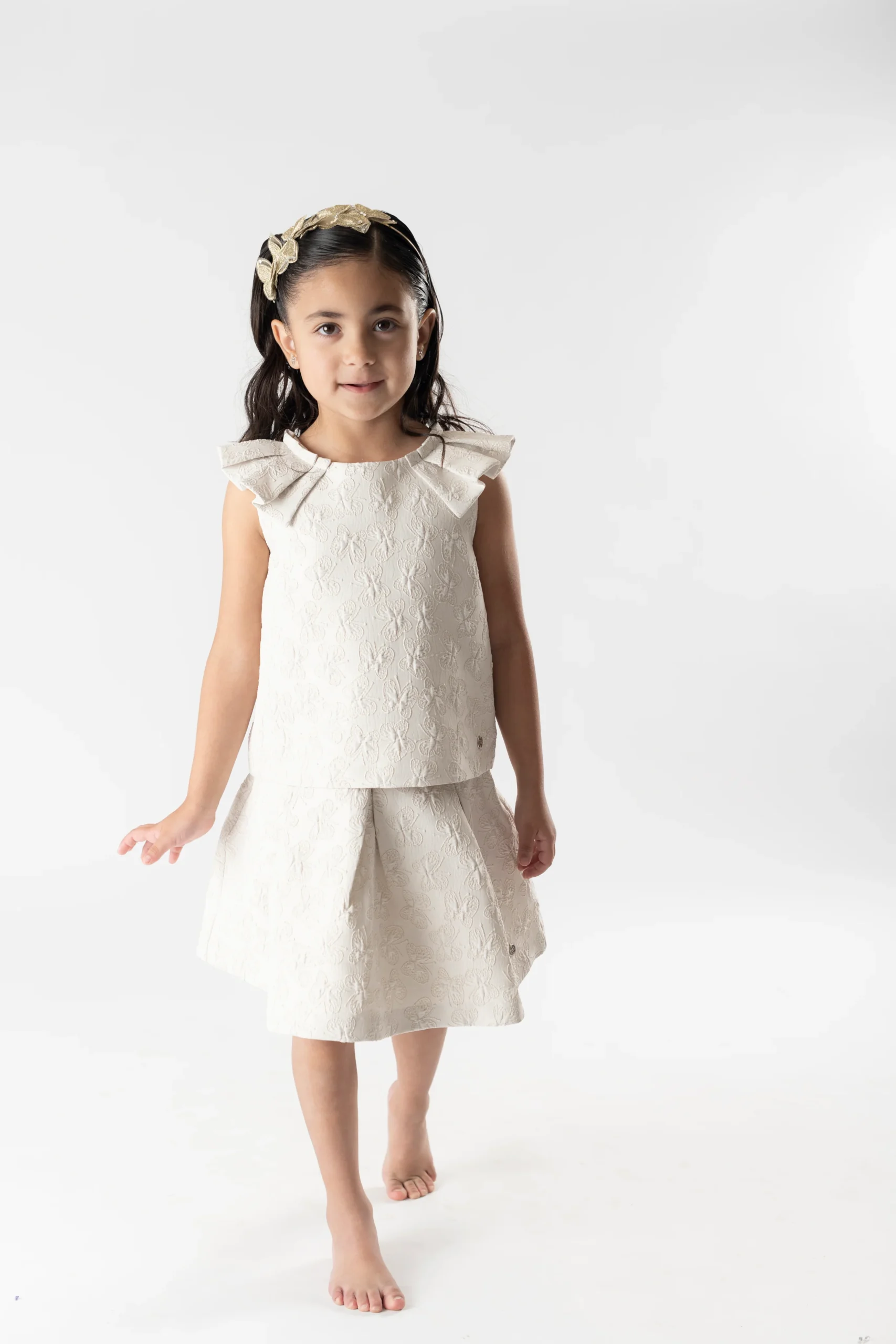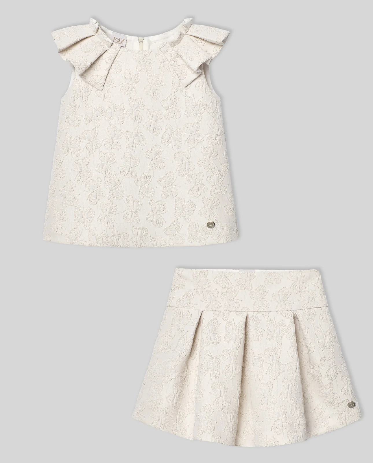 ¡Elegante y divino conjunto de blusa con falda a juego! ¡Con detalles que lo hacen lucir chic y elegante! Blusa de cuello redondo, sin mangas con detalle de tablones, hermoso detalle bordado en la tela de mariposas, cierre de ziper por atras y su falda a juego con tablones, mismo detalle bordado en la tela de mariposas y cierre de ziper por atras.