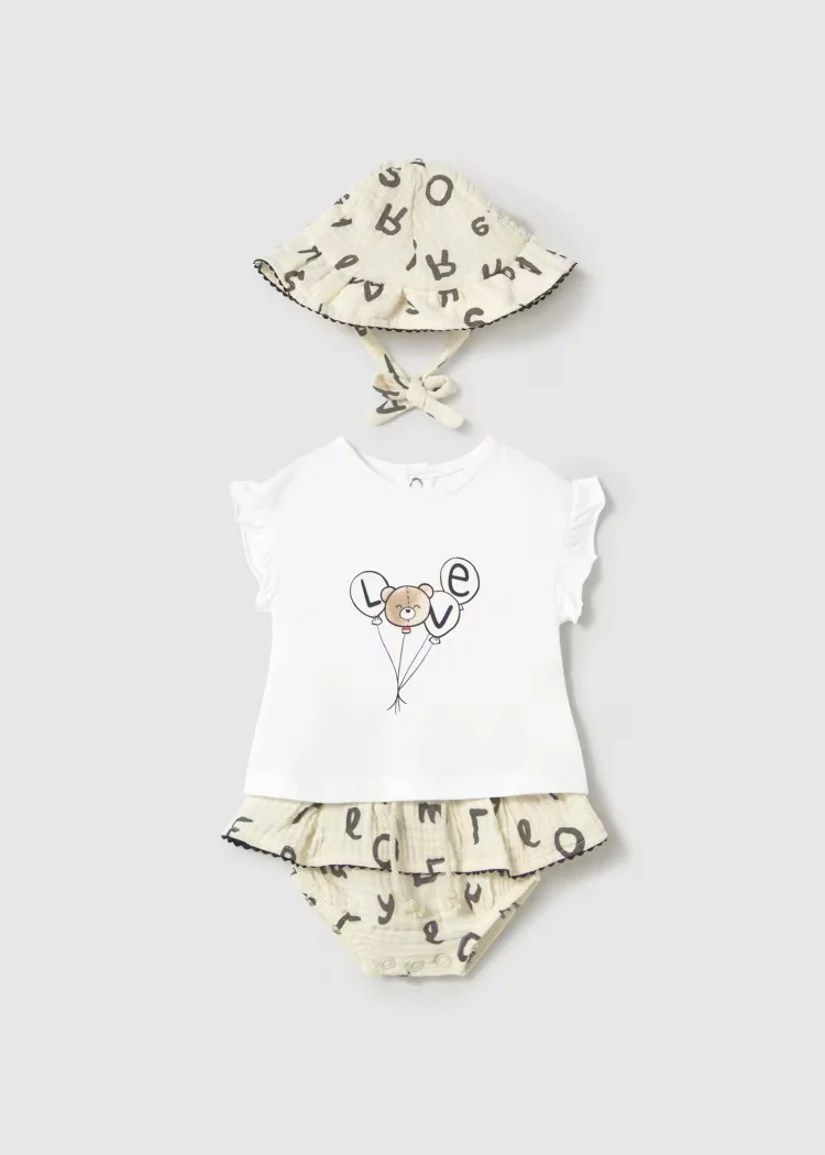 ¡Divino y tierno conjunto de 3 piezas a juego! Blusa con dibujo etsampado, cuello redondo y manga corta. Con su calzoncito a juego con olan, cierre de botones a presion en la entrepierna para facilitar el cambio de pañal, de tela tipo de lino. Y su gorro a juego, con lazos con velcro para mayor sujeción ¡El look mas completo para las pequeñas!