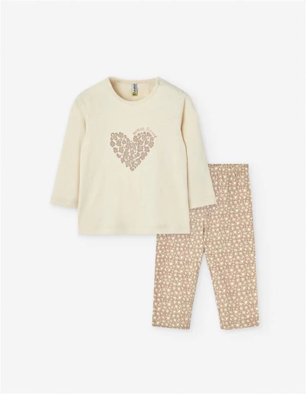 ¡Basico y comodo conjunto de blusa con sus leggings a juego! Blusa de cuello redondo, manga larga, dibujo frontal estampado, cierre de botones a presion por el hombro para facilitar su puesta. Con sus leggings a juego de estampado con elastico en la cintura para un mejor ajuste.