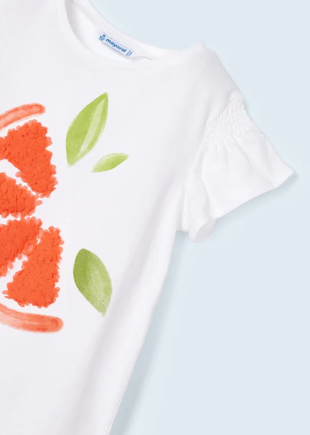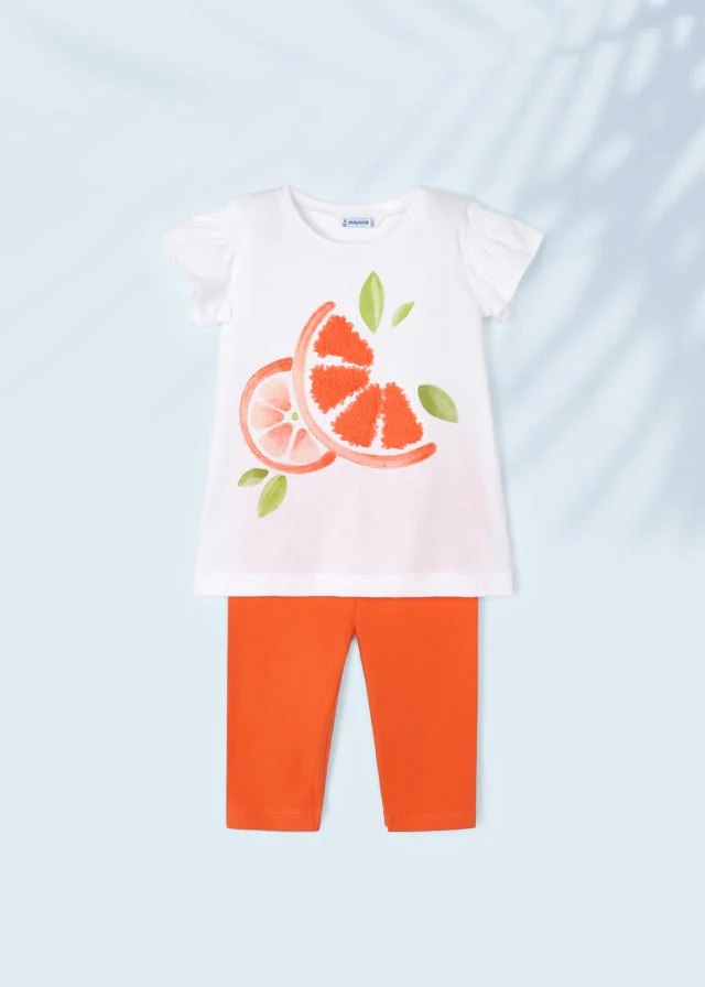 ¡Divino conjunto de blusa con sus leggings a juego! Blusa de manga corta, cuello redondo y dibujo estampado con detalle bordado con textura. Con sus leggings a juego, con elástico en la cintura para un mejor ajuste.