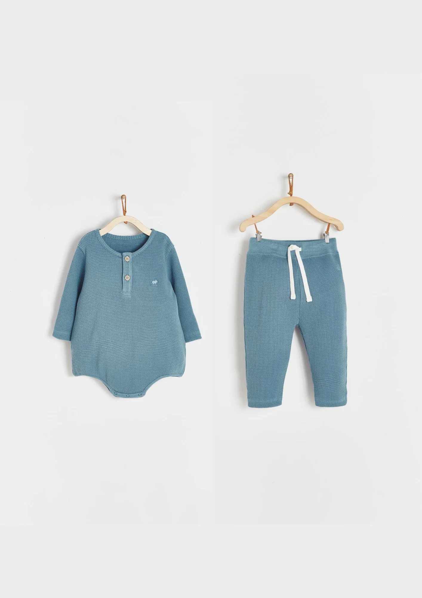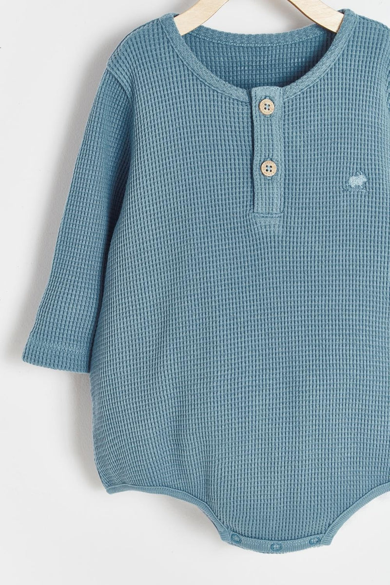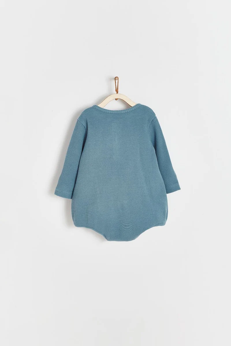 ¡Comodo y basico conjunto de body con pantalon de tela tipo waffle! Body de cuello redondo, manga larga, botones en el cuello para facilitar su puesta y cierre de botones a presion en la entrepierna. Pantalones con cordon ajustable en cintura. 100% algodon suave, ajustable y elástico para mayor comodidad.