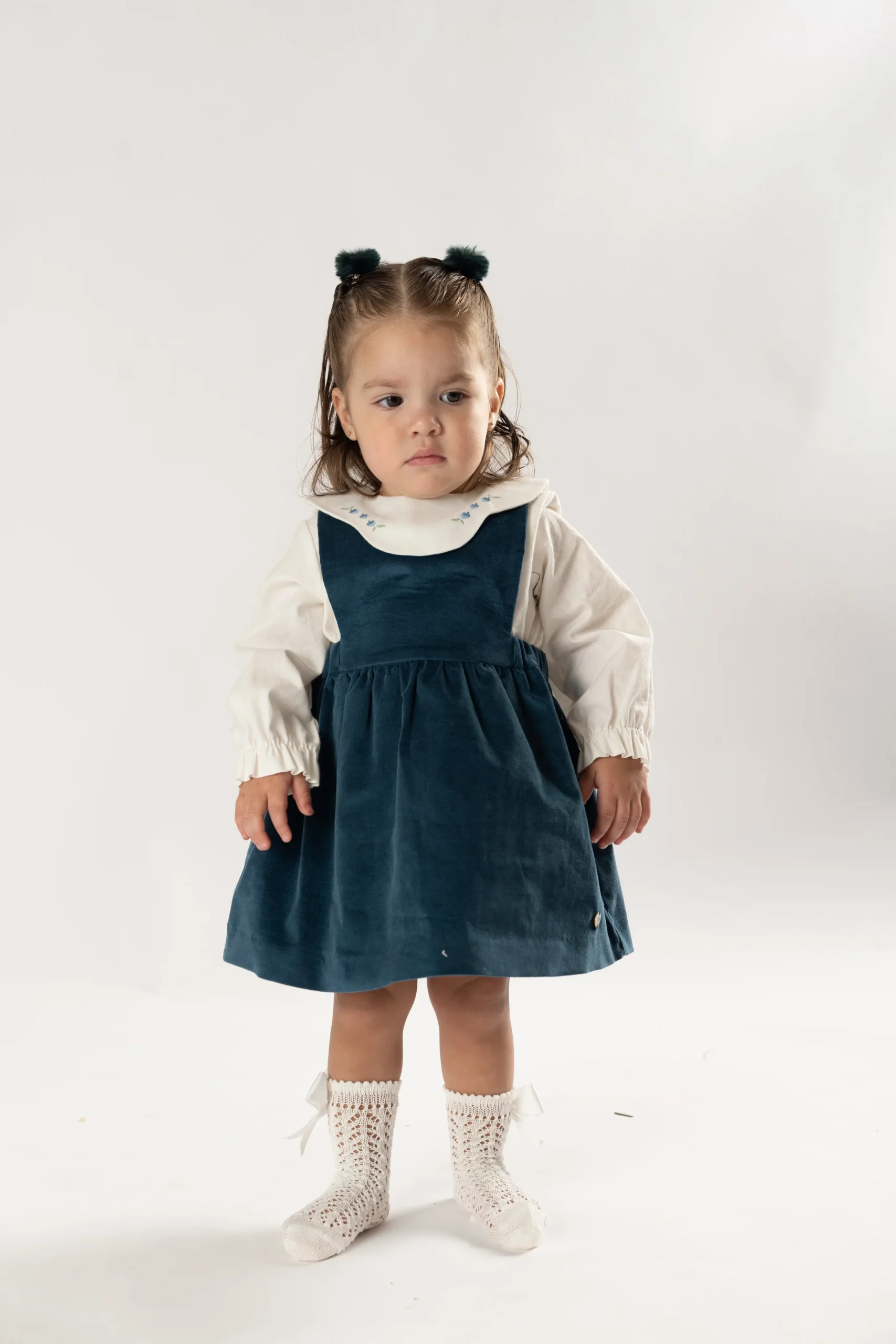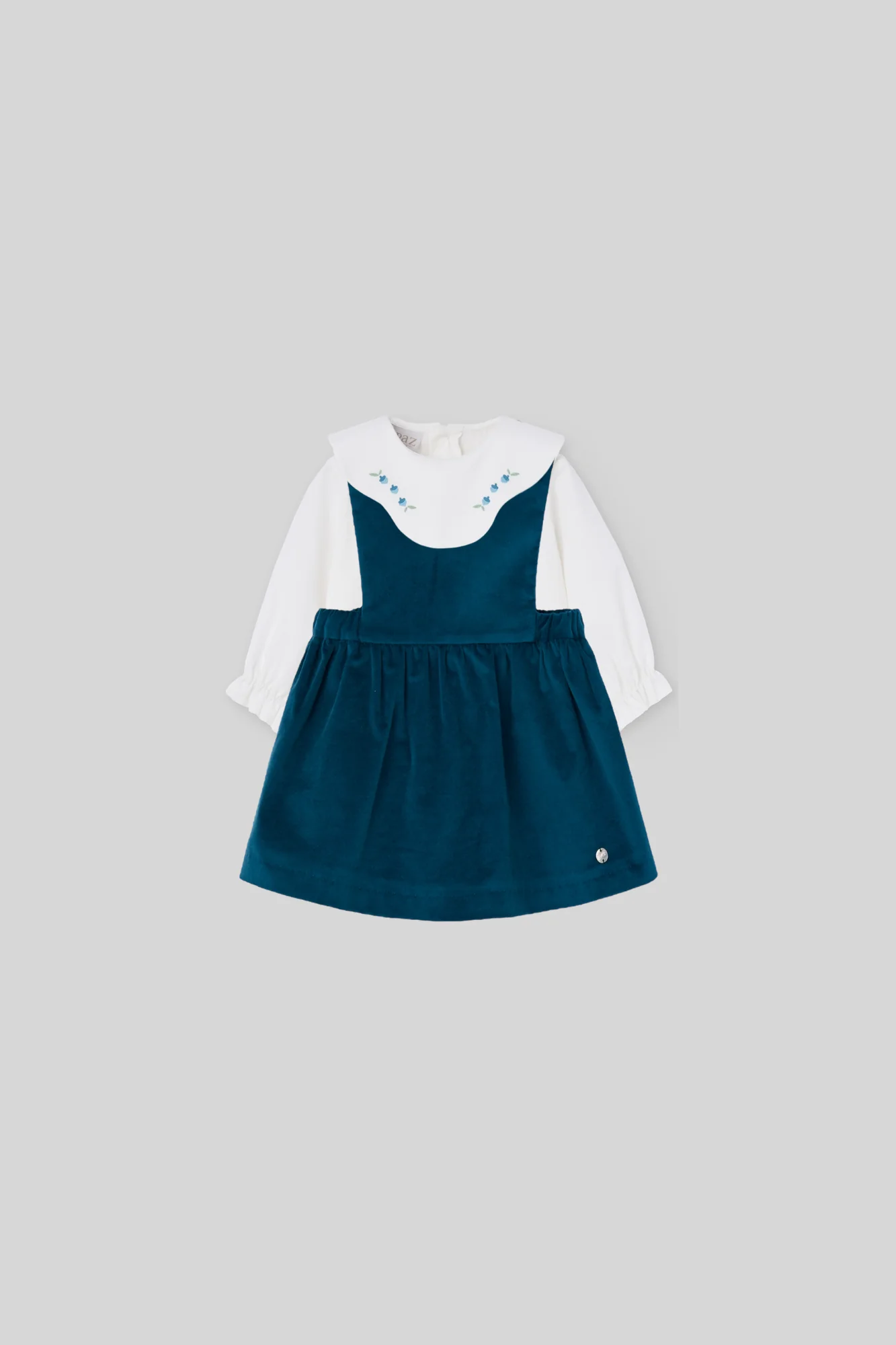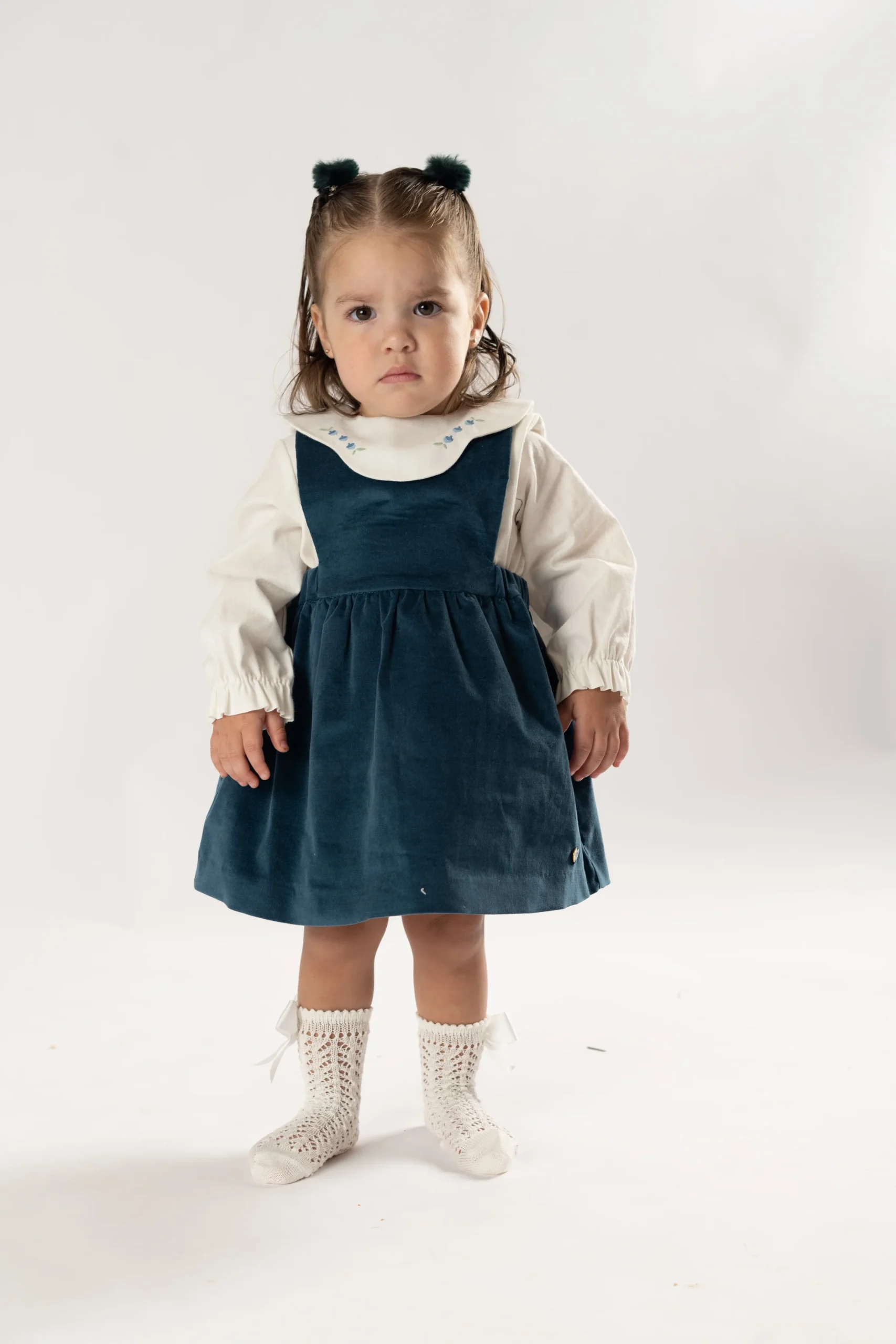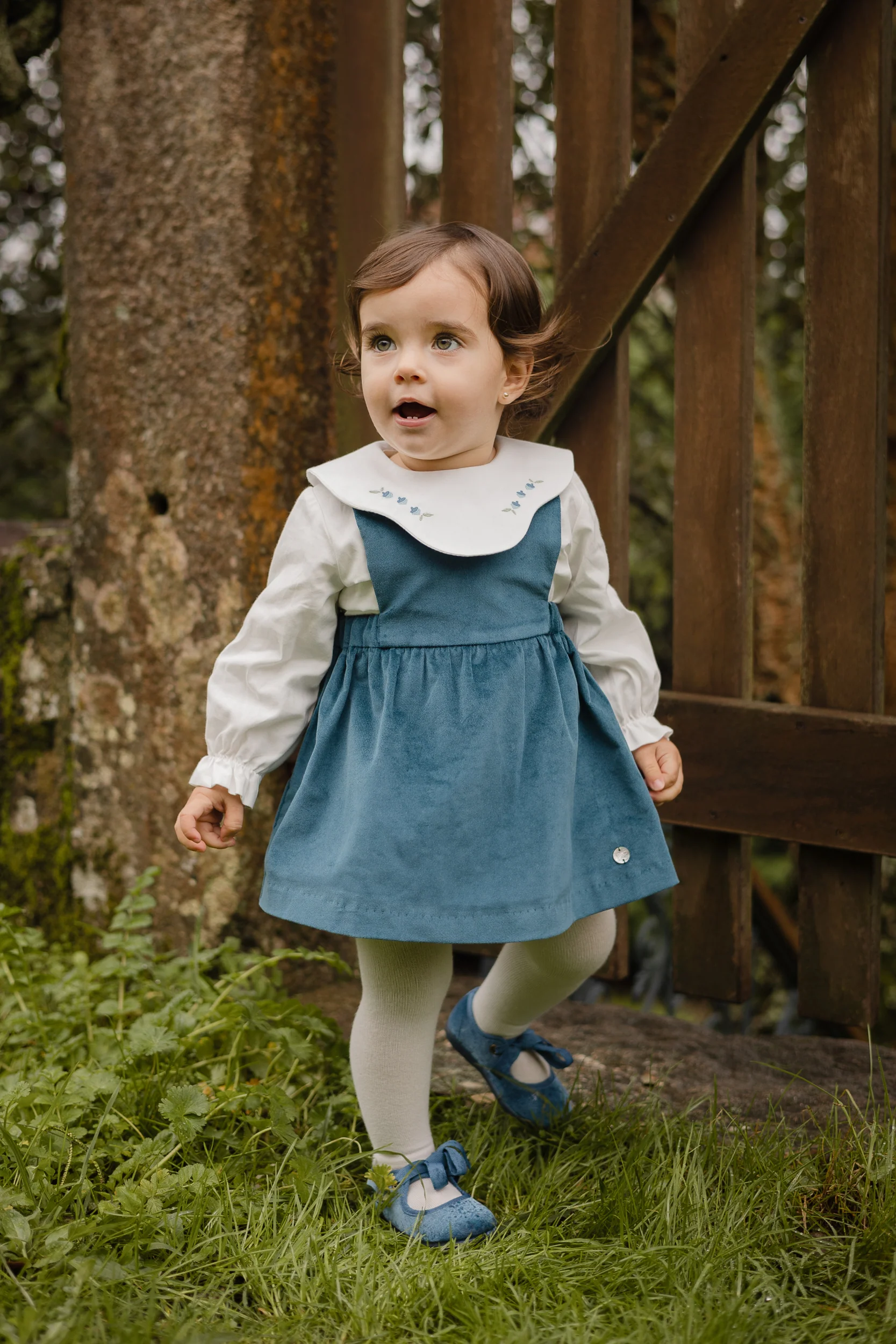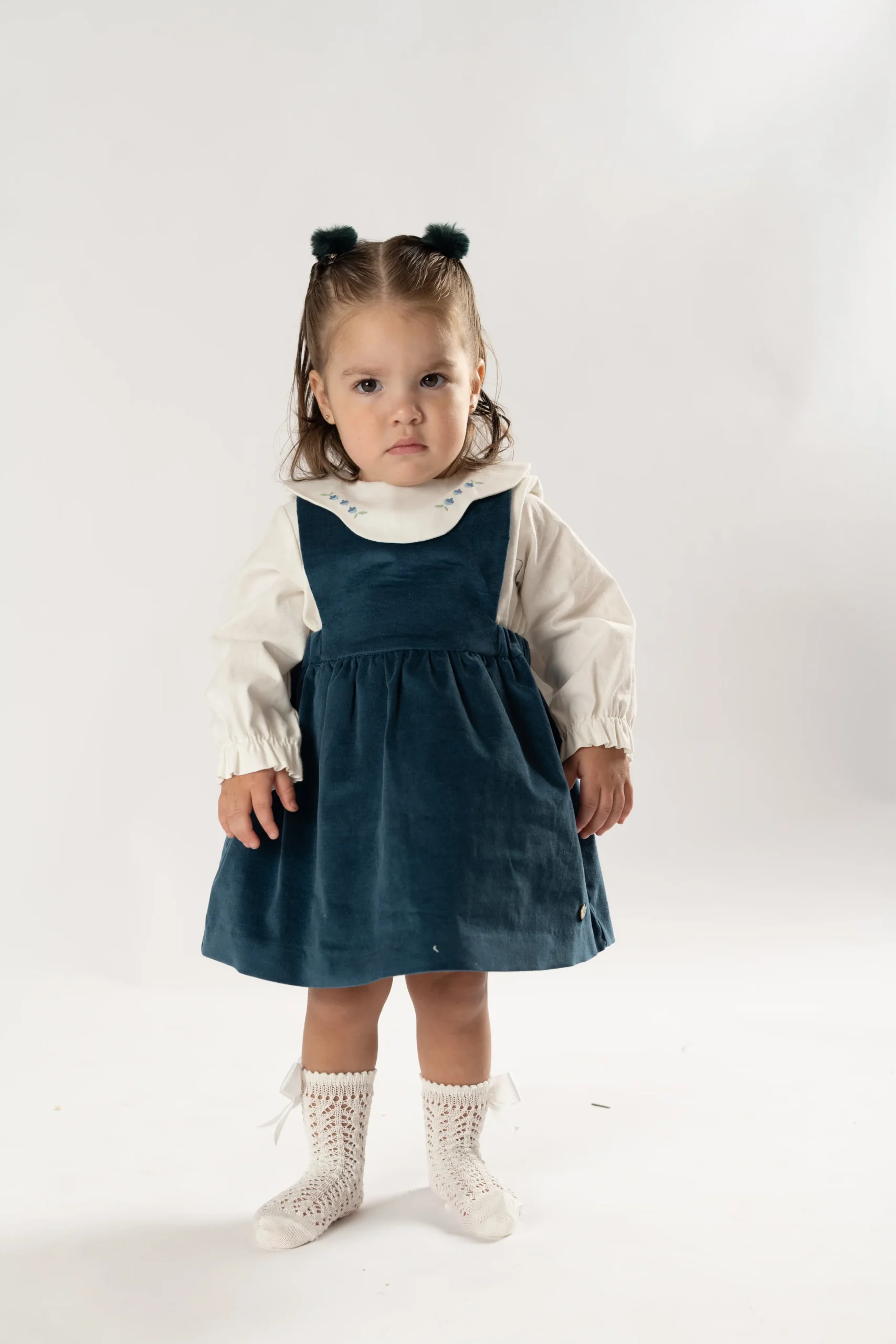 ¡Divino conjunto de jumper de falda con su blusa a juego! ¡Un conjunto clasico y versatil pensado para todo tipo de ocasion! Jumper de tirantes anchos y falda fruncida, cierre de ziper trasero invisible para facilitar su puesta. Tela de pana. Y con su blusa a juego de cuello con babero, detalle de bordado, manga larga con puños elasticos y cierre de botones por atras.