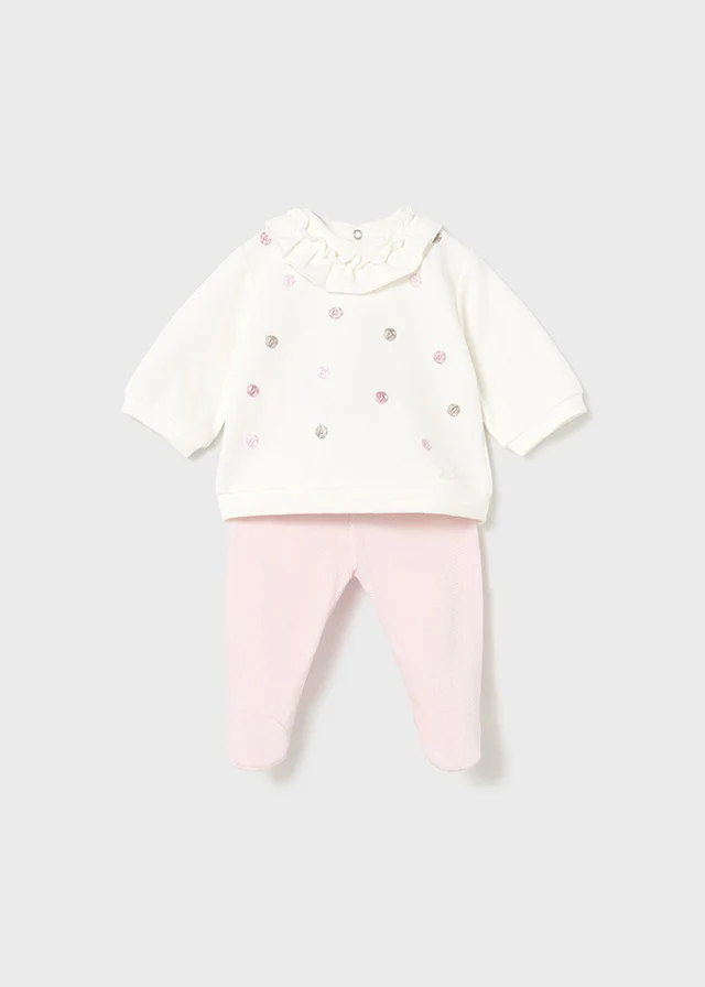 ¡Encantador conjunto afelpado de dos piezas a juego! Parte de arriba de manga larga, cuello con olan, detalle de bordados frontales, cierre con botones a presión en la parte posterior. Y con sus pantalones con pies a juego y elastico en la cintura.