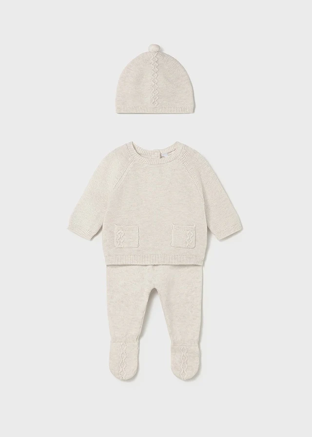 ¡Hermoso y tierno conjunto tejido de 3 piezas a juego! Parte de arriba tejida de punto con relieve, cuello redondo, manga larga y sus pantalones a juego, elastico en la cintura para mejor ajuste. Y su gorrito a juego, un accesorio combinable y versátil, ideal como complemento de cualquier look.
