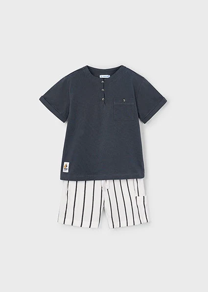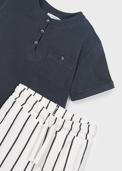 ¡Vestidor conjunto de camiseta con sus bermudas a juego! ¡Un conjunto muy versatil pensado para cualquier tipo de ocasion! Camiseta de cuello redondo, manga corta, botones por el frente, detalle de bolsillo y sus bermudas de rayas a juego con cordon ajustable en la cintura.