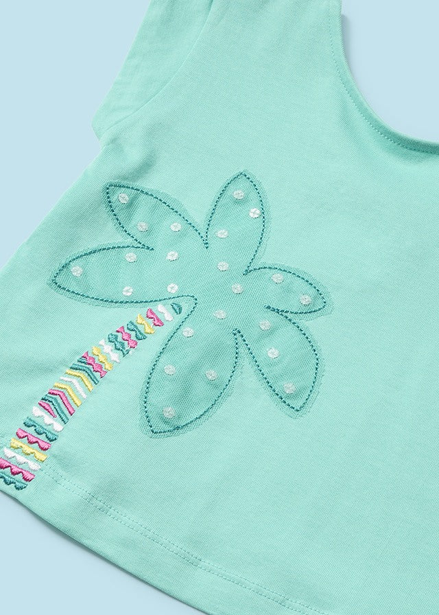 ¡Hermoso, comdo y fresco conjunto de blusita y short a juego! ¡Las niñas no querran quitarsela! Blusa de manga corta, cuello redondo, dibujo con bordado, detalle de abertura por la espalda y con sus short a juego en color liso con elastico en la cintura para mayor ajuste.