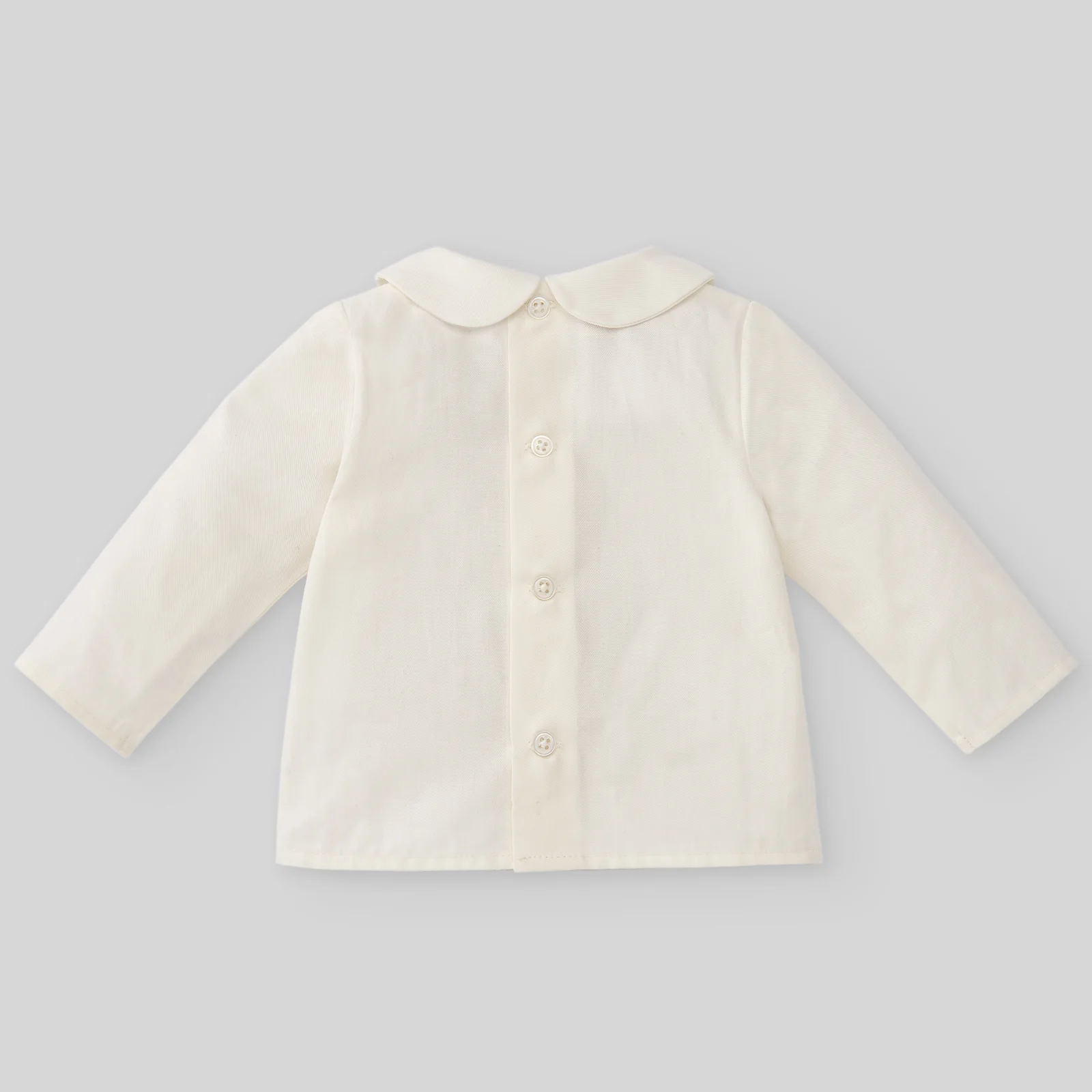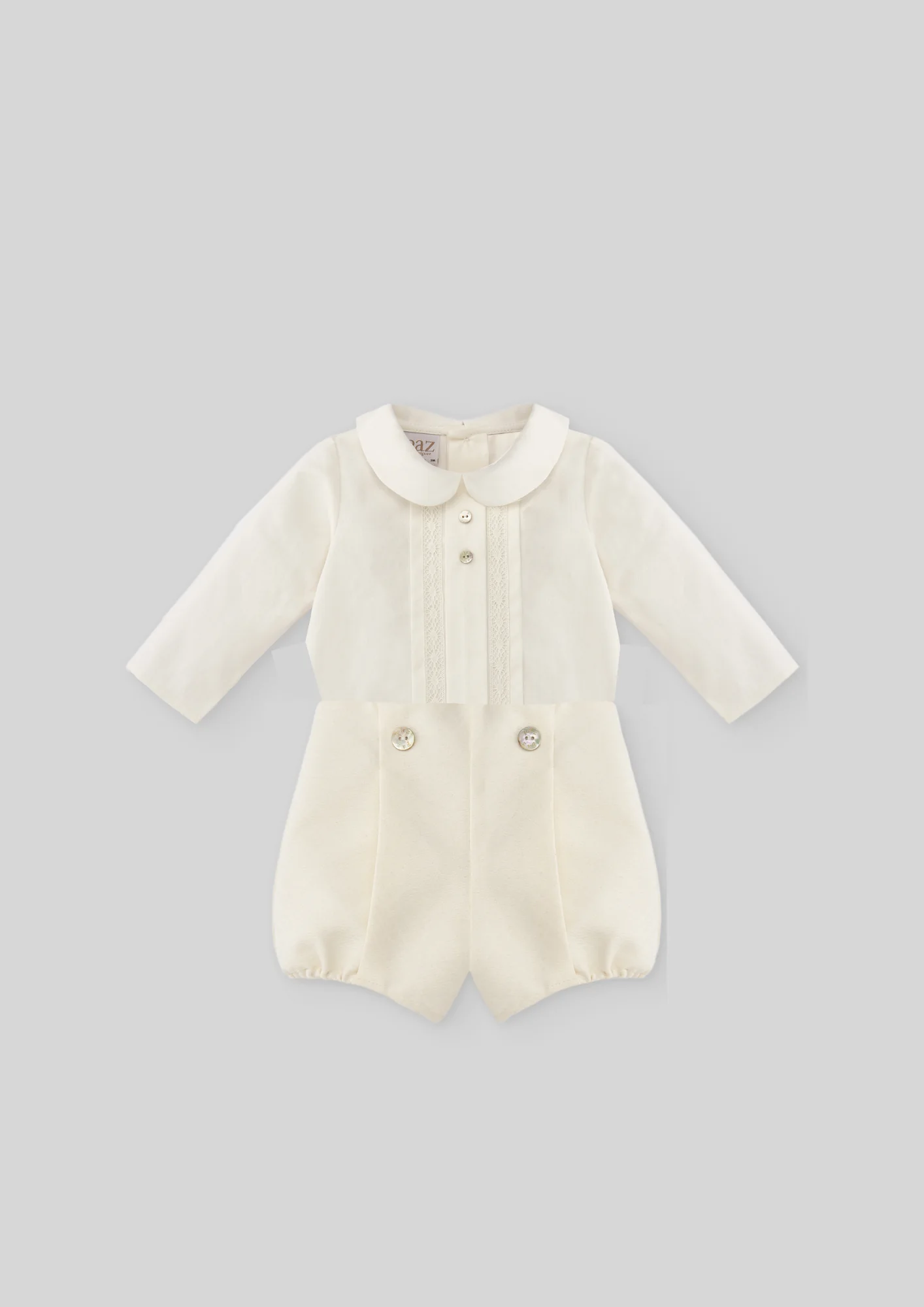 ¡Divino y elegante conjunto de shorts con camisa a juego! ¡Pensado especialmente para ocasiones especiales! Camisa con cuello camisero redondo, manga larga, botones de nácar en la parte delantera que se adhieren a los pantalones cortos para un acabado limpio. Con cierre de botones por atrás para facilitar su puesta. Pantalones cortos con elastico en pierna y cintura para mayor comodidad.
